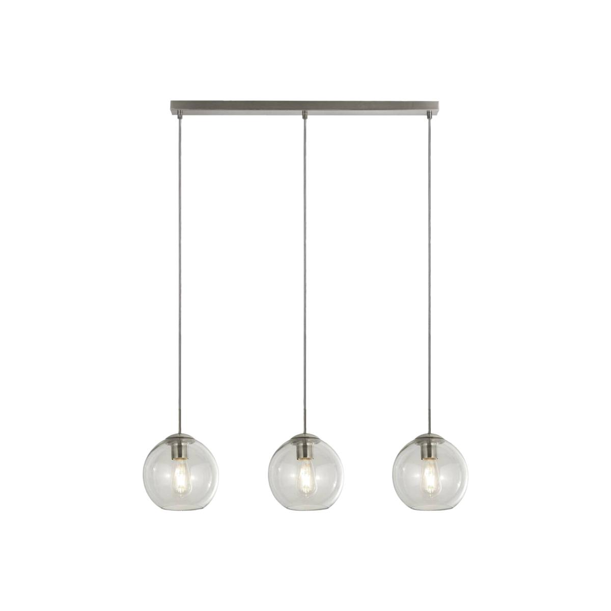 Revamp your living space with our 3 light bar pendant in a satin silver finish and clear glass shades. The glass ball shades make this a distinctive product to hang in your kitchen area whether it's above a kitchen island or a dining room table.