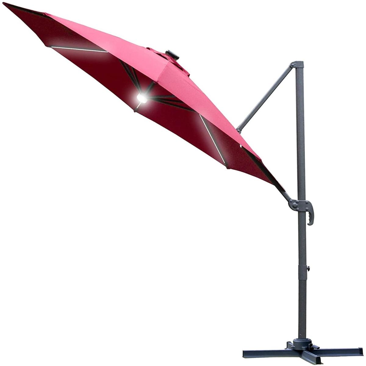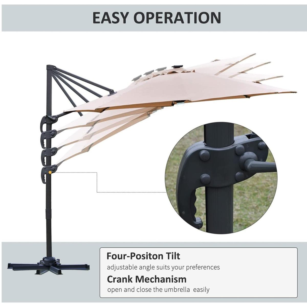Sun safety in the day and beautiful illumination at night. Welcome this cantilever parasol from Outsunny into your home to transform your garden memories. There are LED lights scattered on the support ribs, controlled by a switch: you can radiate your outdoors at night. The large polyester canopy can be adjusted to four different angles and swivels 360 so you can keep protected from the sun at practically any angle. The aluminium structure is sturdy and durable and it's fitted with a crank handle to open and close the canopy easily. Comes with a cross base weights are required.