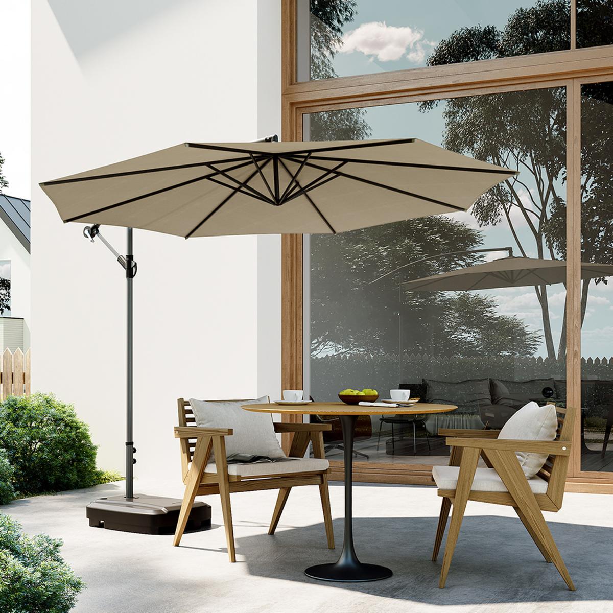 This Cantilever Parasol is perfect for enjoying more time in your garden. Its waterproof and UV-resistant shade provides protection from rain and sun, keeping you cool and dry. The parasol features a durable, portable base with two wheels for easy transportation and enhanced stability. 3 Meter Cantilever Parasol and Fillable Base with Wheels - Khaki