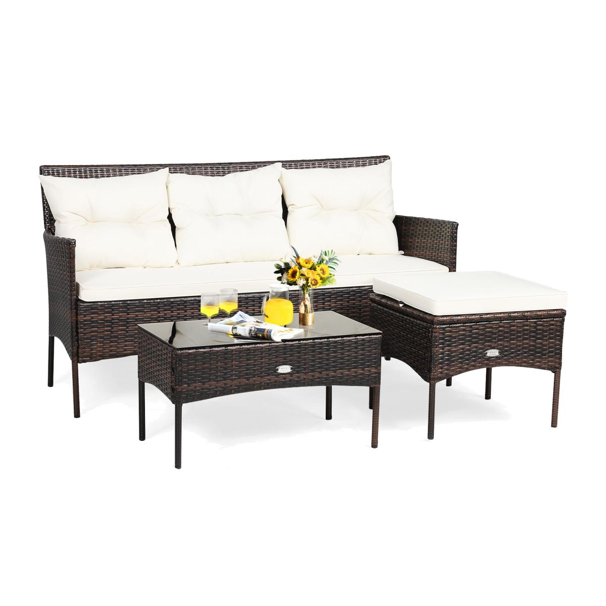 Premium rattan material featuring sunlight and fading resistance enables the furniture set to serve you for a long time. Cushions with a zippered design allow you to easily remove the cover and wash it. And a high-density sponge offers you a comfortable sitting experience. It will be a great patio set for you and your friends to communicate with each other outdoors. 3 PCS Garden Patio Conversation Set - White