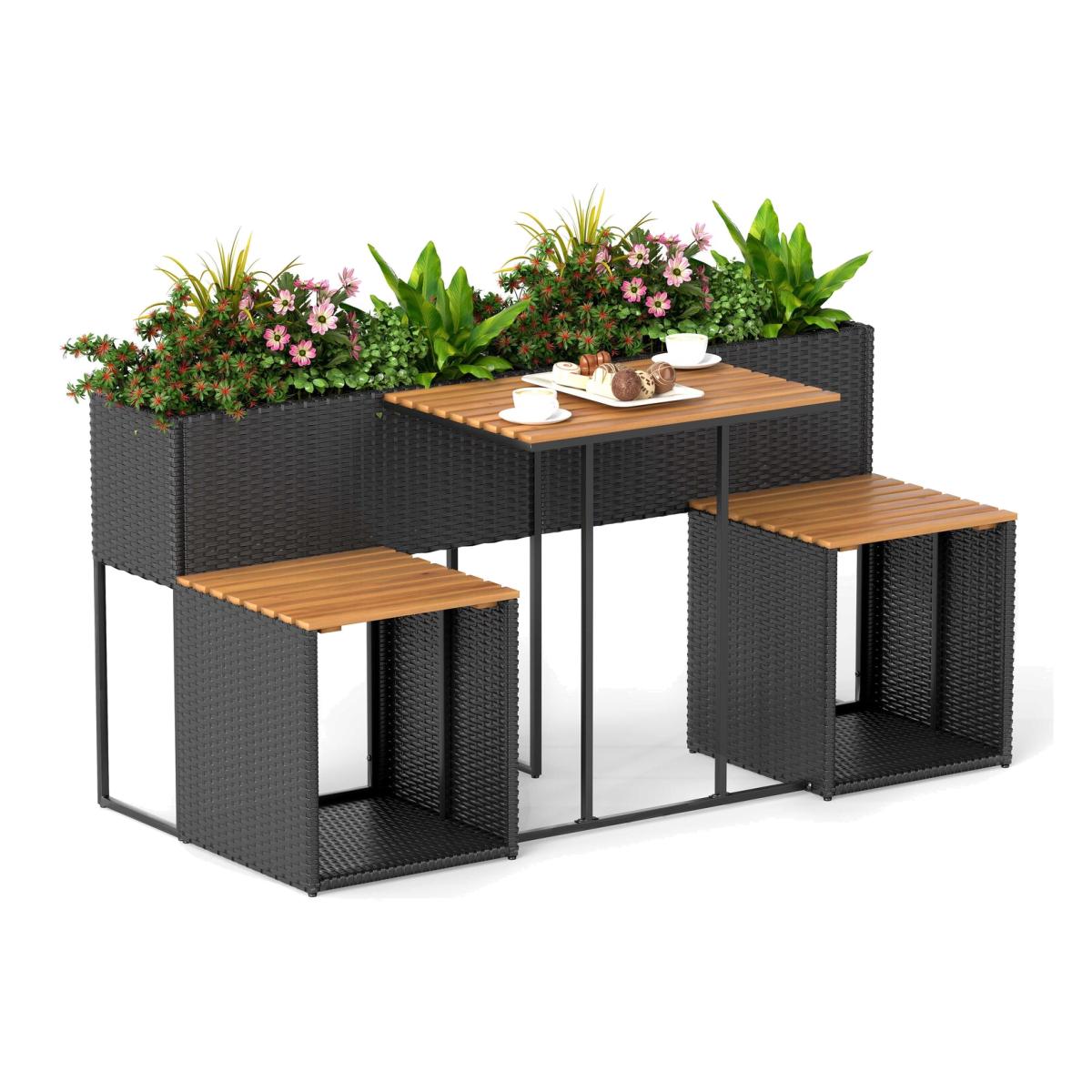 Elevate your outdoor space with our garden planter table with chairs set! Constructed with premium PE rattan and acacia wood, paired with a robust metal frame, this patio conversation set is designed to withstand the test of time. The raised garden bed allows for easy cultivation without straining your back, with a slatted bottom for optimal plant growth. The built-in table and two chairs provide a cozy seating arrangement for your outdoor gatherings, complete with convenient storage compartments in the chairs for outdoor essentials.