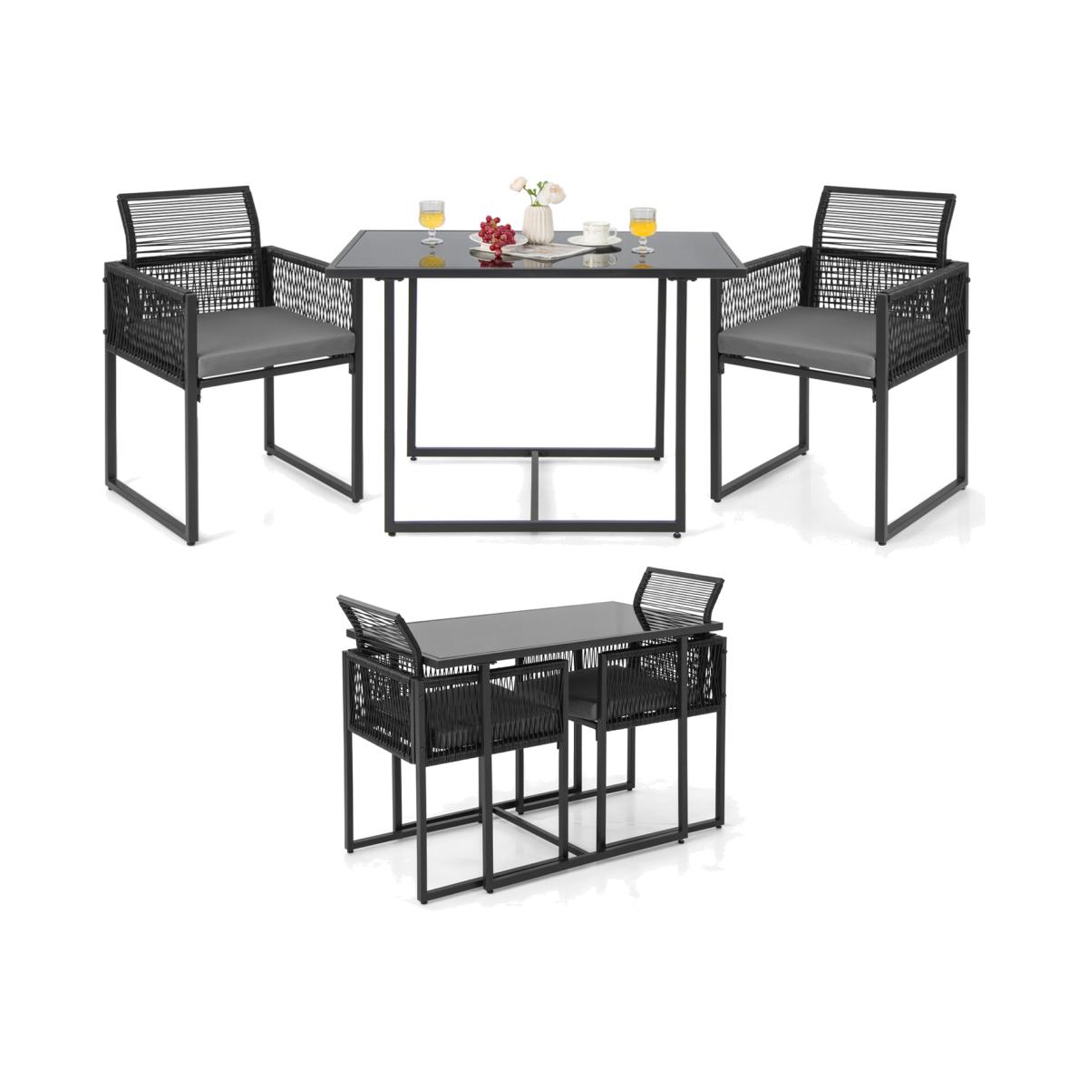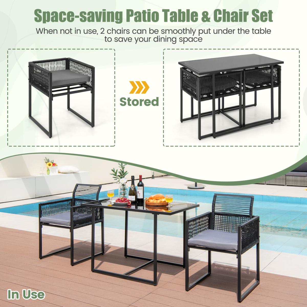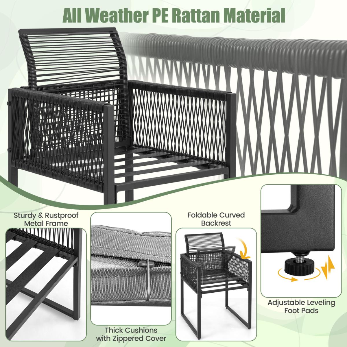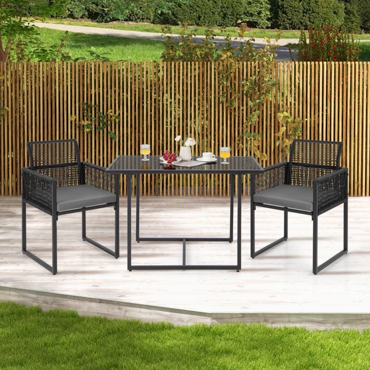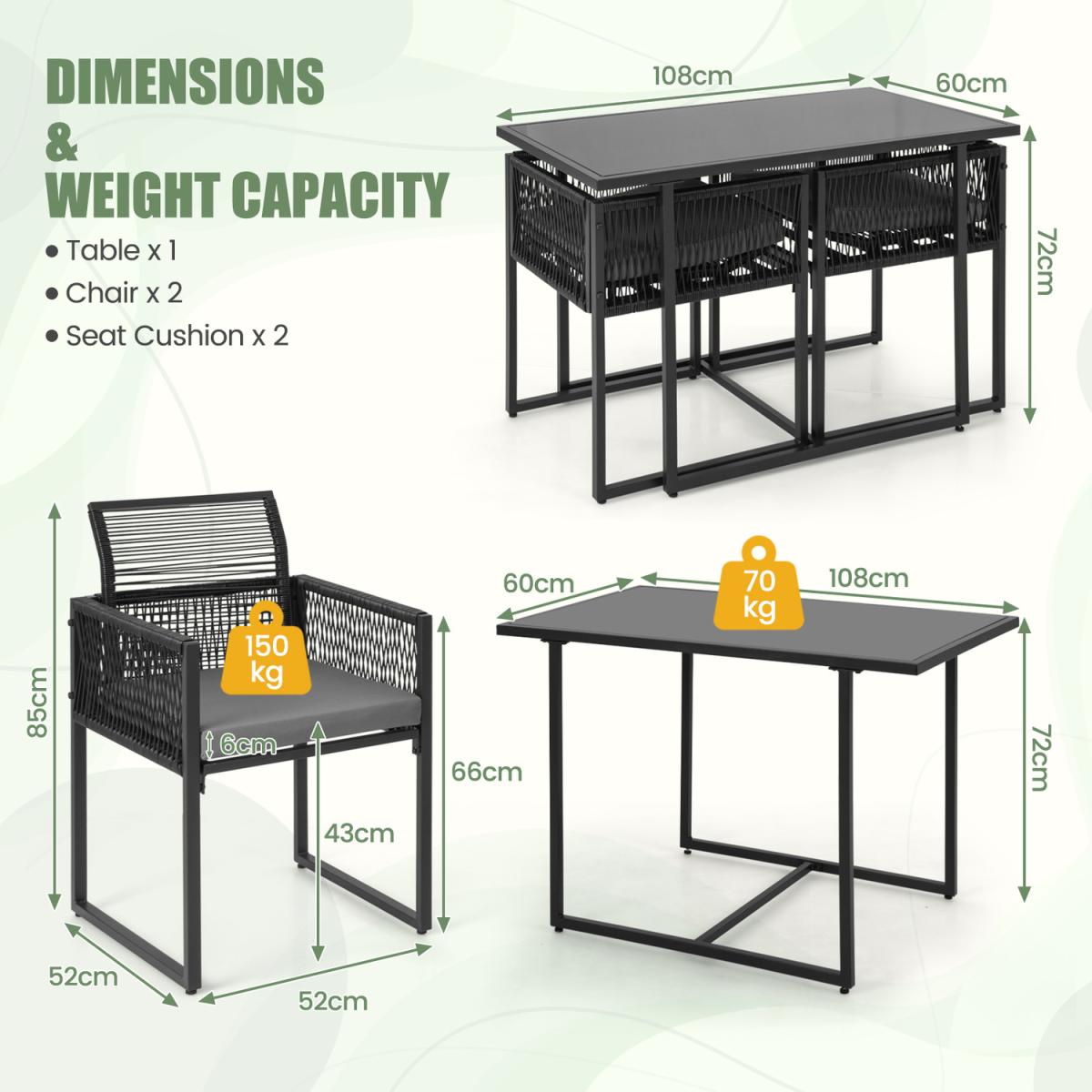 This 3-piece patio dining set allows you to enjoy meal time outdoors. The 108cm spacious tempered glass table offers ample space to place food and drinks. And the 2 chairs with soft cushions make you and your partners much more relaxed. Moreover, the chairs and table are quite sturdy with the heavy-duty metal frame. The adjustable footpads make them stand more stably. Space-saving design is one of the highlights, too. You can push the chairs with folded backrest under the table to save much space. Comfortable, elegant, space-saving, this patio wicker dining set will meet all your demands.