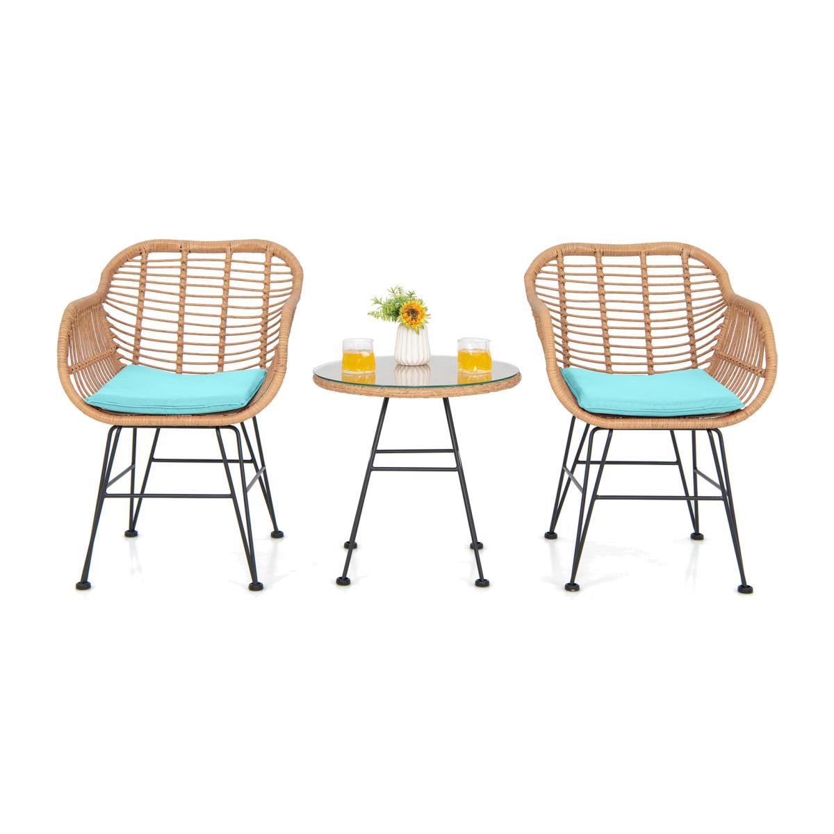 With a stylish appearance, this PE rattan chair and table set will be a good addition to your backyard, patio, balcony and so on. The weather-resistant PE rattan can stand the test of time, so that you can use it for years without worrying about deformation. The removable covers are easy to clean. The tempered glass tabletop offers ample space for your books and drinks. 3 Pcs Outdoor Patio Table Chair Set - Blue