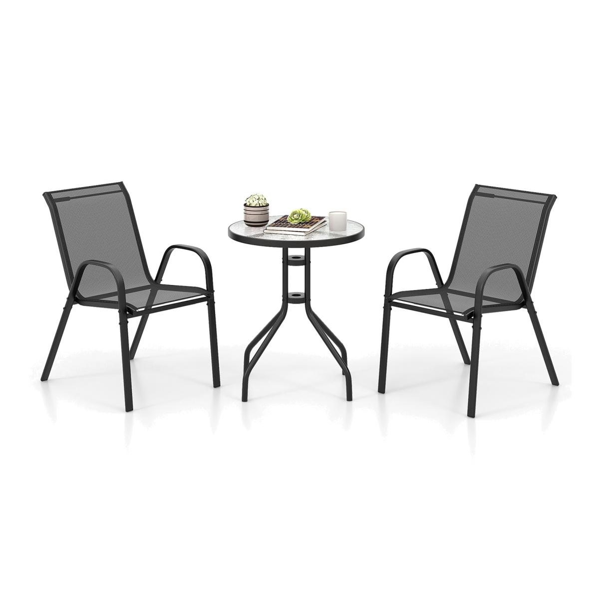 Enjoy comfortable sitting with the patio bistro set featuring ergonomic backrests and quick-drying, breathable, and skin-friendly fabric. The sturdy metal frames and elegant tempered glass tabletop offer durability and easy maintenance. This conversation furniture set includes stackable chairs for compact storage and can support up to 150 kg per chair and 50 kg on the table. 3 Pcs Patio Bistro Set - Black