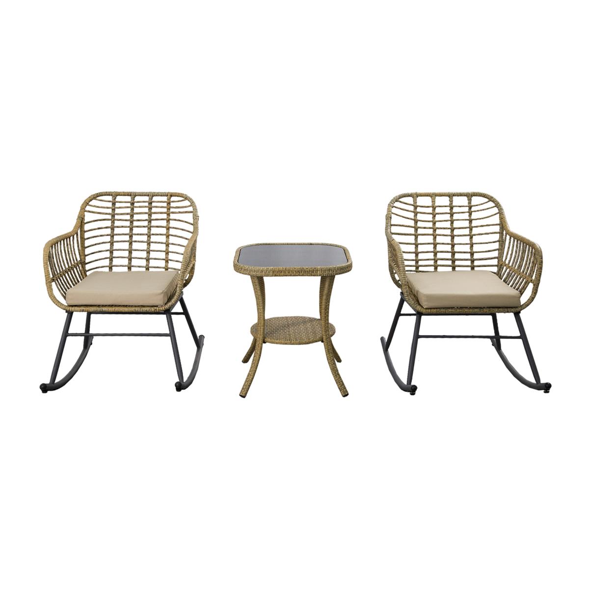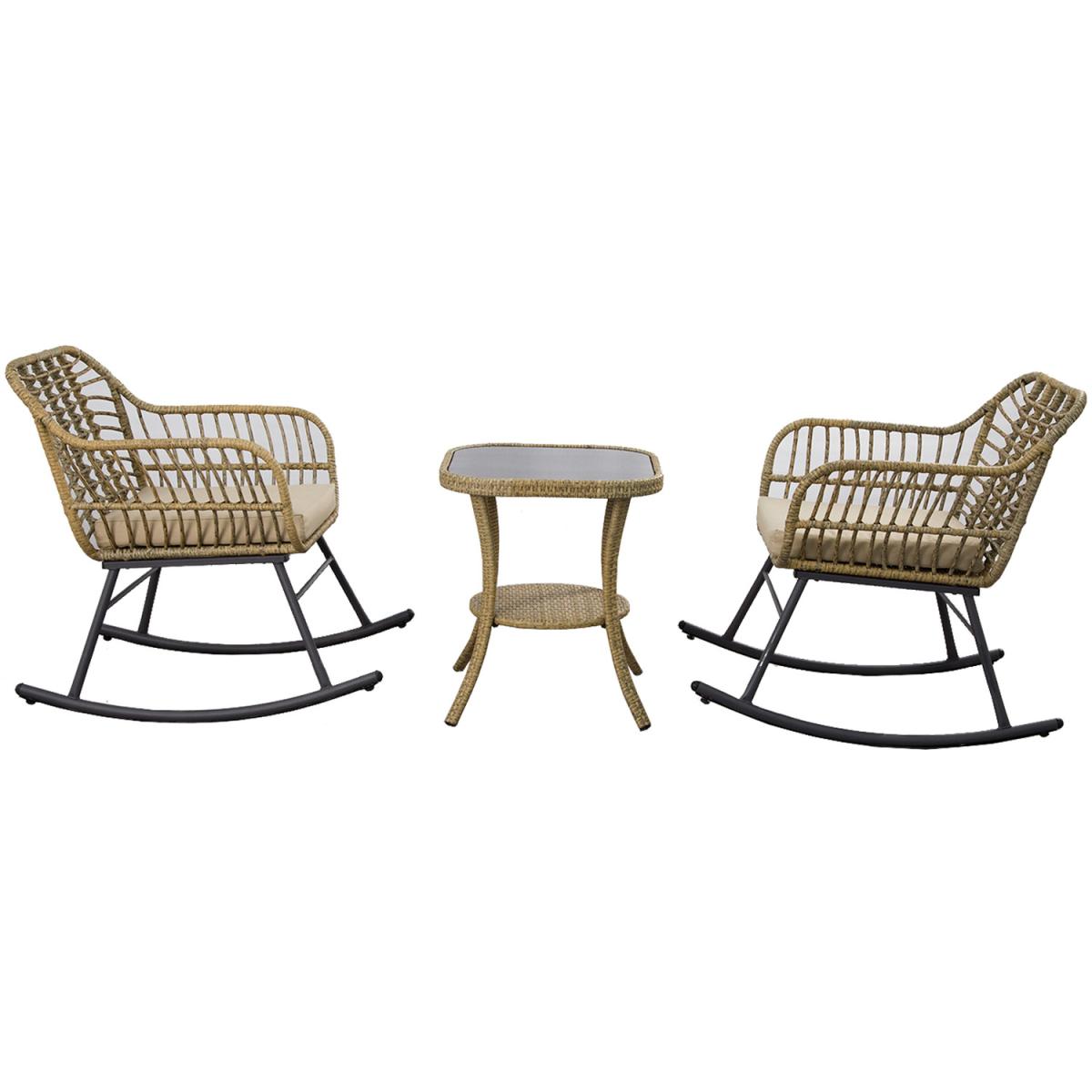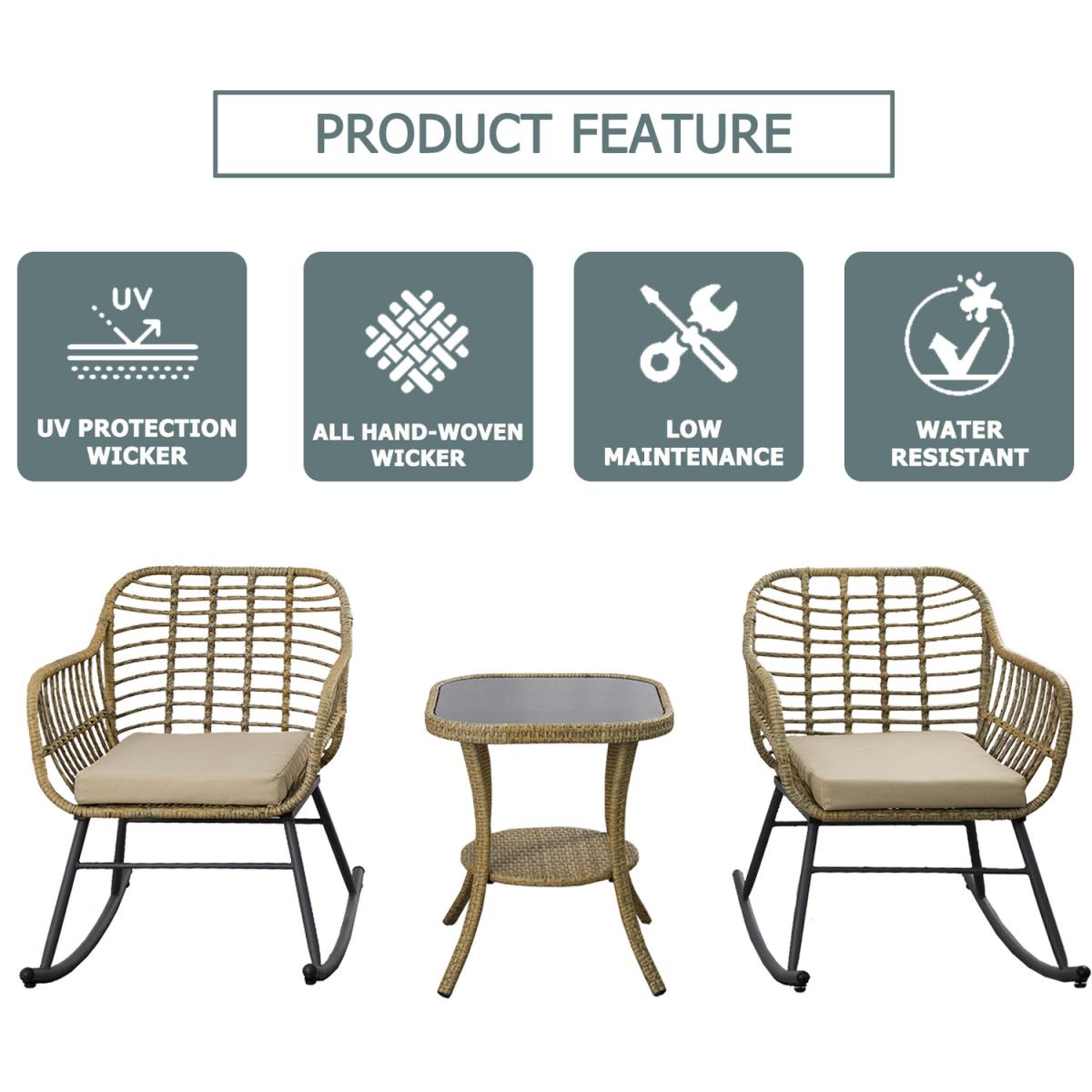 Get your patio ready for summer with our 3 Piece Patio Wicker Rocking Chair Set. Its natural color and trendy design easily blend in with any environment, making it a perfect finishing touch to your outdoor space. Each piece sits on a sturdy steel frame that resist weather and last for years. Soft cushions are wrapped in water-resistant fabric that also stands up to UV fading. Slanted back and curved arms hug a seat you won't want to leave. The chair set completes with a side table, so you can sit with your friend or family around this table to chat and enjoy a cup of coffee.