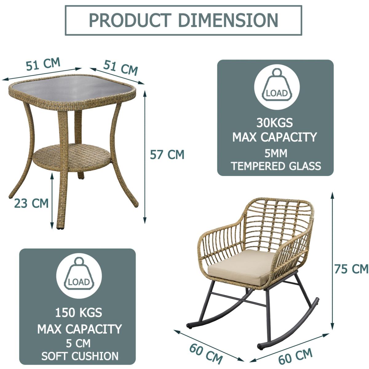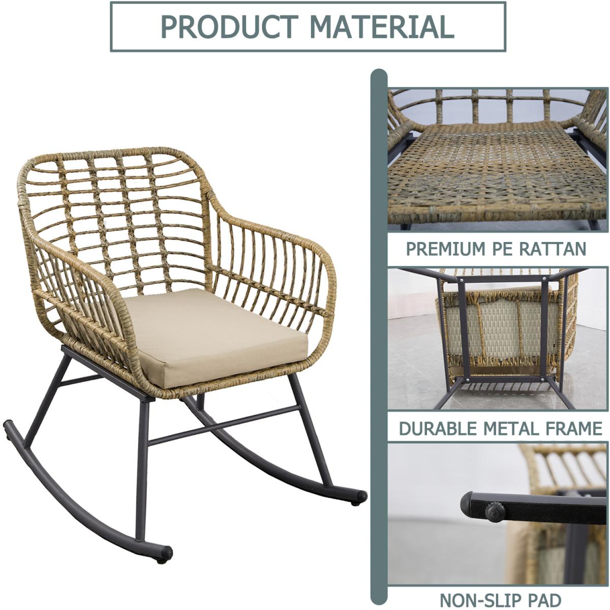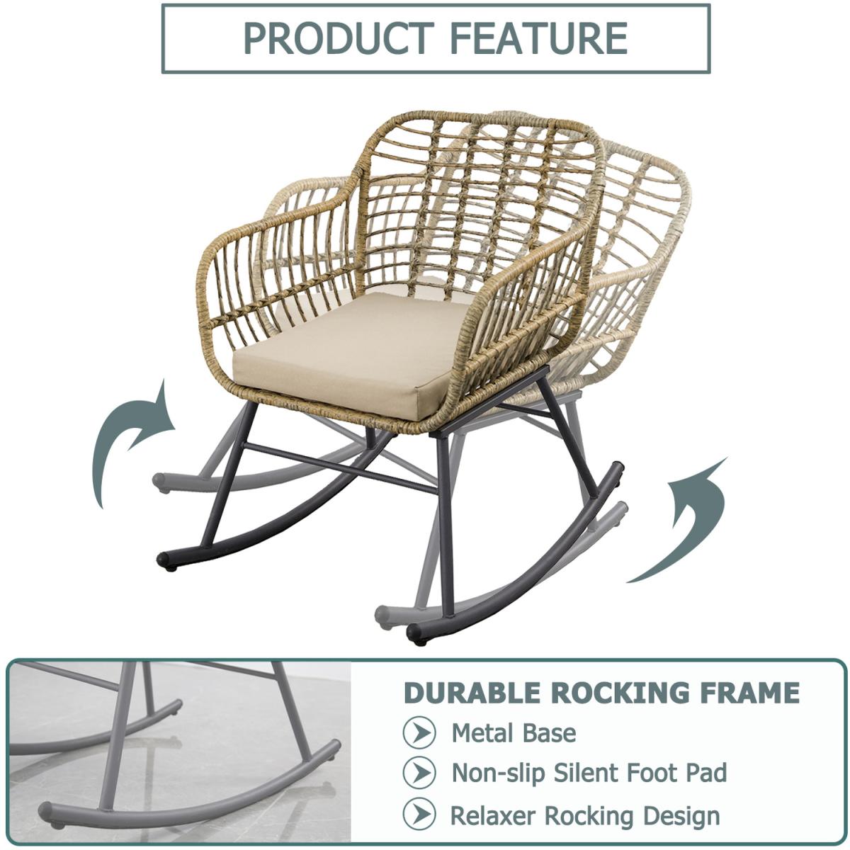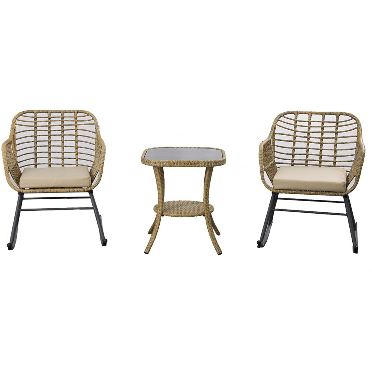 Get your patio ready for summer with our 3 Piece Patio Wicker Rocking Chair Set. Its natural color and trendy design easily blend in with any environment, making it a perfect finishing touch to your outdoor space. Each piece sits on a sturdy steel frame that resist weather and last for years. Soft cushions are wrapped in water-resistant fabric that also stands up to UV fading. Slanted back and curved arms hug a seat you won't want to leave. The chair set completes with a side table, so you can sit with your friend or family around this table to chat and enjoy a cup of coffee.