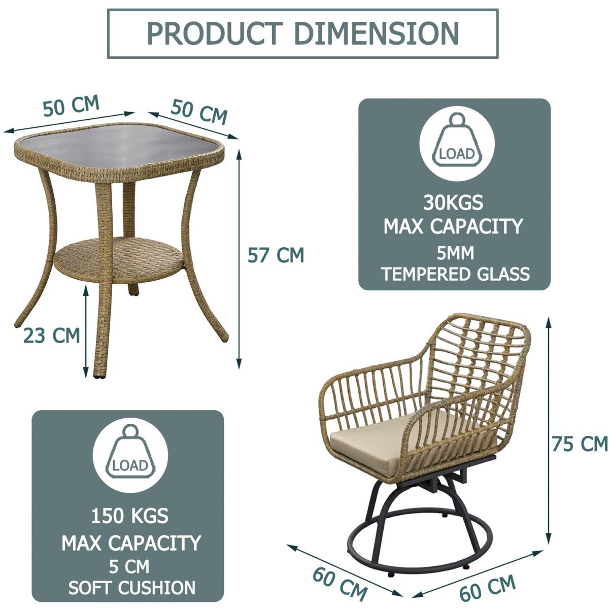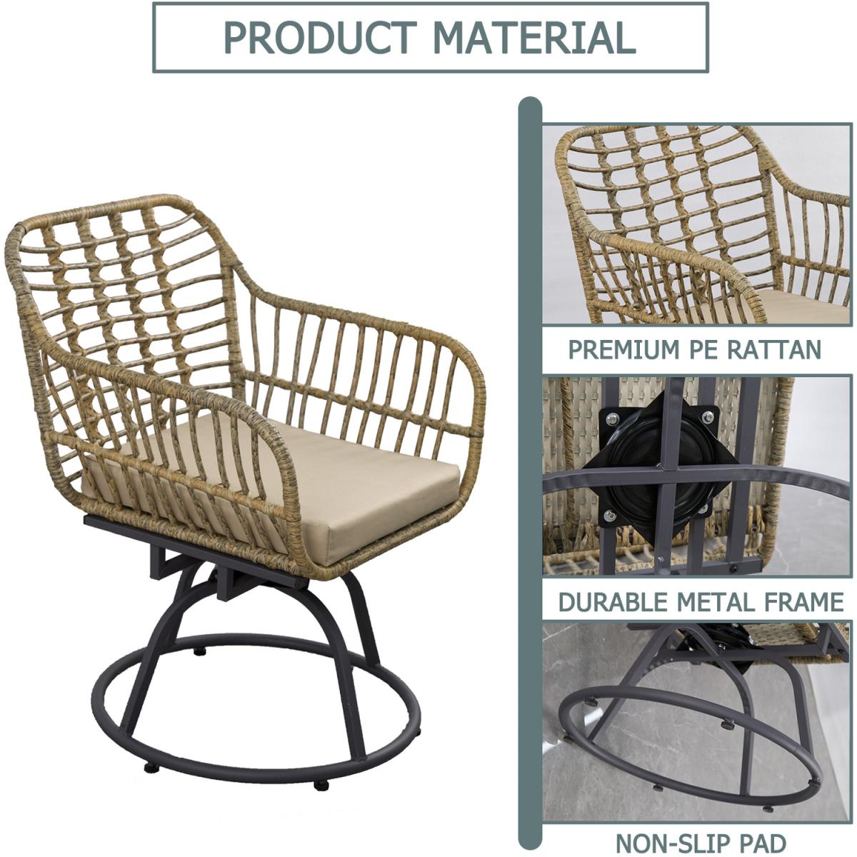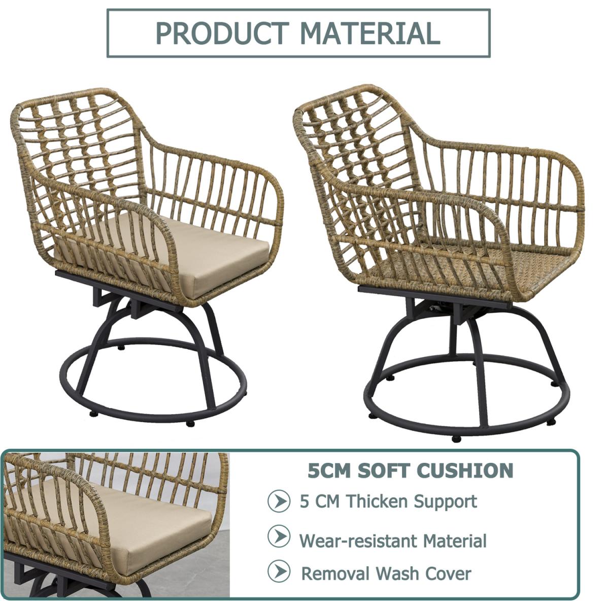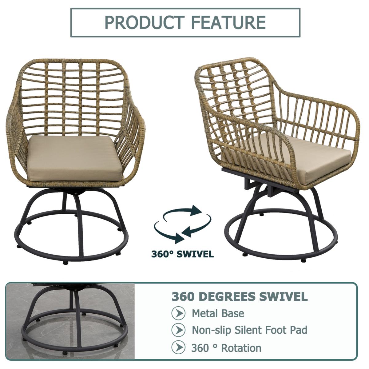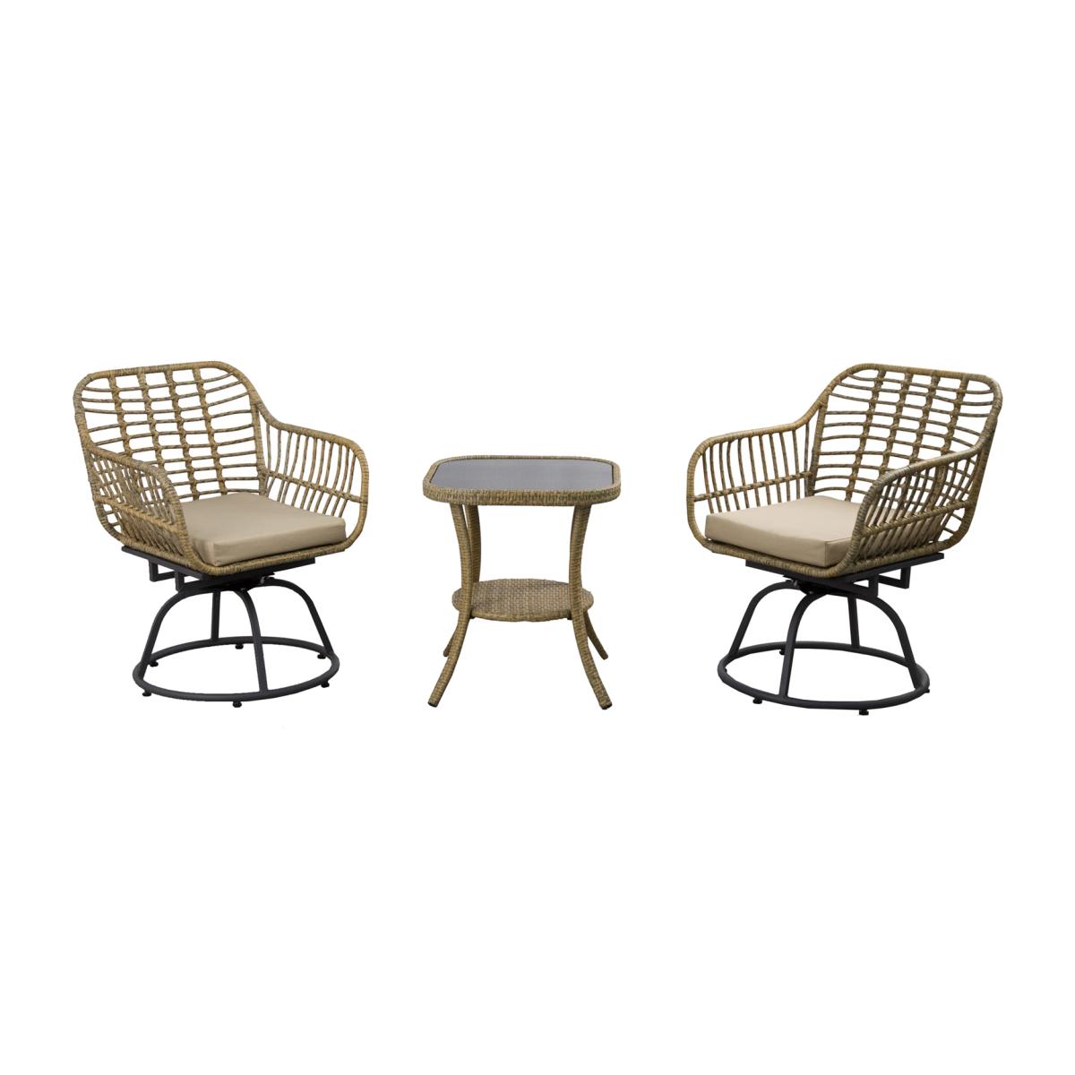 Get your patio ready for summer with our 3 Piece Patio Wicker Swivel Chair Set. Its natural color and trendy design easily blend in with any environment, making it a perfect finishing touch to your outdoor space. Each piece sits on a sturdy steel frame that resist weather and last for years. Soft cushions are wrapped in water-resistant fabric that also stands up to UV fading. Slanted back and curved arms hug a seat you won't want to leave. The chair set completes with a side table, so you can sit with your friend or family around this table to chat and enjoy a cup of coffee.