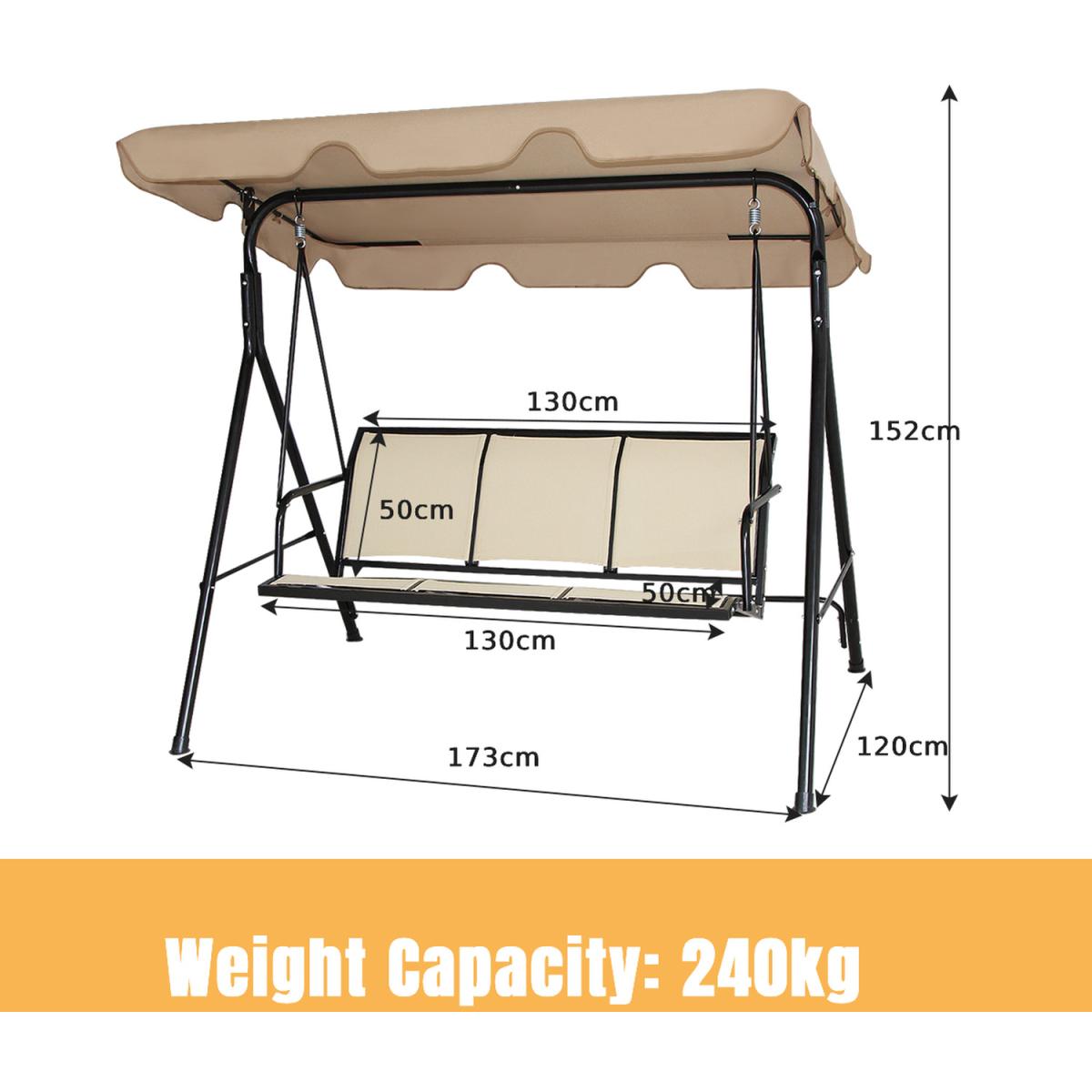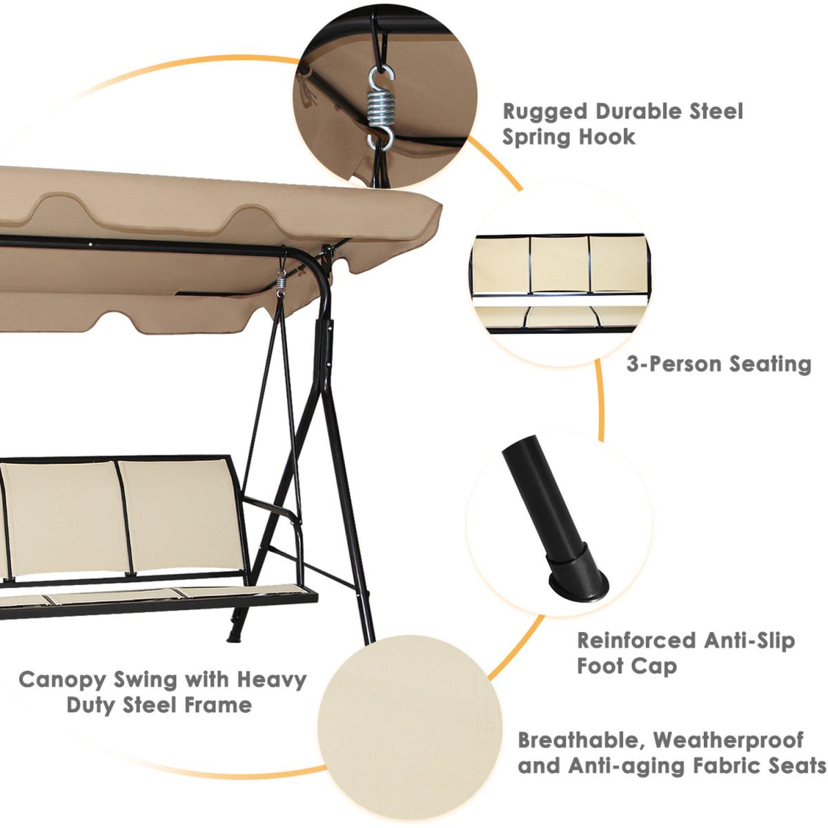 Our 3-person sunshade swing will be an excellent addition to any outdoor living space, such as garden, yard, balcony and poolside. The 3-seat swing with breathable and durable seats is perfect for you to enjoy a whole afternoon with your friends and family. What is more, composed of solid steel frame and durable polyester canopy, the whole set is sturdy and durable. Equipped with a detachable and adjustable canopy, this swing can be adjusted easily to block out sunlight in different directions, which will protect you from dazzling sunlight and drizzle. The gentle swinging seat will expel your fatigue and provide you with immeasurable enjoyment.