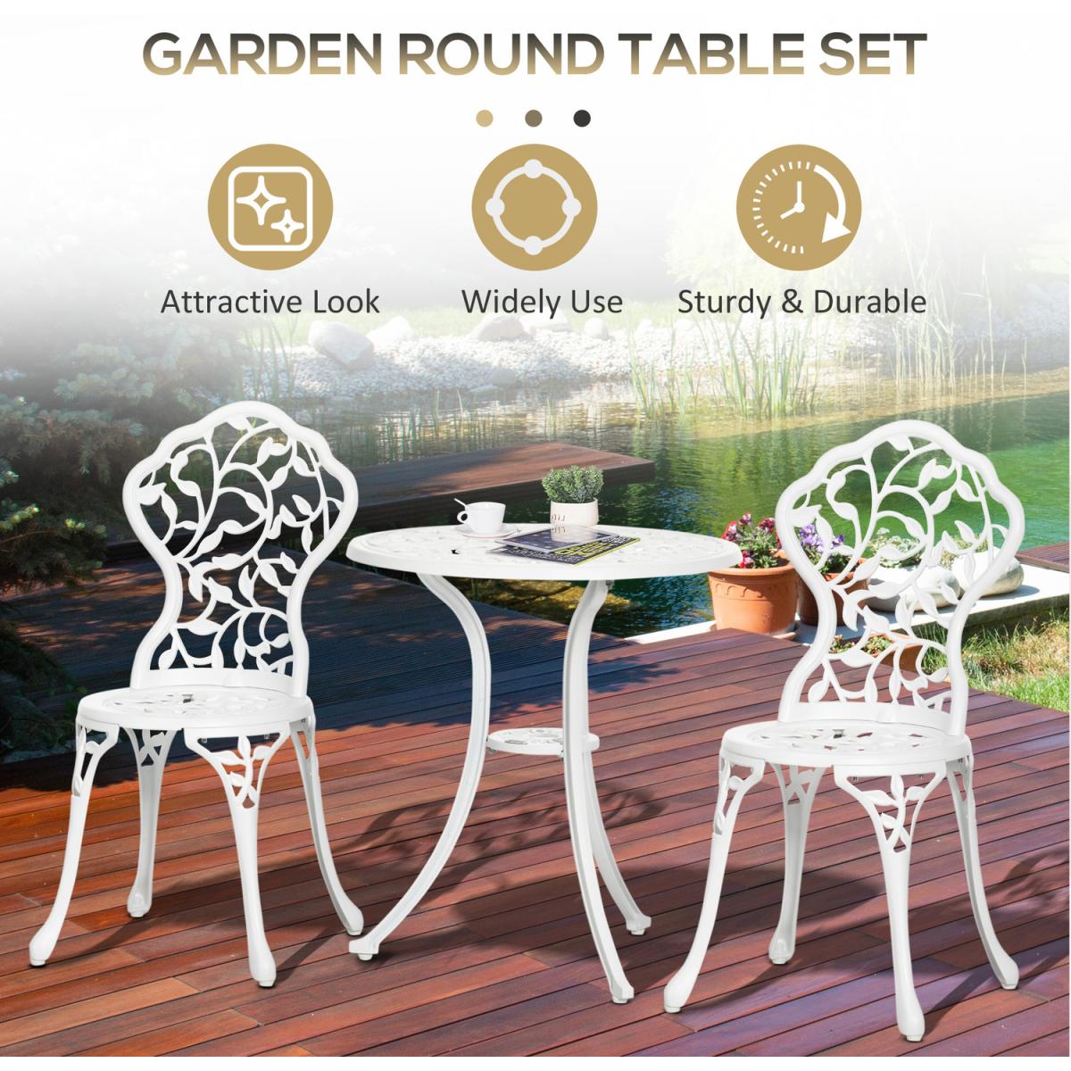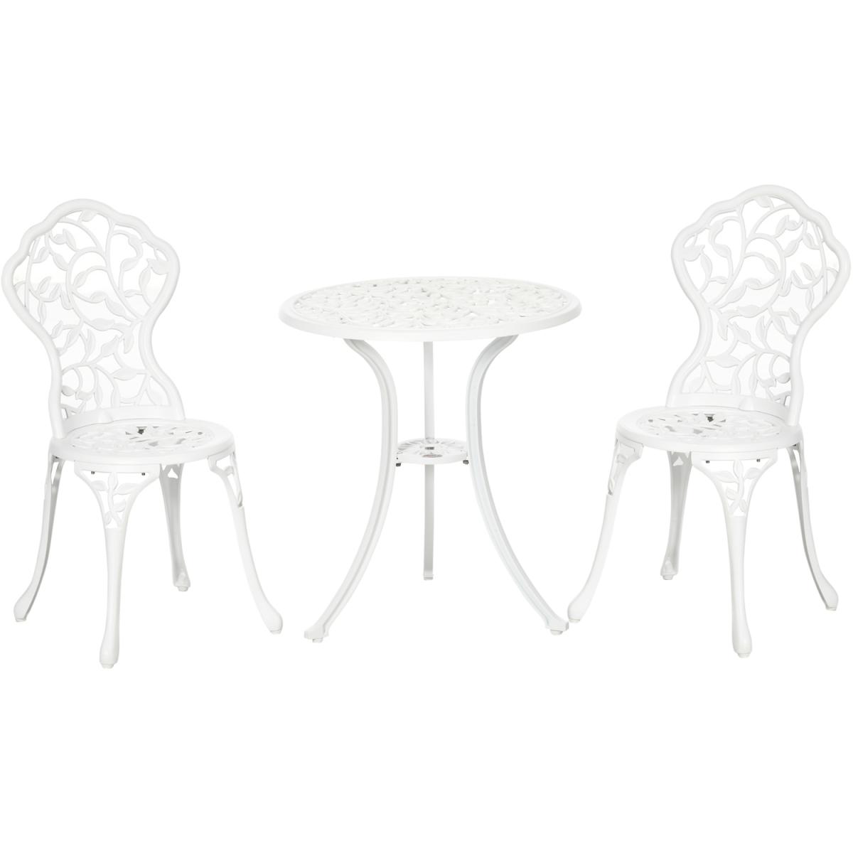 This Outsunny outdoor bistro set is for practically every outdoor space. The cut-out leaf design is pretty and elegant. Made from aluminium, the frames are strong, supportive you when you sit and relax. The metal is also resistant to peeling and corrosion for prolonged wear. Two chairs and a table mean you can gather round with company, wherever you choose to.