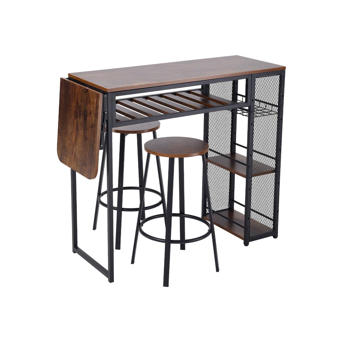This sleek 3-piece bar table set comprising a table and two stools is thoughtfully crafted for contemporary living. Blending a vintage-inspired wood finish with a sturdy black metal frame, it adds a touch of industrial charm to kitchens, dining spaces, home offices or cosy corners, perfect for enjoying a relaxed drink or chat with friends. Each stool includes a circular footrest for added comfort during longer sittings. Designed with practicality in mind, the stools neatly slot beneath the table when not in use, making it ideal for compact homes or rental flats. More than just a bar set, it doubles as a dining table or small workspace. A stylish and versatile addition that perfectly balances design and everyday function.