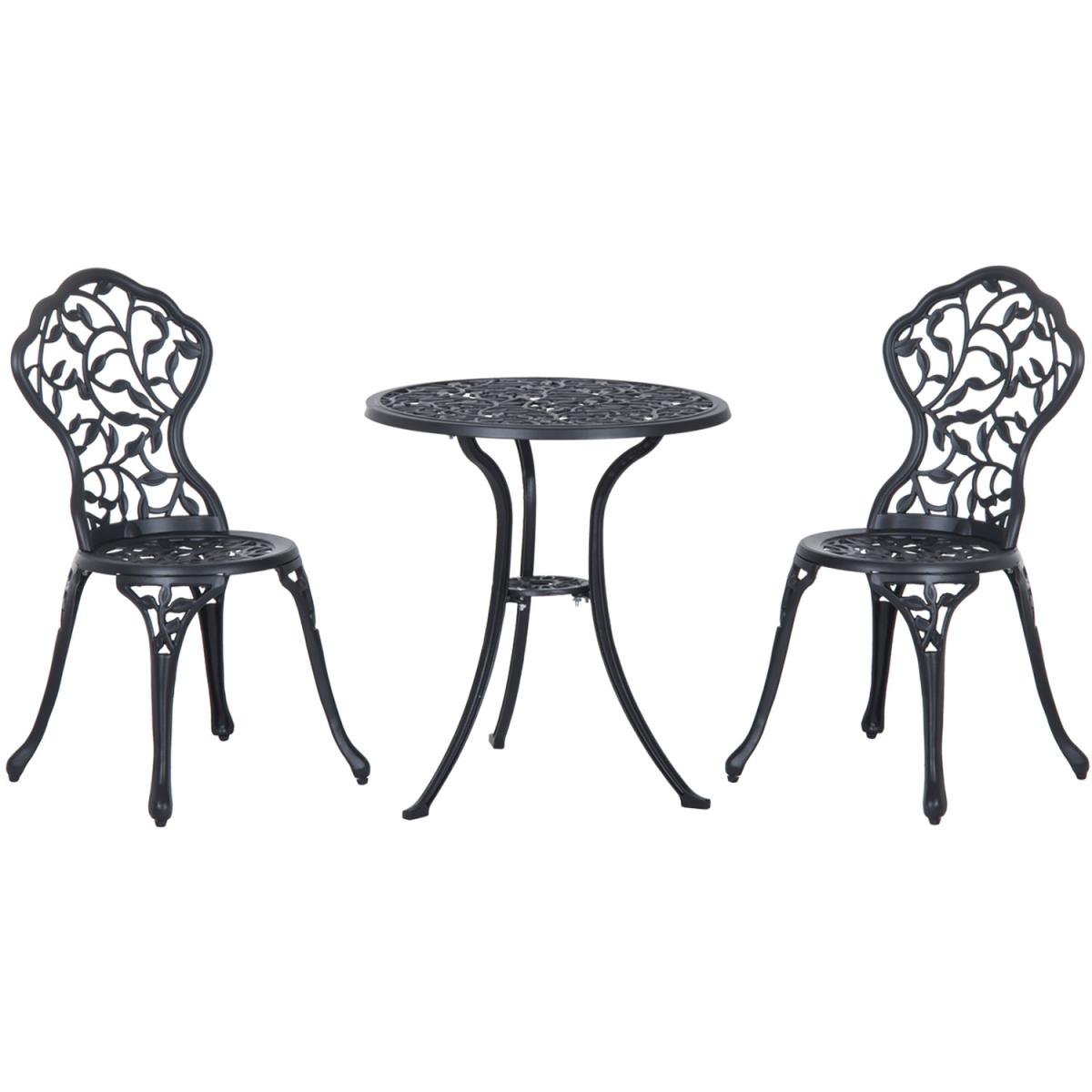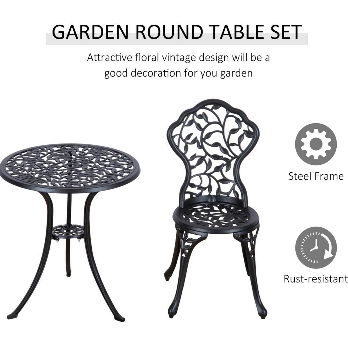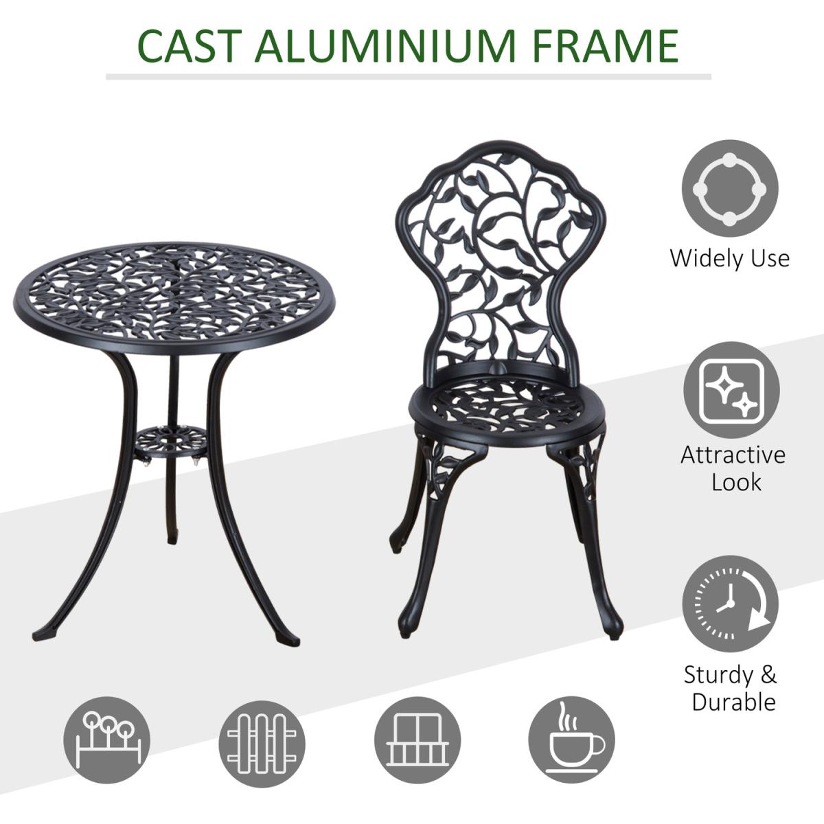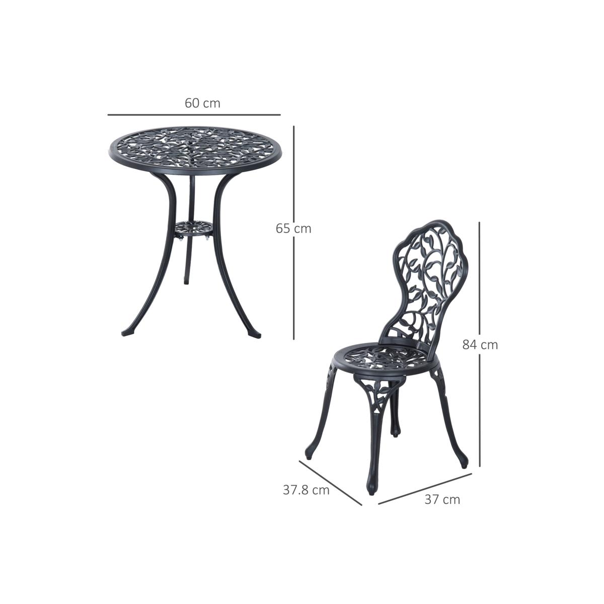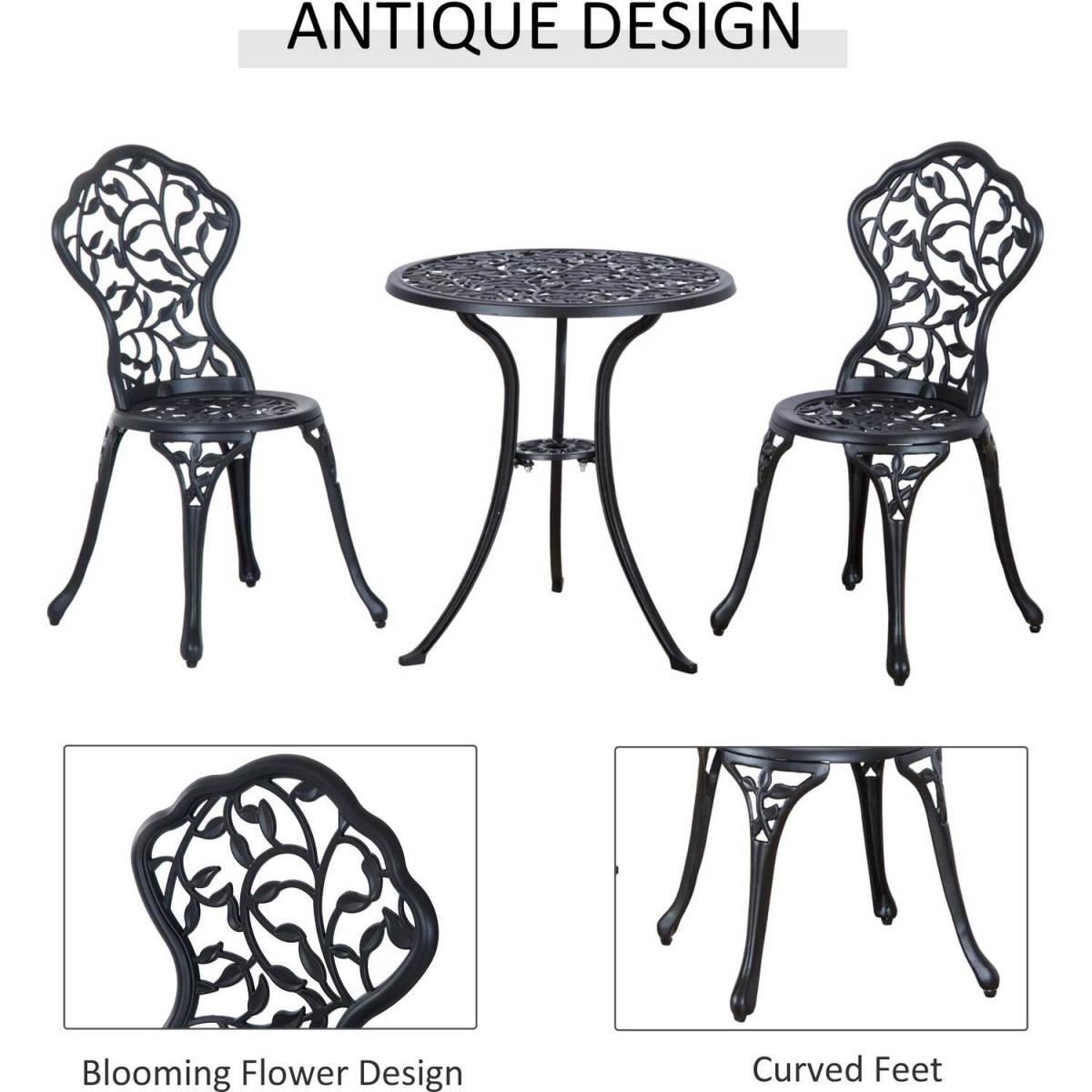 This Outsunny outdoor bistro set is a great addition to any garden or patio, made with cast aluminum, and finished with a leaf design. The set comes complete with two chairs and a table ideal for any garden. This set is designed with the ability to be also used in balconies and porches with limited space. A great inviting piece of furniture for any garden, patio and more.