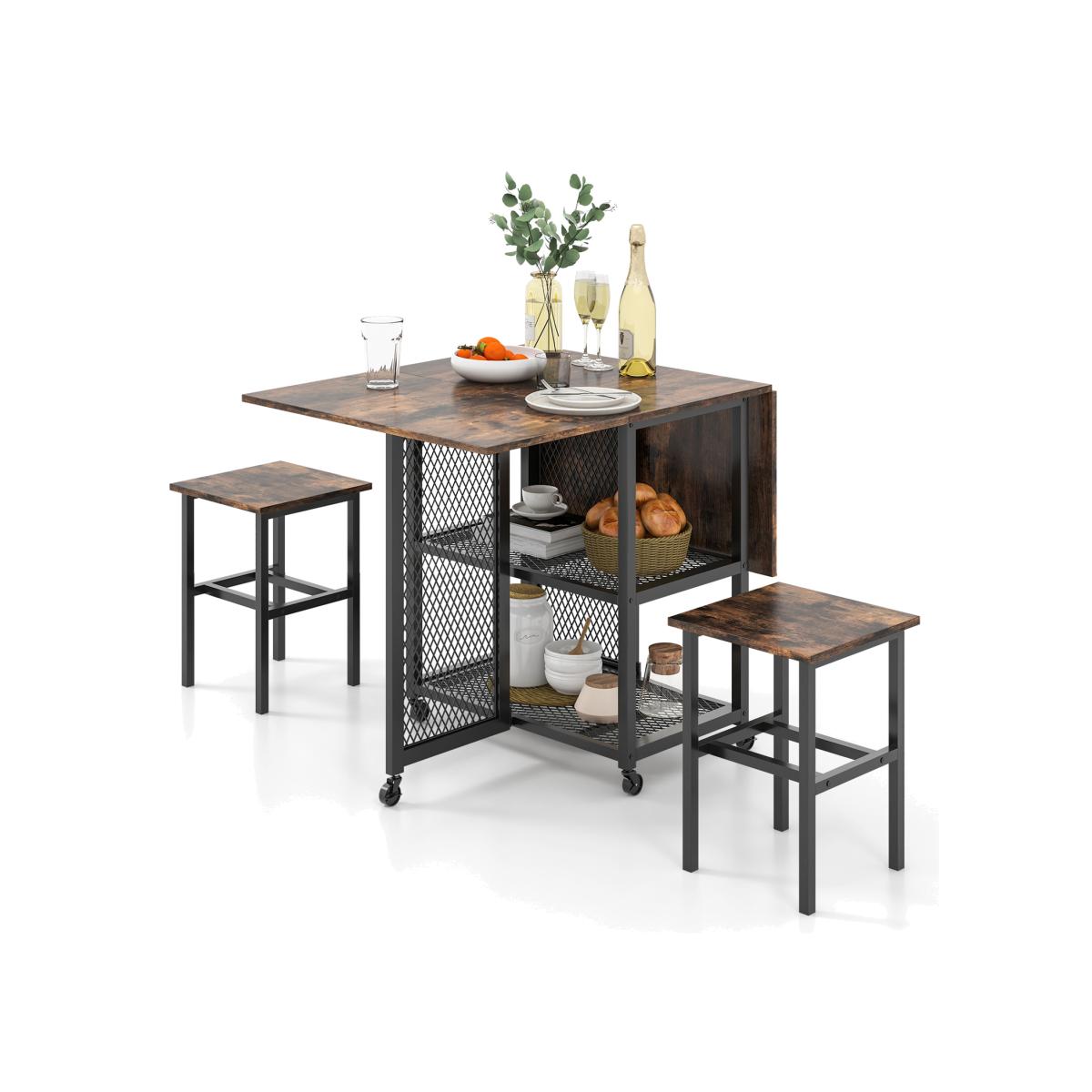 Our 3-piece dining table set includes a drop leaf expandable dining table and 2 stools, which can be a good addition for dining spaces or workplaces. Also, this set can be a space saver for small rooms or apartments. Thanks to the 6 swivel wheels, you can easily move the table wherever you need it. And 4 wheels are lockable, which could securely keep the table in place during use.