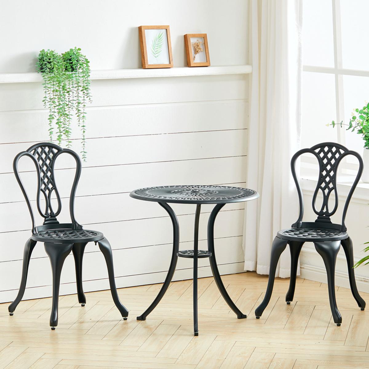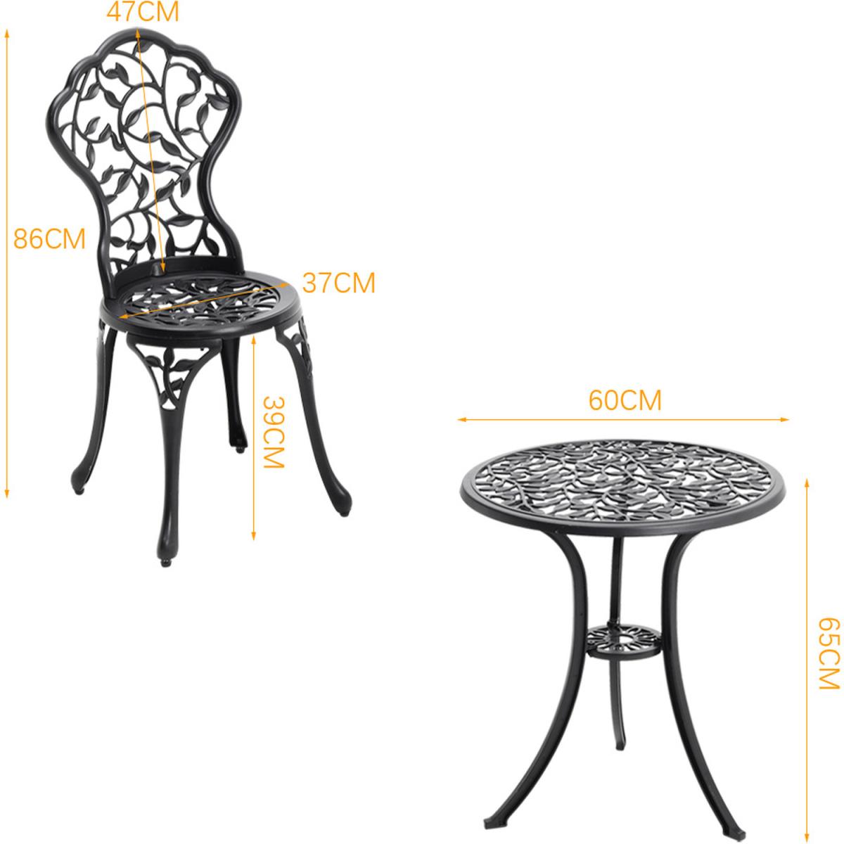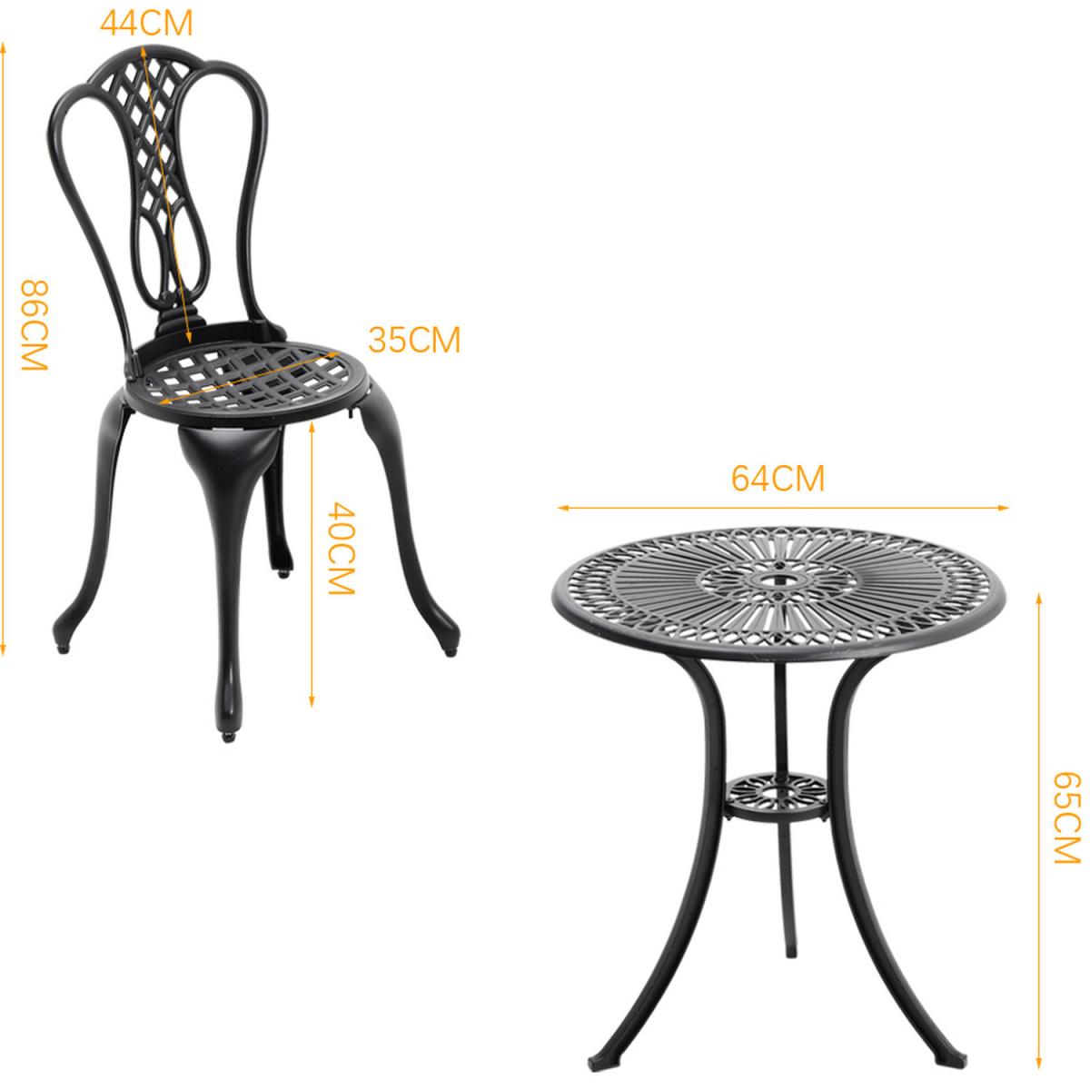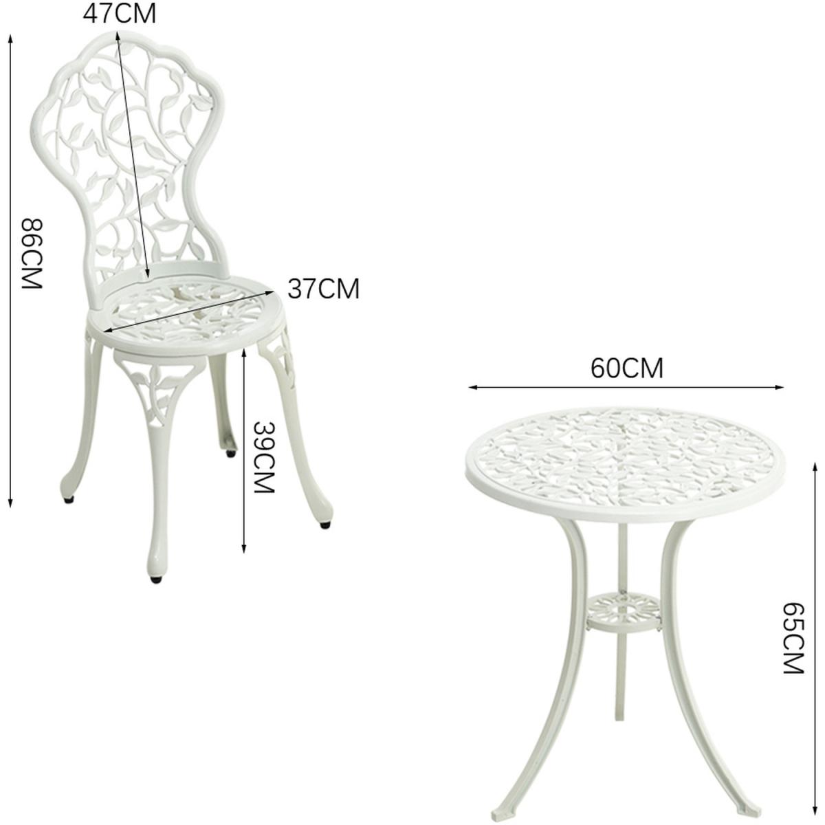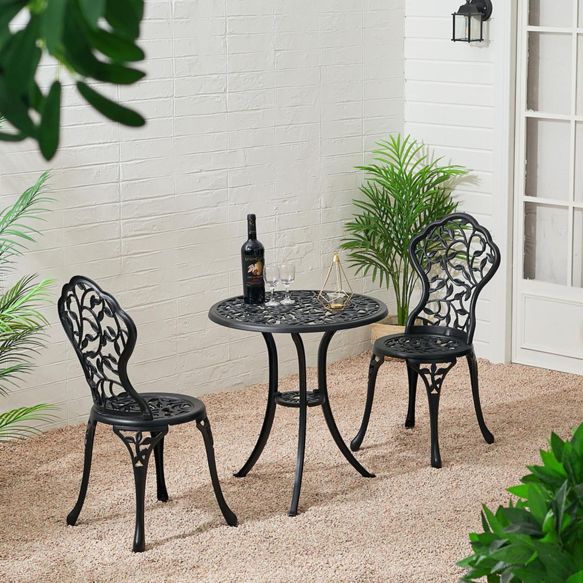 Durable cast aluminium structure which is rust free and weather-resistant, flower pattern of the table and chairs make this bistro outdoor table set look more retro, beautiful antique bistro table set which will be a great addition to garden and poolside. These two aluminium chairs are designed without an armrest, which provides you with more space for activities meanwhile taking up less storage space. Table with 45mm hole for an umbrella which can shade you when rainy day. This garden furniture set comes with extra plastic footpads, which can adapt more flexibly to ground conditions.