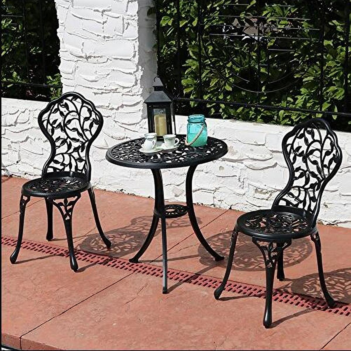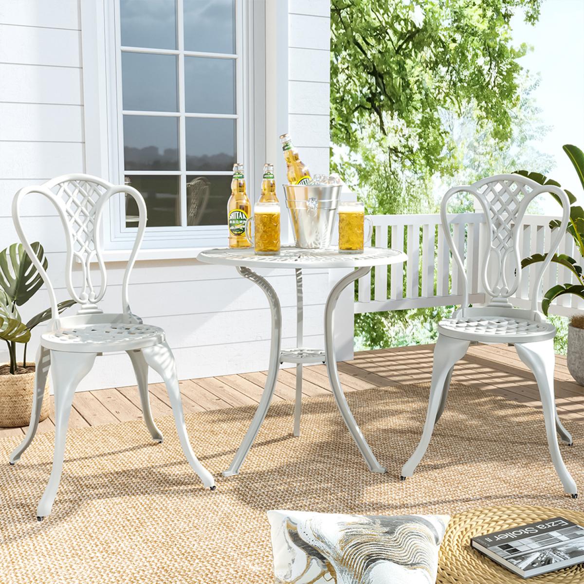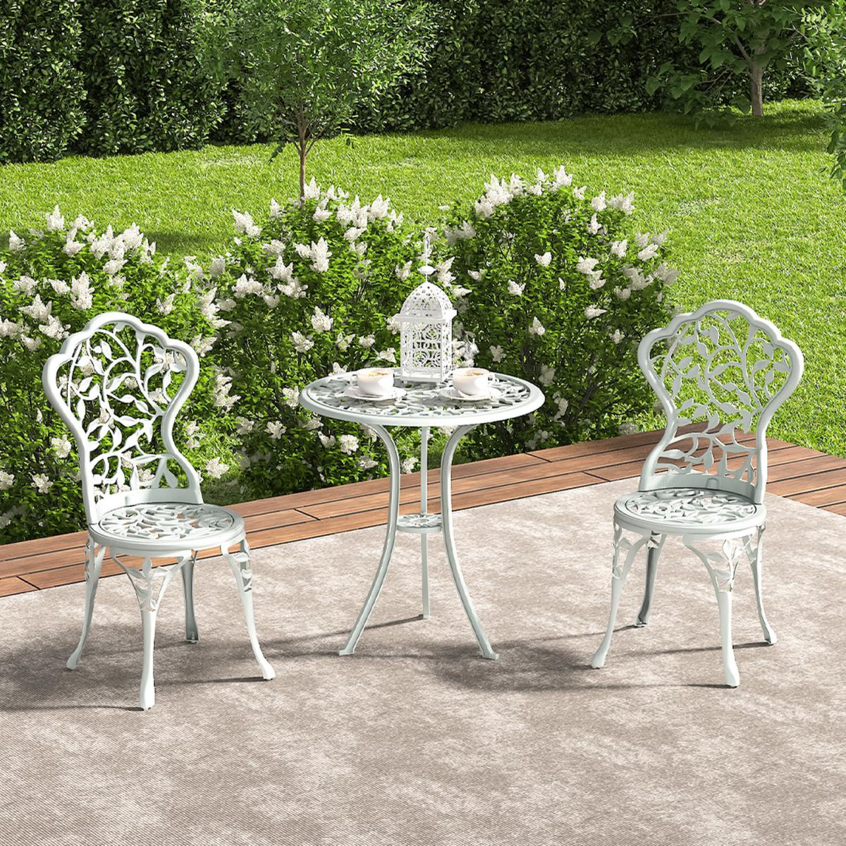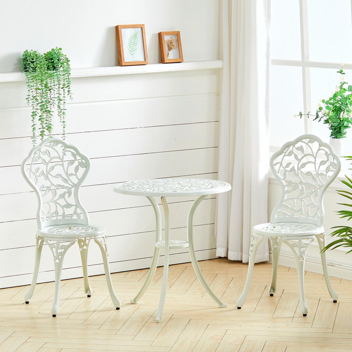 Durable cast aluminium structure which is rust free and weather-resistant, flower pattern of the table and chairs make this bistro outdoor table set look more retro, beautiful antique bistro table set which will be a great addition to garden and poolside. These two aluminium chairs are designed without an armrest, which provides you with more space for activities meanwhile taking up less storage space. Table with 45mm hole for an umbrella which can shade you when rainy day. This garden furniture set comes with extra plastic footpads, which can adapt more flexibly to ground conditions.