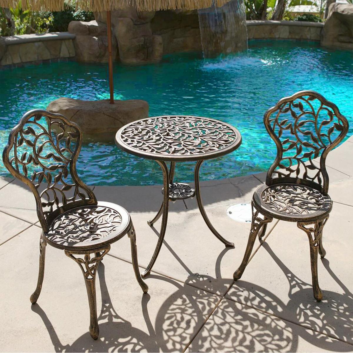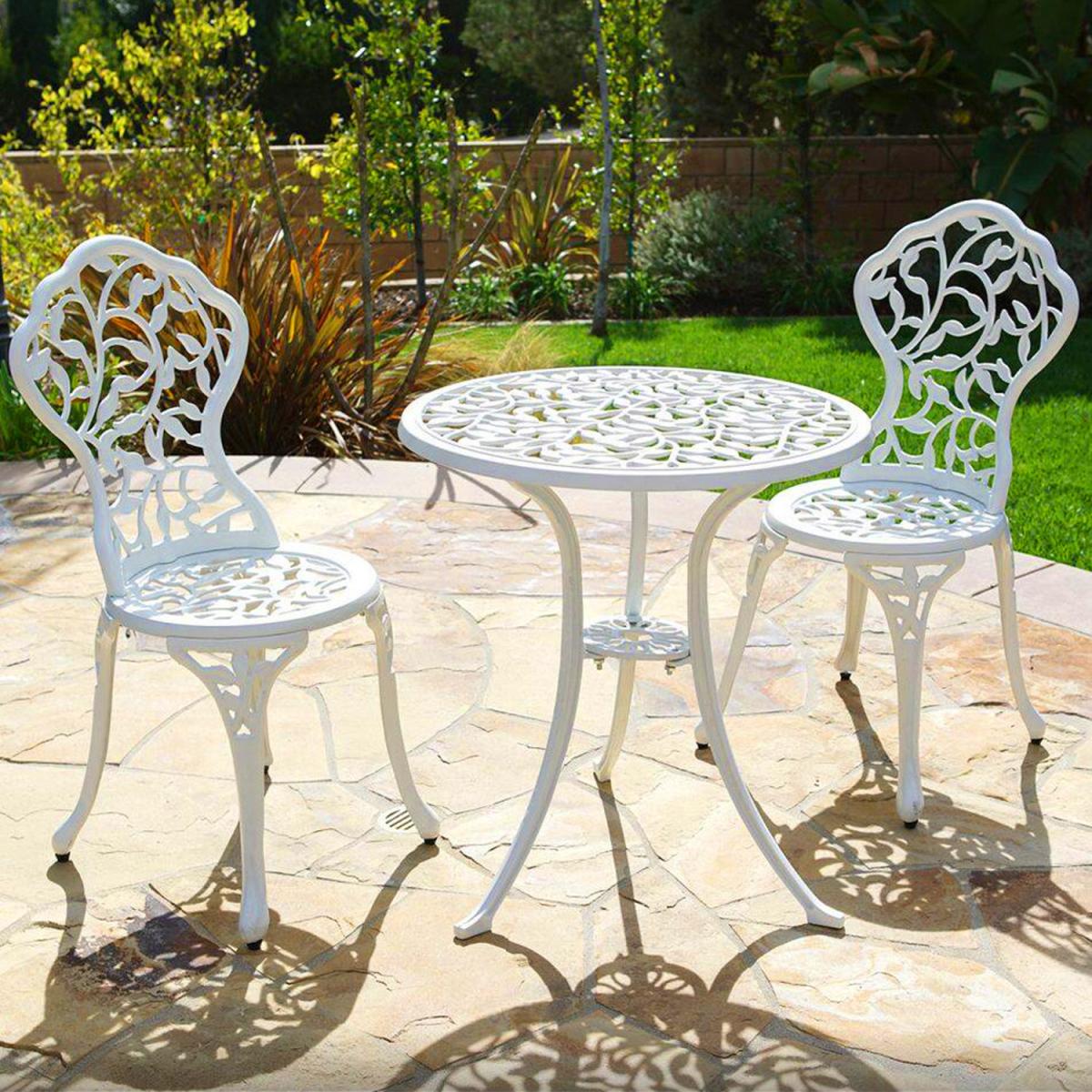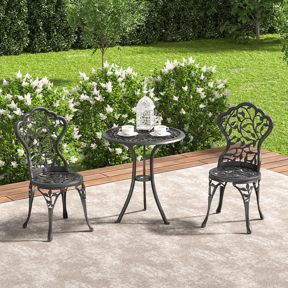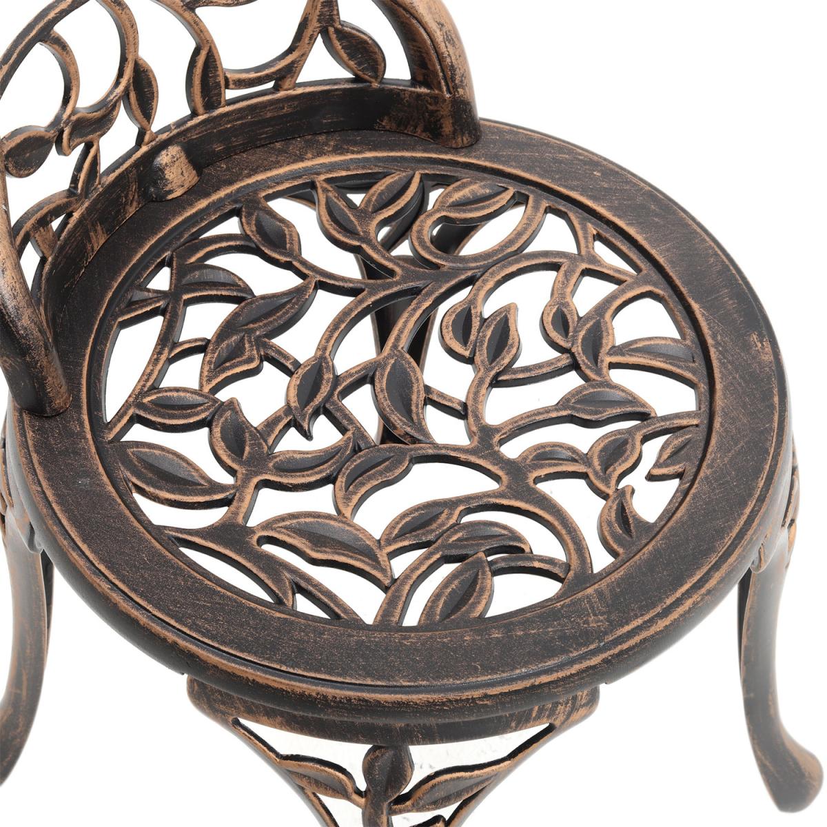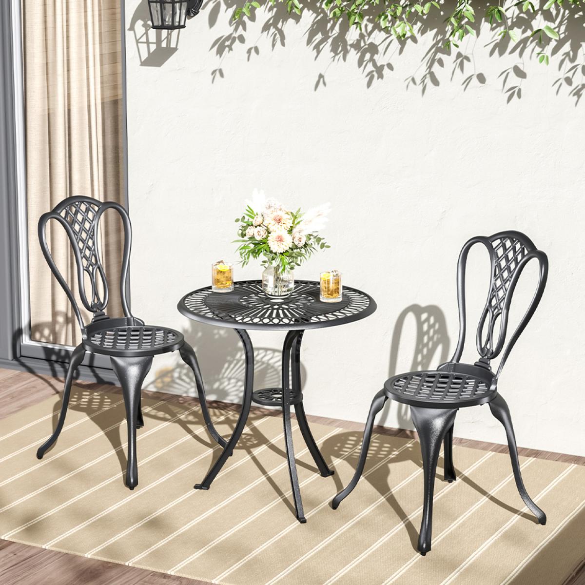 Durable cast aluminium structure which is rust free and weather-resistant, flower pattern of the table and chairs make this bistro outdoor table set look more retro, beautiful antique bistro table set which will be a great addition to garden and poolside. These two aluminium chairs are designed without an armrest, which provides you with more space for activities meanwhile taking up less storage space. Table with 45mm hole for an umbrella which can shade you when rainy day. This garden furniture set comes with extra plastic footpads, which can adapt more flexibly to ground conditions.