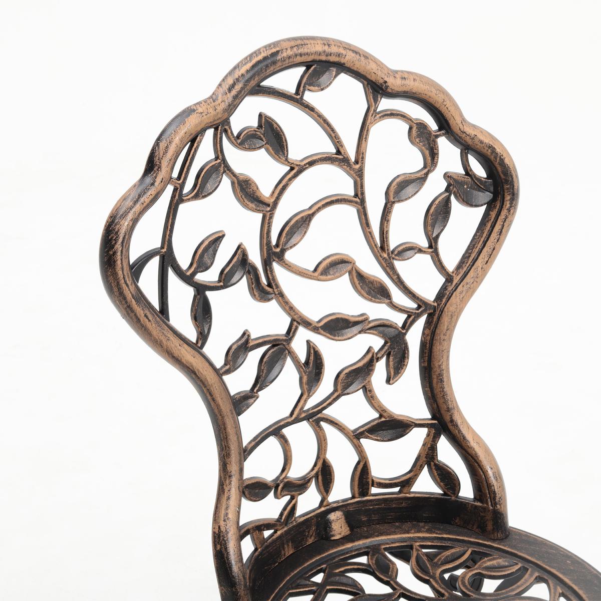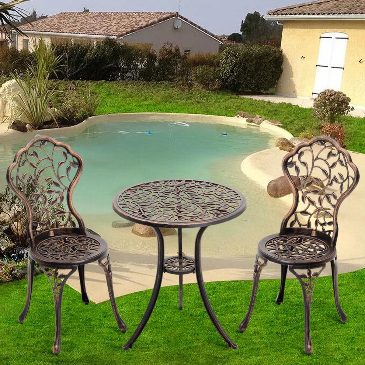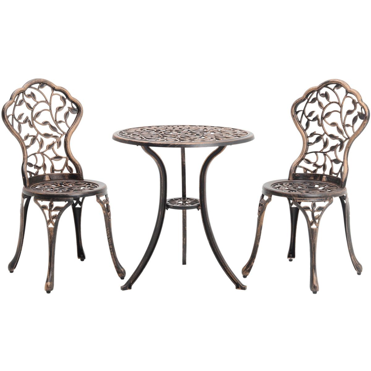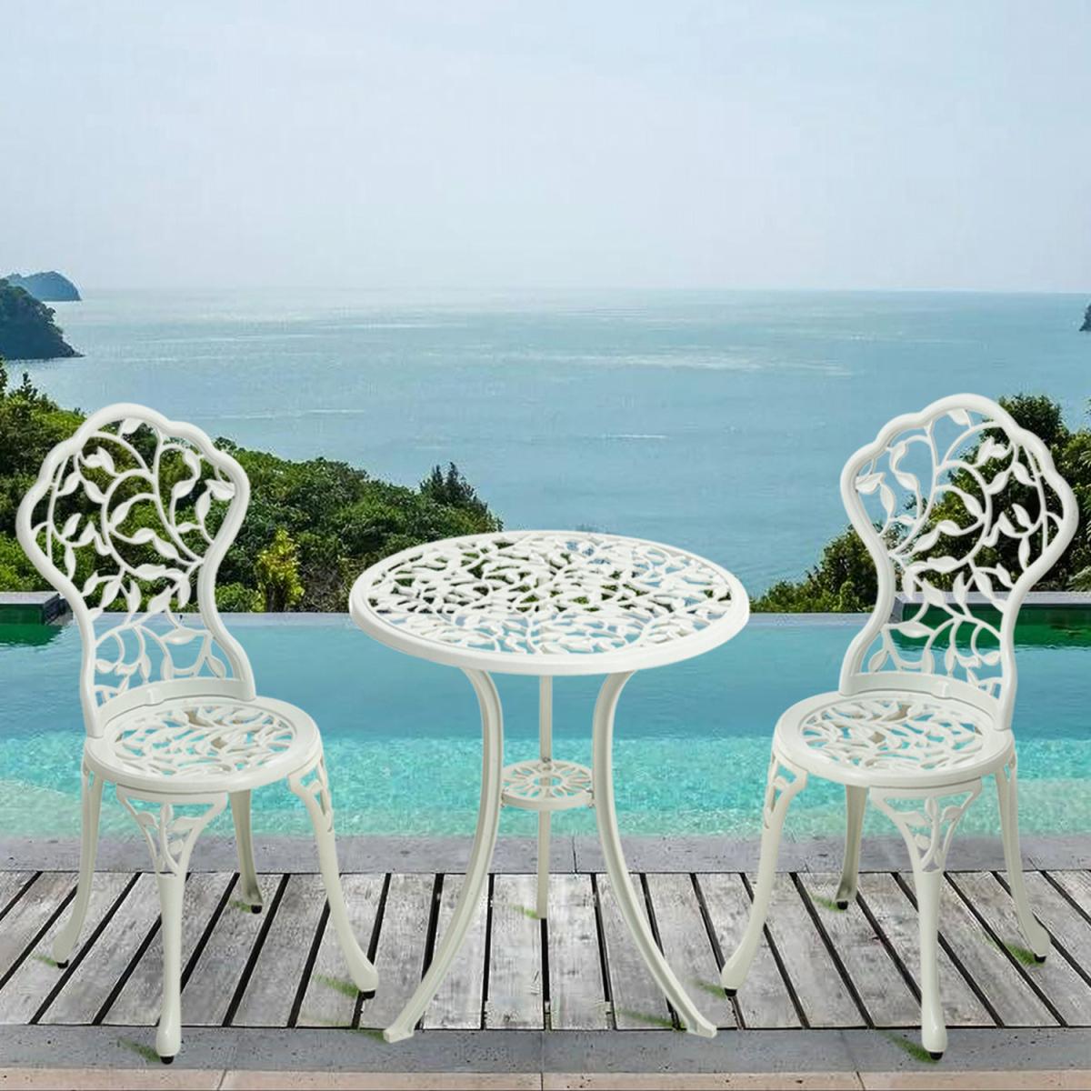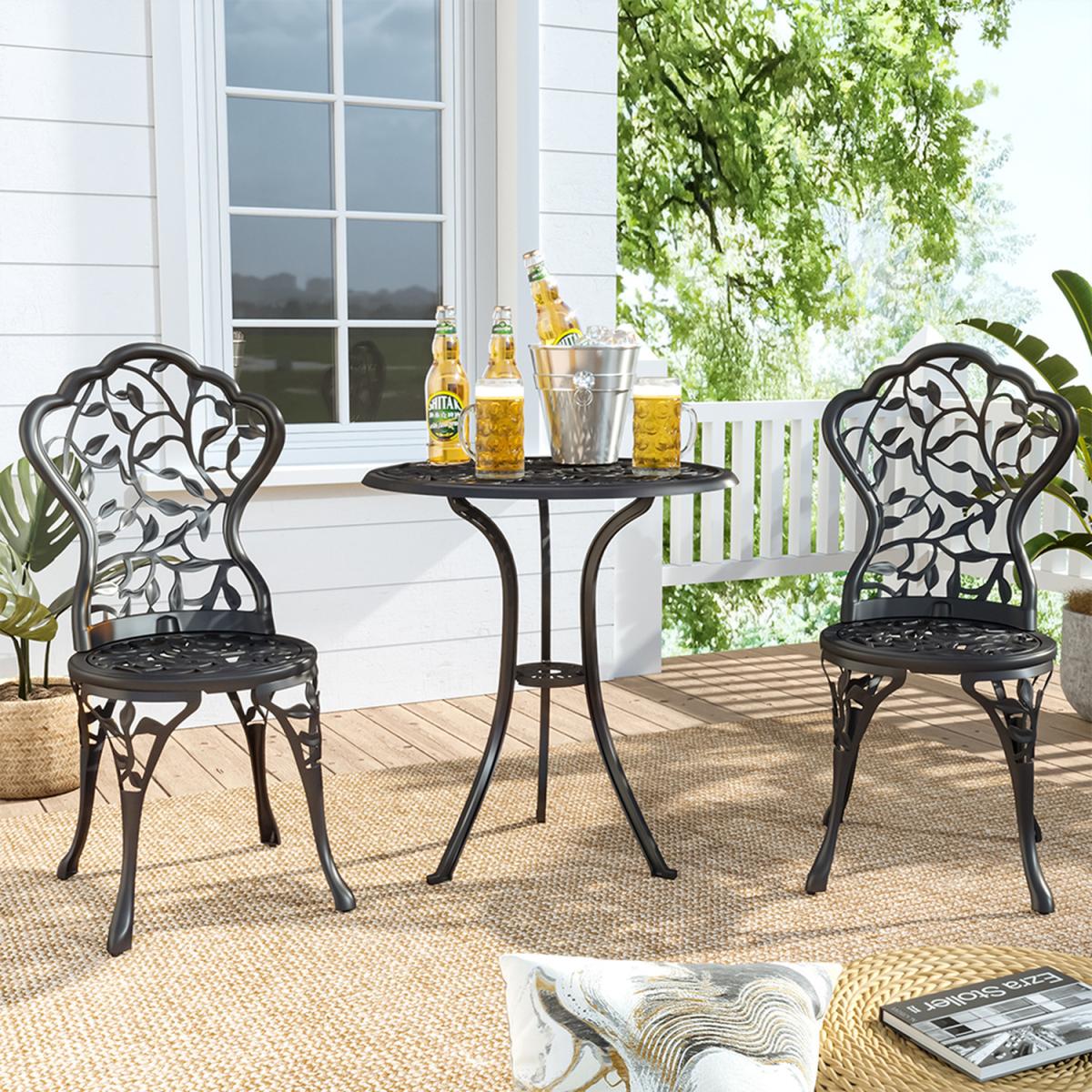 Durable cast aluminium structure which is rust free and weather-resistant, flower pattern of the table and chairs make this bistro outdoor table set look more retro, beautiful antique bistro table set which will be a great addition to garden and poolside. These two aluminium chairs are designed without an armrest, which provides you with more space for activities meanwhile taking up less storage space. Table with 45mm hole for an umbrella which can shade you when rainy day. This garden furniture set comes with extra plastic footpads, which can adapt more flexibly to ground conditions.