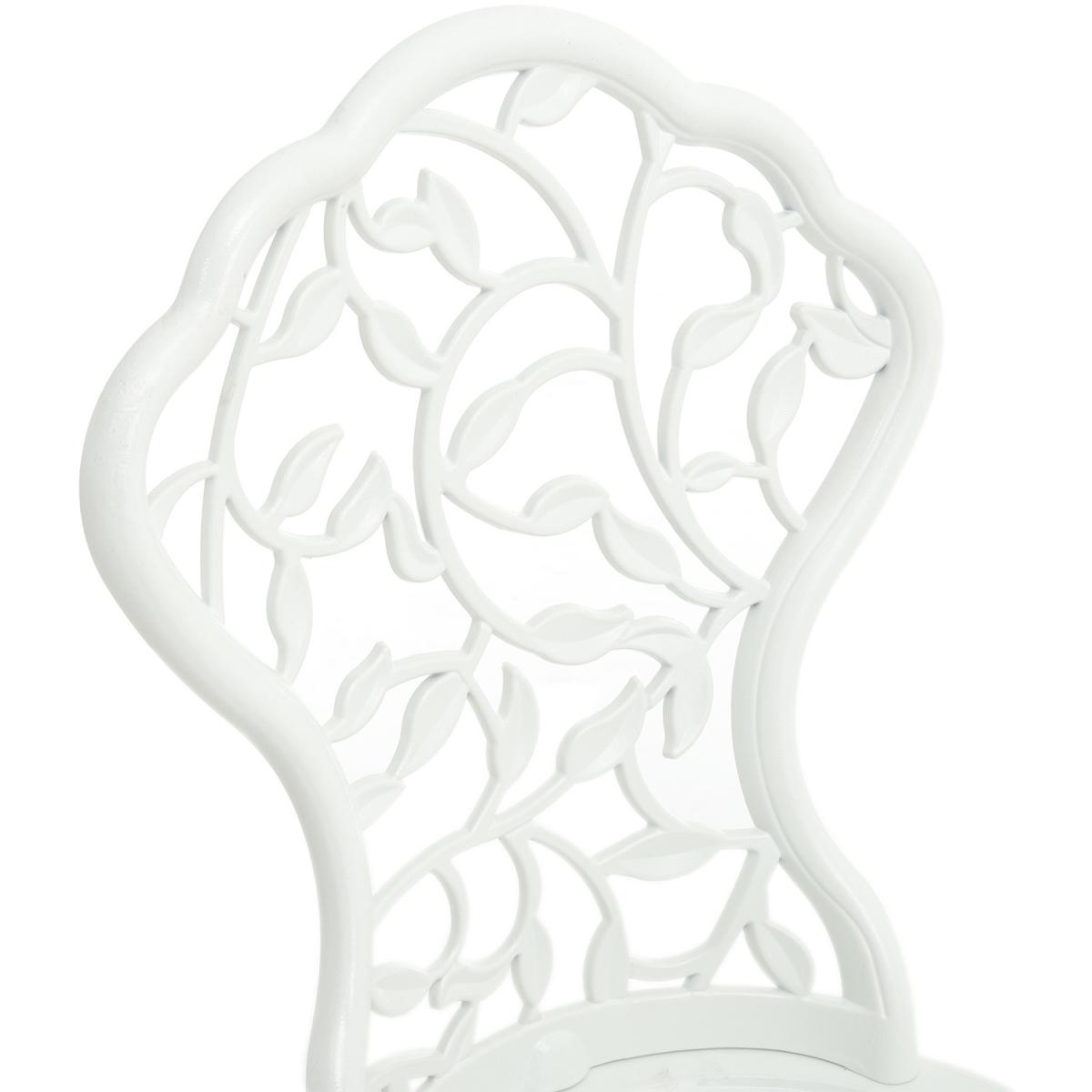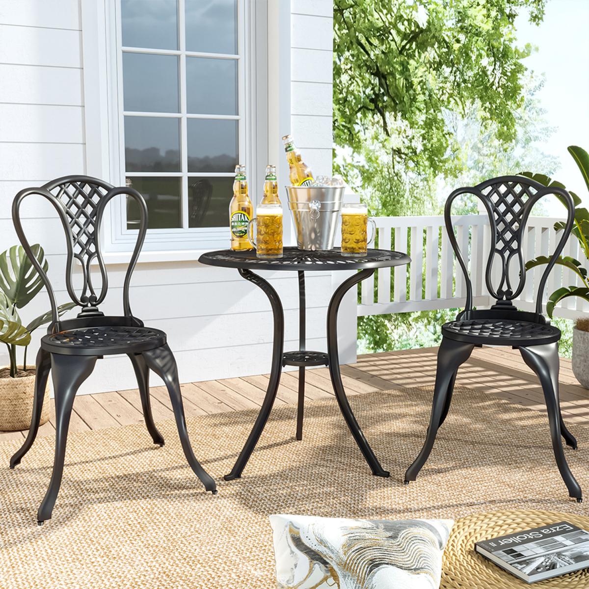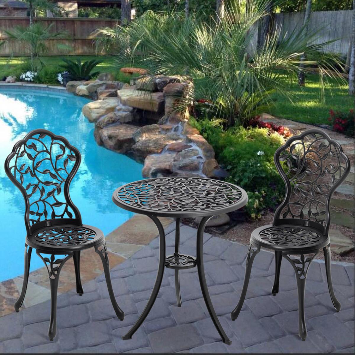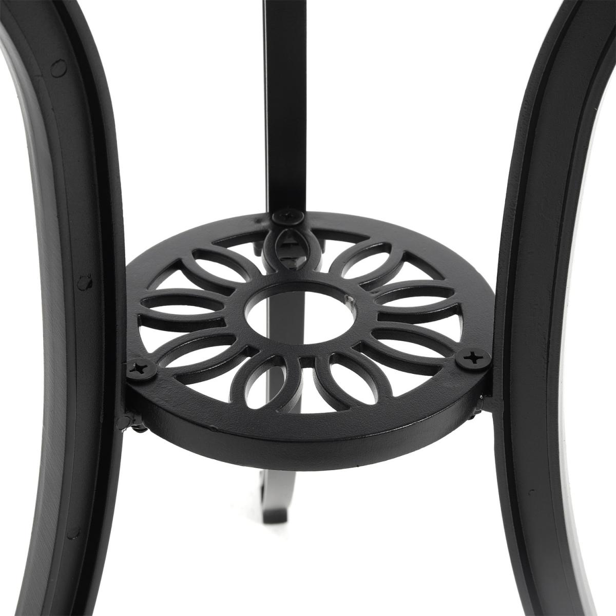 Durable cast aluminium structure which is rust free and weather-resistant, flower pattern of the table and chairs make this bistro outdoor table set look more retro, beautiful antique bistro table set which will be a great addition to garden and poolside. These two aluminium chairs are designed without an armrest, which provides you with more space for activities meanwhile taking up less storage space. Table with 45mm hole for an umbrella which can shade you when rainy day. This garden furniture set comes with extra plastic footpads, which can adapt more flexibly to ground conditions.