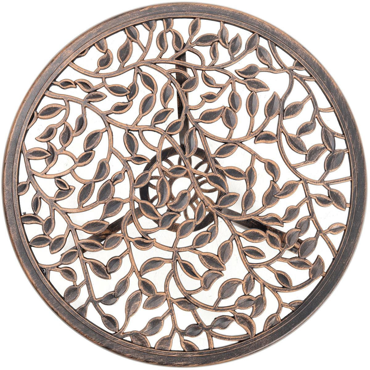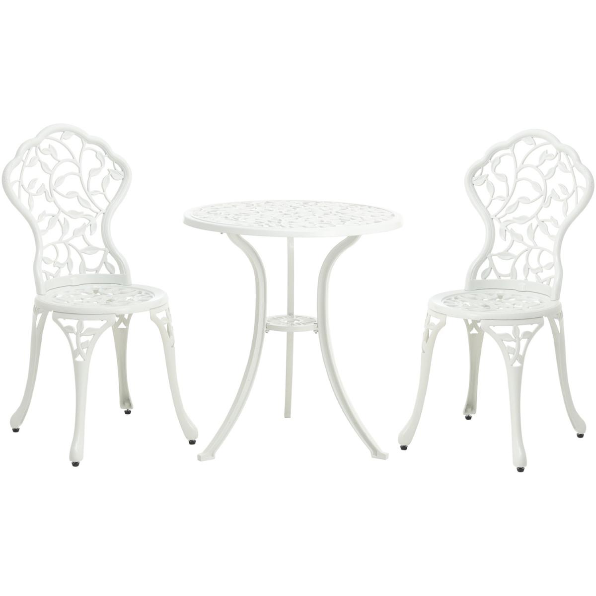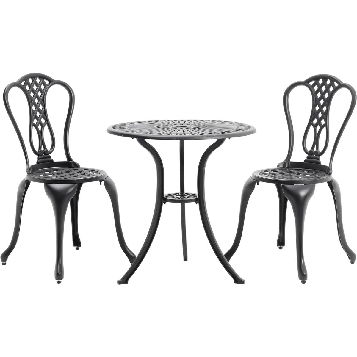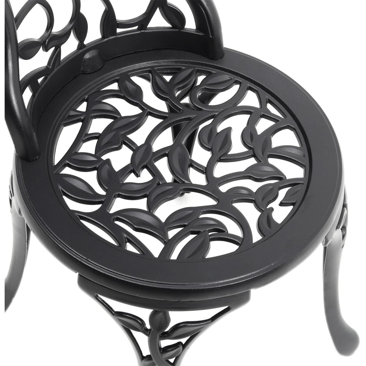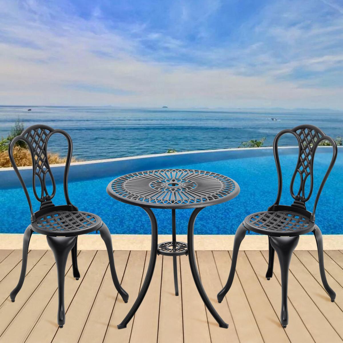Durable cast aluminium structure which is rust free and weather-resistant, flower pattern of the table and chairs make this bistro outdoor table set look more retro, beautiful antique bistro table set which will be a great addition to garden and poolside. These two aluminium chairs are designed without an armrest, which provides you with more space for activities meanwhile taking up less storage space. Table with 45mm hole for an umbrella which can shade you when rainy day. This garden furniture set comes with extra plastic footpads, which can adapt more flexibly to ground conditions.
