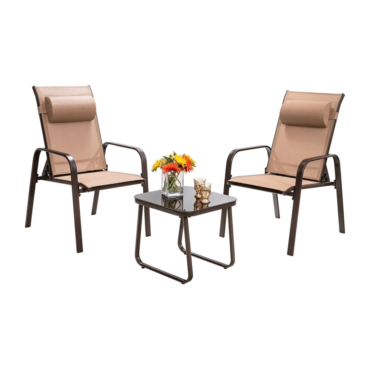 Designed with modern style and compact size, this outdoor conversation set not only brings out the perfect taste of life but also fits limited places, such as the patio, porch balcony, etc. To make the sitting experience more comfortable, the backrest and headrest of these 2 dining chairs can be adjusted based on your different needs. In addition, the tempered glass coffee table with adjustable anti-slip foot pads can support your items firmly. 3-Piece Garden Table and 2 Chairs - Brown