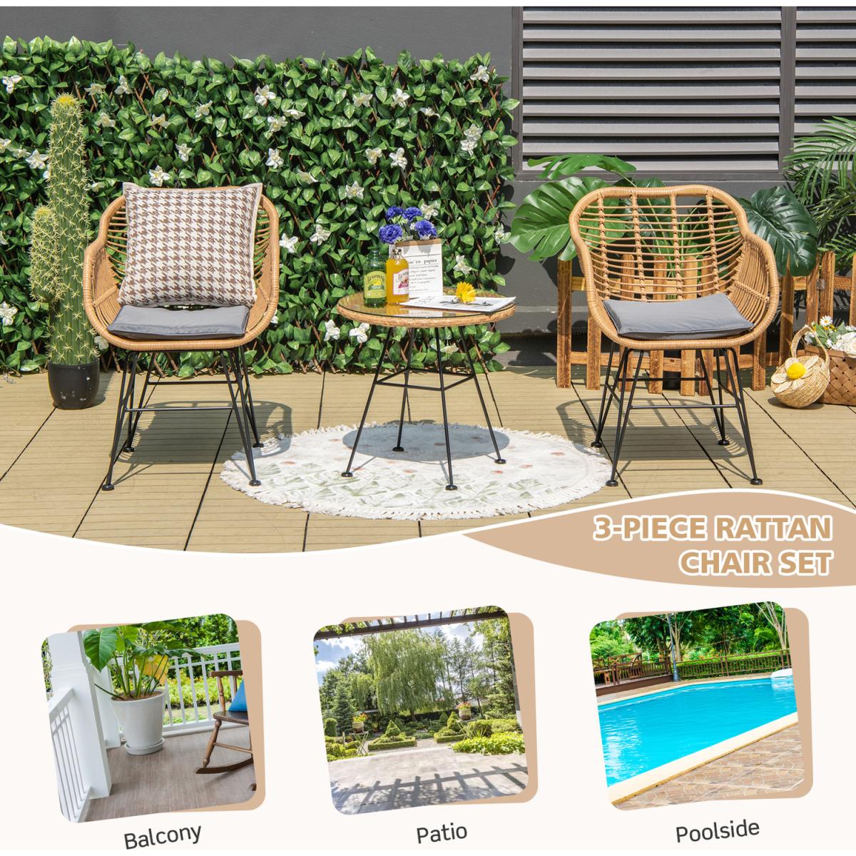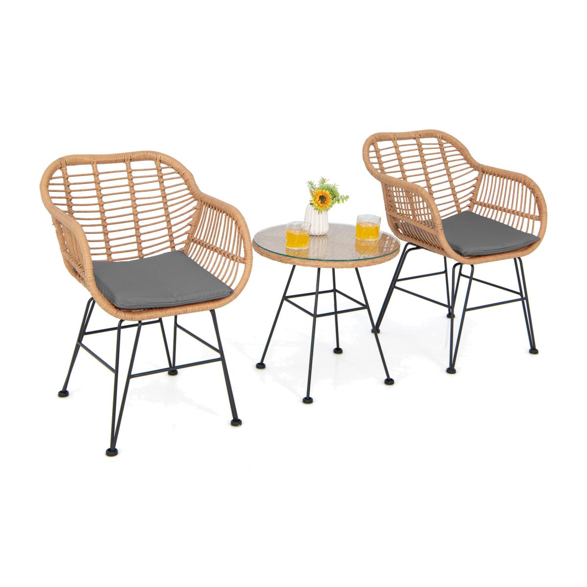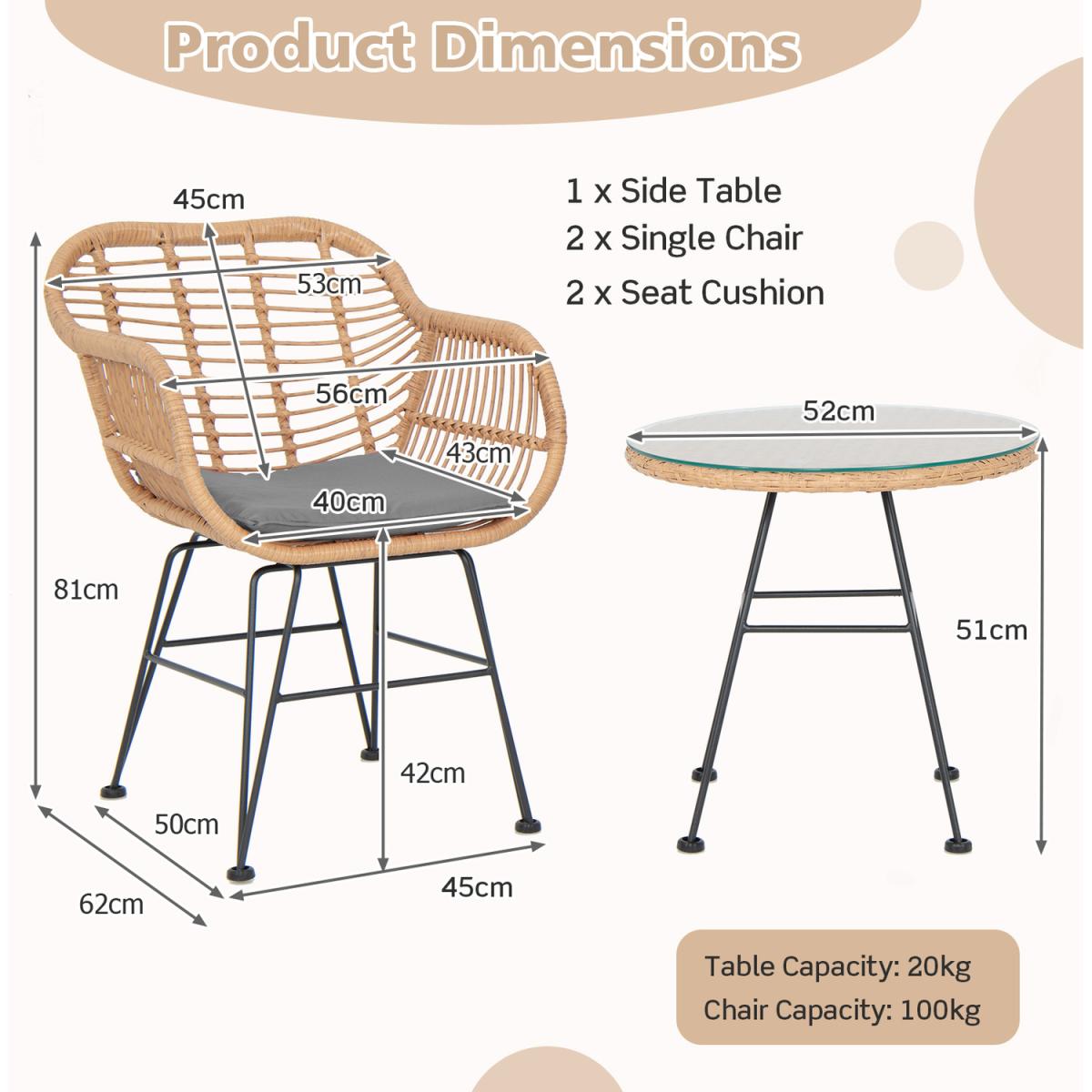 Are you looking for a patio bistro set for your backyard? This 3-piece wicker bistro set is a great choice for you. The weather-resistant PE rattan and durable powder-coated steel frame can stand the test of time, so that you can use it for years without worrying about deformation. Besides, the soft cushions with breathable fabric will relieve fatigue instantly. And the removable covers are easy to clean. The tempered glass tabletop offers ample space for your books and drinks, which also is smooth to clean. With a stylish appearance, this PE rattan chair and table set will be a perfect addition to your backyard, patio, balcony and so on.