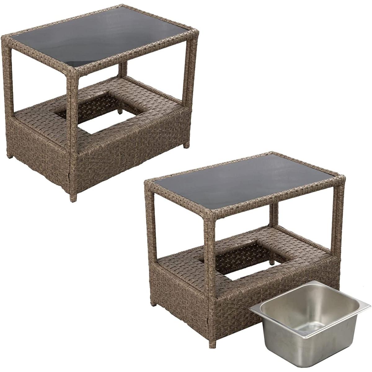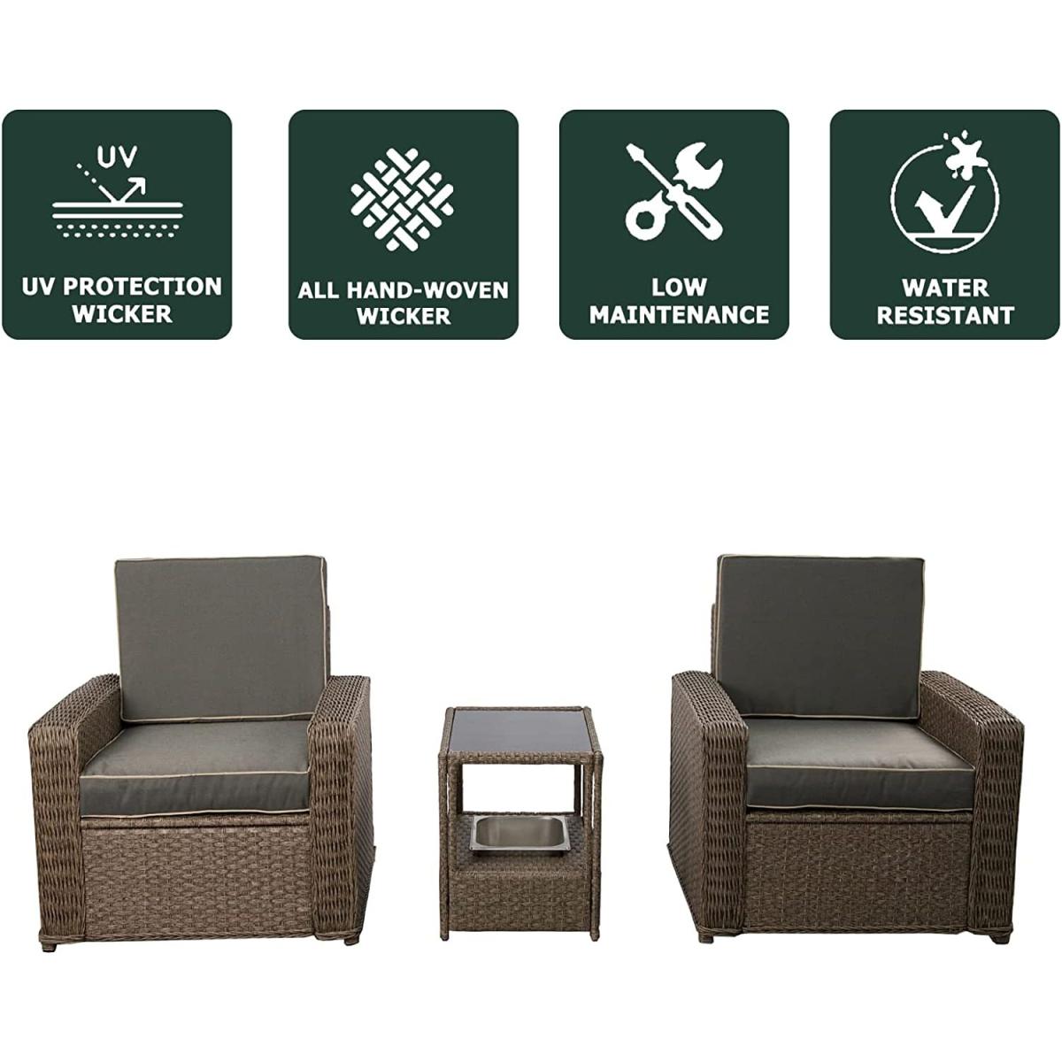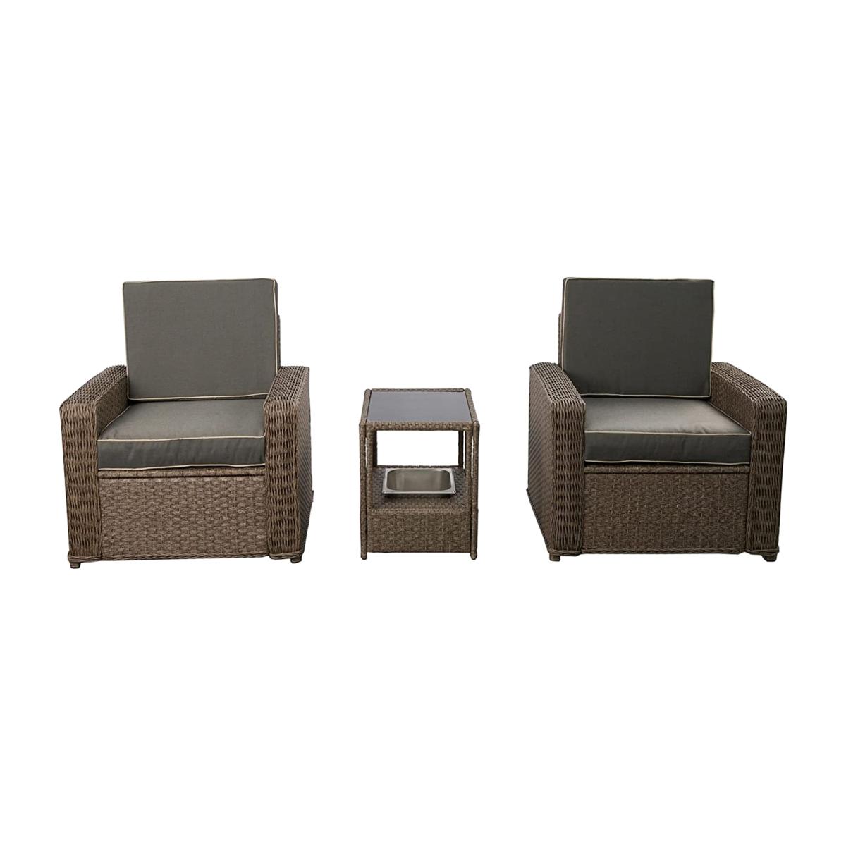 Sit back and relax in the comfort of your own garden with this three-piece chair and table set from Furniture One. Made from high-quality, hand woven PE wicker rattan with a metal frame underneath. Also weather resistant, thanks to the padded cushions, support back and wide seats C perfect for curling up and relaxing away the day in the sun. A thick tempered glass top on the table adds a sleek finishing touch thats easy to look after. Equipped with a large and removable ice bucket, which can use to keep your wine, and drink cool, and easily get your cool drink during leisure time. It's ideal for catching up with a friend whilst the sun shines.