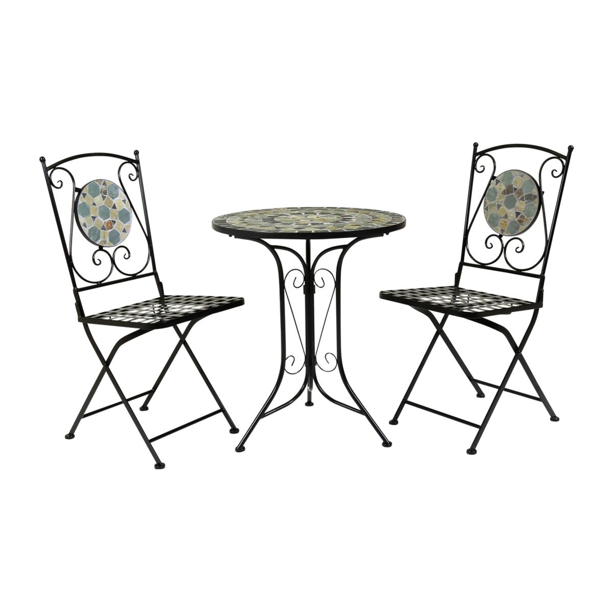 This Bentley Garden 2 seater bistro set will look gorgeous in your garden, patio or decking area. This set features an evocative blue mosaic design on the Table's top and the chairs' backs and the wrought iron frame is not only durable but also provides it with a wonderful antique look. Please note For a great plant pots display we also offer a matching plant rack, with the same mosaic pattern, for the perfect outdoor combination.