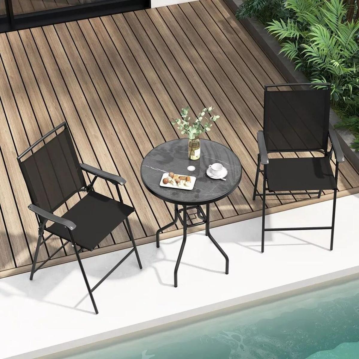 Add classic charm to your garden with this metal bistro set, featuring an intricate leaf design. Made from durable, weather-resistant metal, it's perfect for patios, balconies, or any outdoor seating area. 3 Piece Outdoor Chair and Table Set Hole for Umbrella - Black