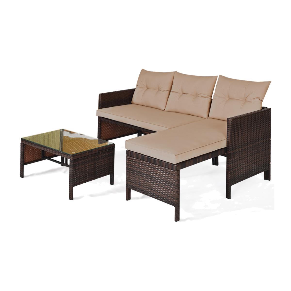 Our 3-piece outdoor patio furniture set includes a loveseat sofa, a corner lounge sofa, and a coffee table. The PE rattan furniture set comes with comfortable and breathable cushions and a large seating area, providing ultimate comfort. And the tempered glass tabletop coffee table can place snacks and coffee on it for you to eat and relax. 3 Piece Outdoor Conversation Furniture Set - Brown