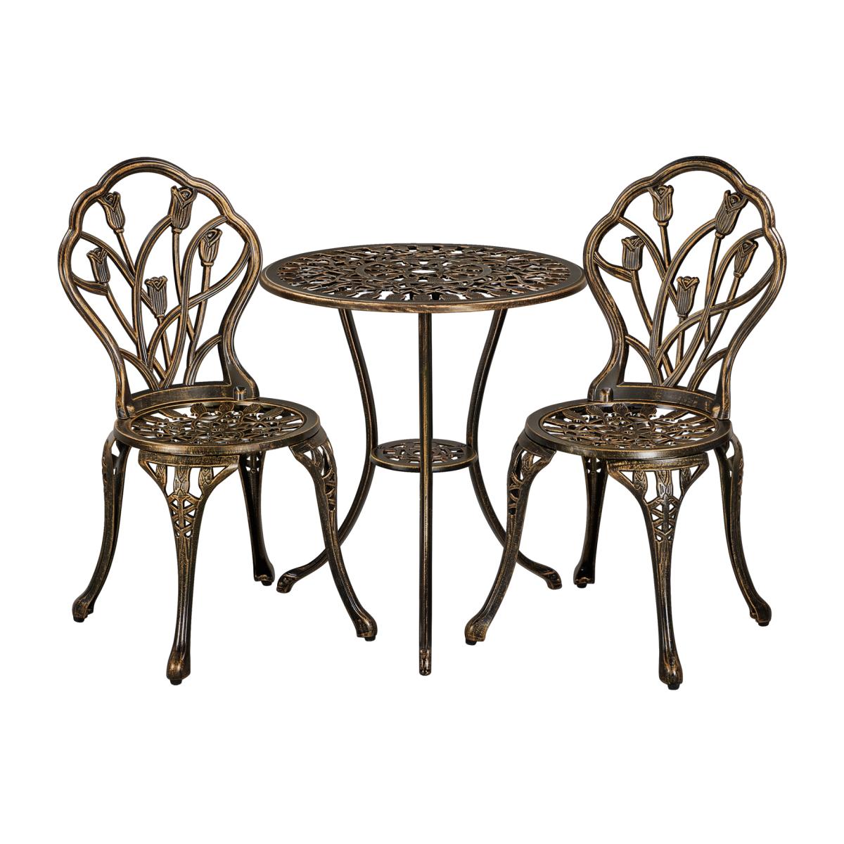 This Medieval rosebud patio bistro set comprises 1 table with an umnbrella hole and 2 chairs, an ideal choice for most outdoor setting or events. The hollow carved rosebuds and vine patterns, hard metal texture along with retro bronze and classic white colour options make it an elegant, retro addition to your rose garden. The slightly concave-shaped seat along with the gentle slanted backrest all together get each part of your body cozily supported. This patio bistro set can be placed in most of the outdoor events such as an outdoor wedding ceremony, a bistro party or setting for cafe.