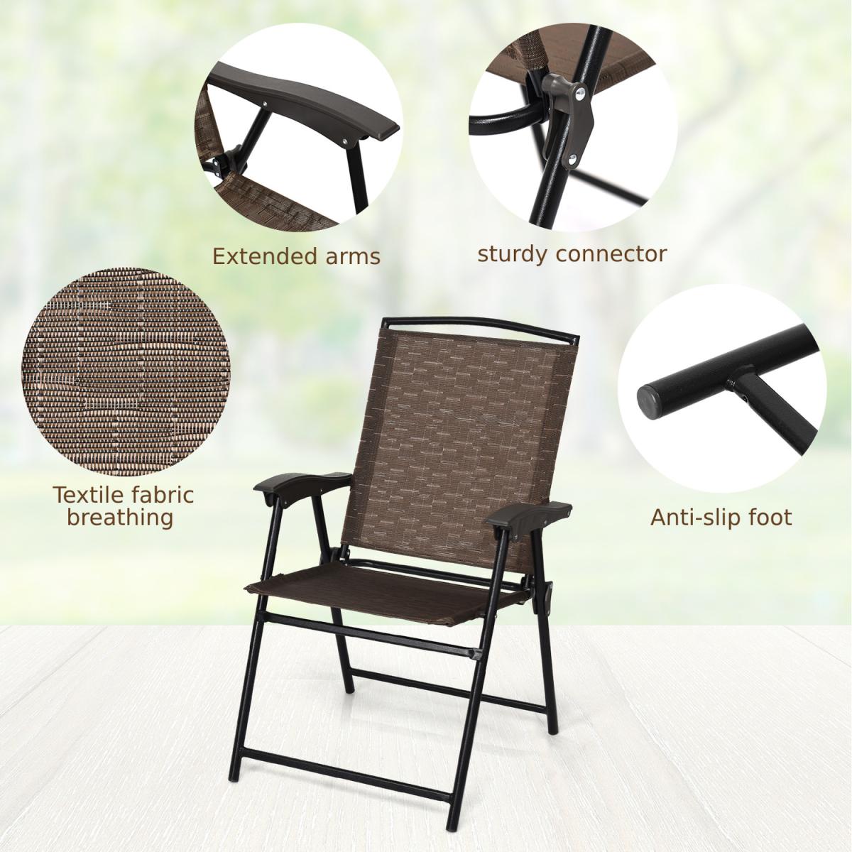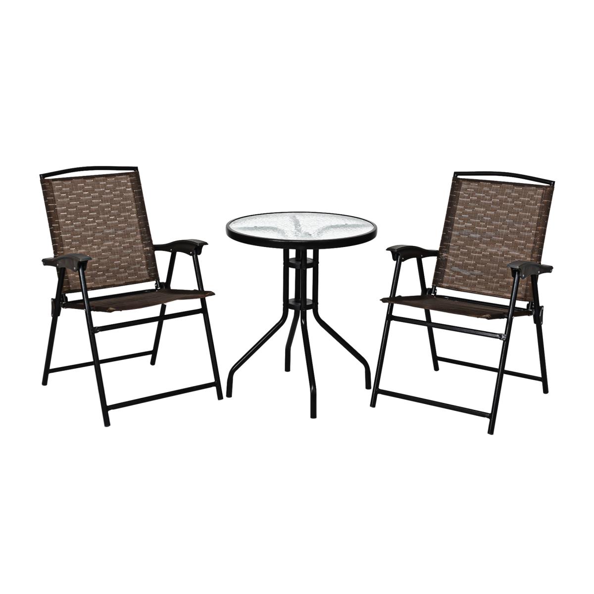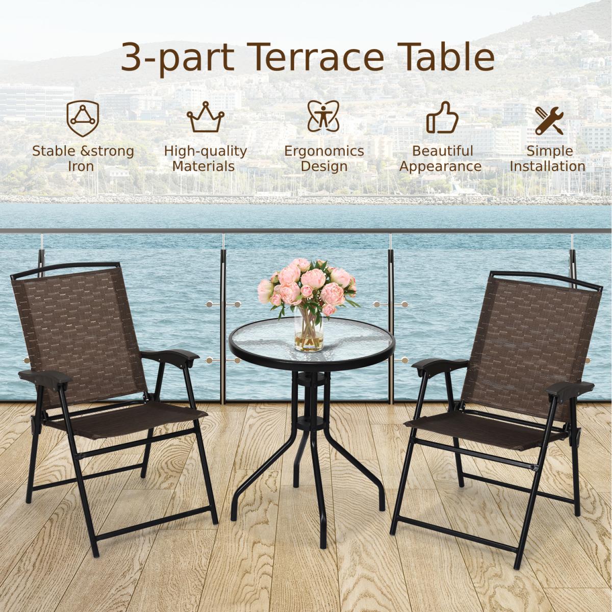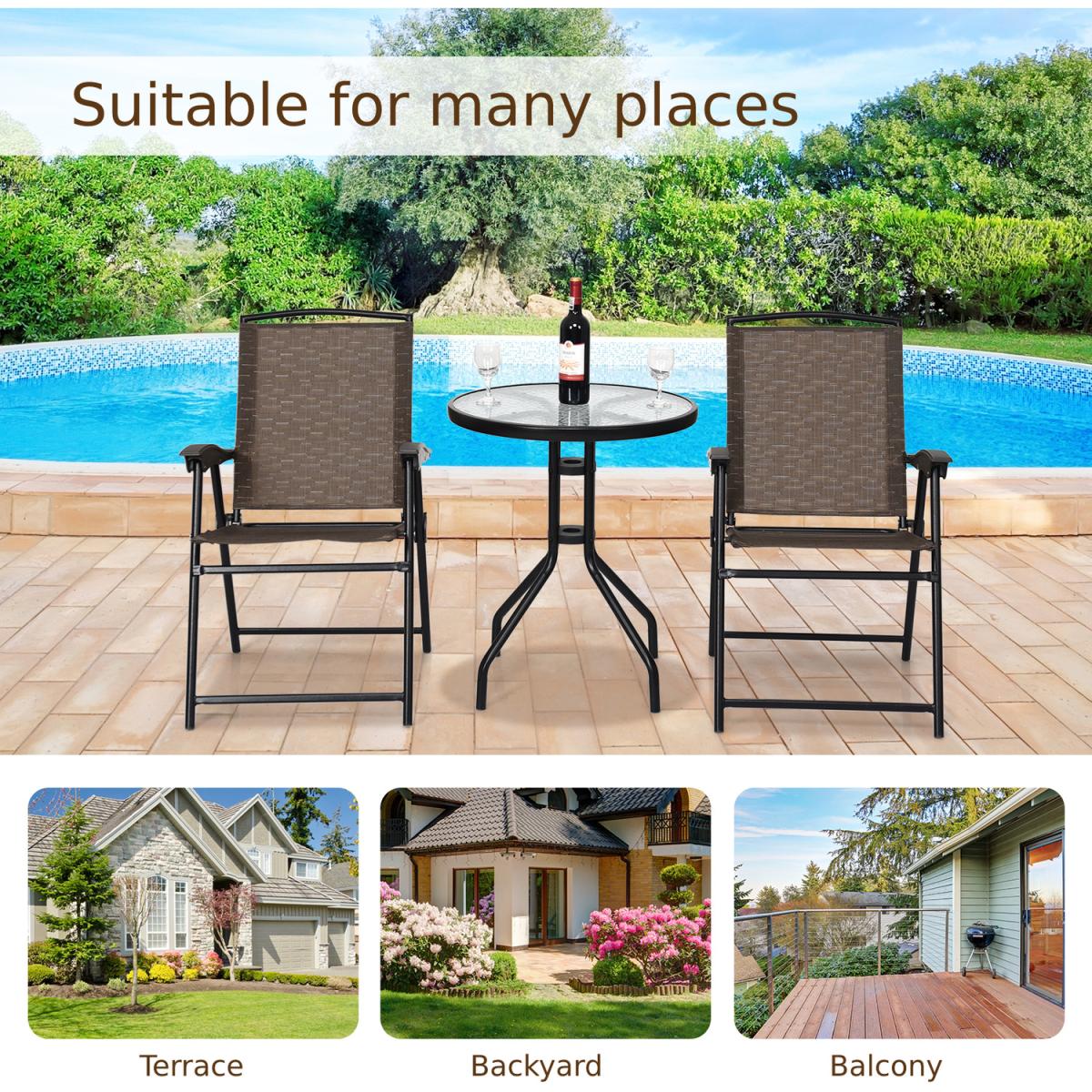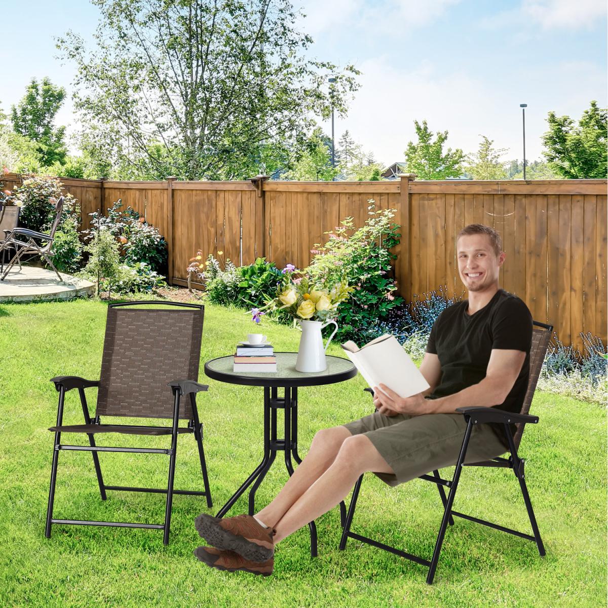The 3 piece patio bistro set allows you to enjoy leisure time while sunbathing and napping. The 2 chairs are made of breathable fabric, which makes it easy to clean, hard-wearing and suitable for daily outdoor use. And the round table is constructed of tempered glass with water ripples and powder-coated steel frame so that it is highly durable and stable to hold up 20 kg. Besides, you can keep your favorite books, magazines, drinks, or knick-knacks within reach on it. Thanks to the lightweight structure and foldable chairs, this dining set can be easily moved around.