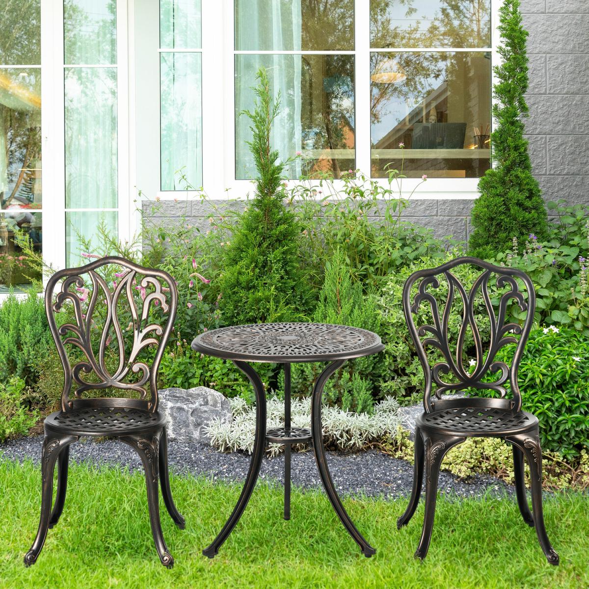 Add a touch of elegance to your outdoor areas with this Outsunny set. Includes two chairs and a matching table. Centre umbrella hole to hold a parasol in place. Garden table and chairs are made from aluminium for strength, with the decorative patterns for a decorative finish. Outsunny 3 Piece Patio Bistro Set with Umbrella Hole for Garden - Bronze Tone