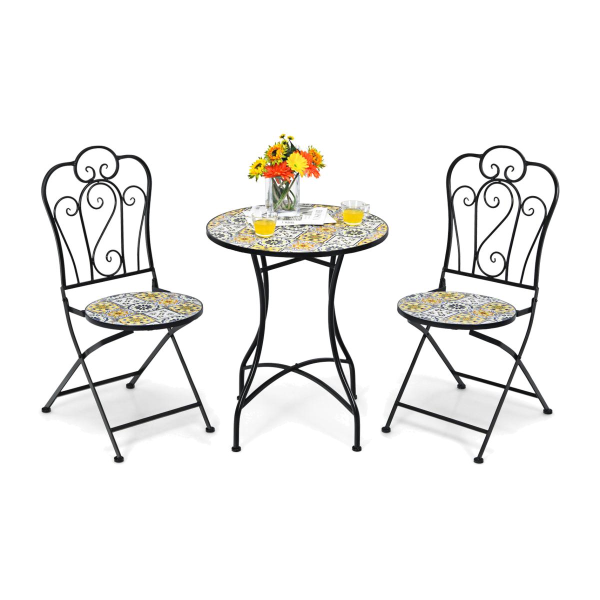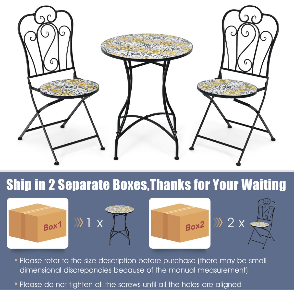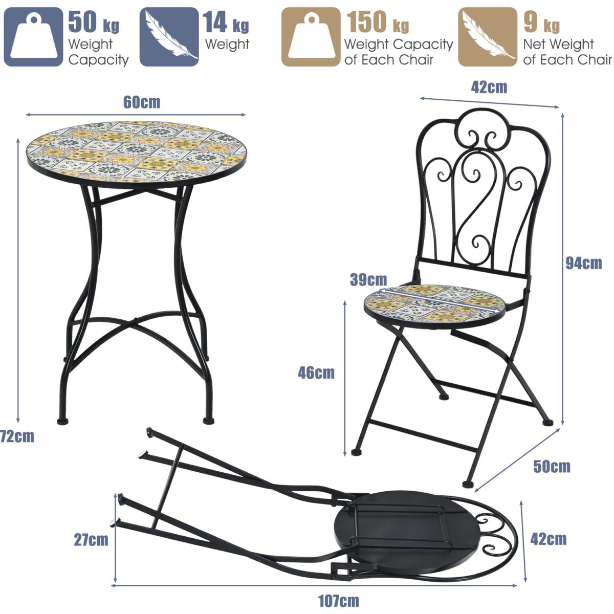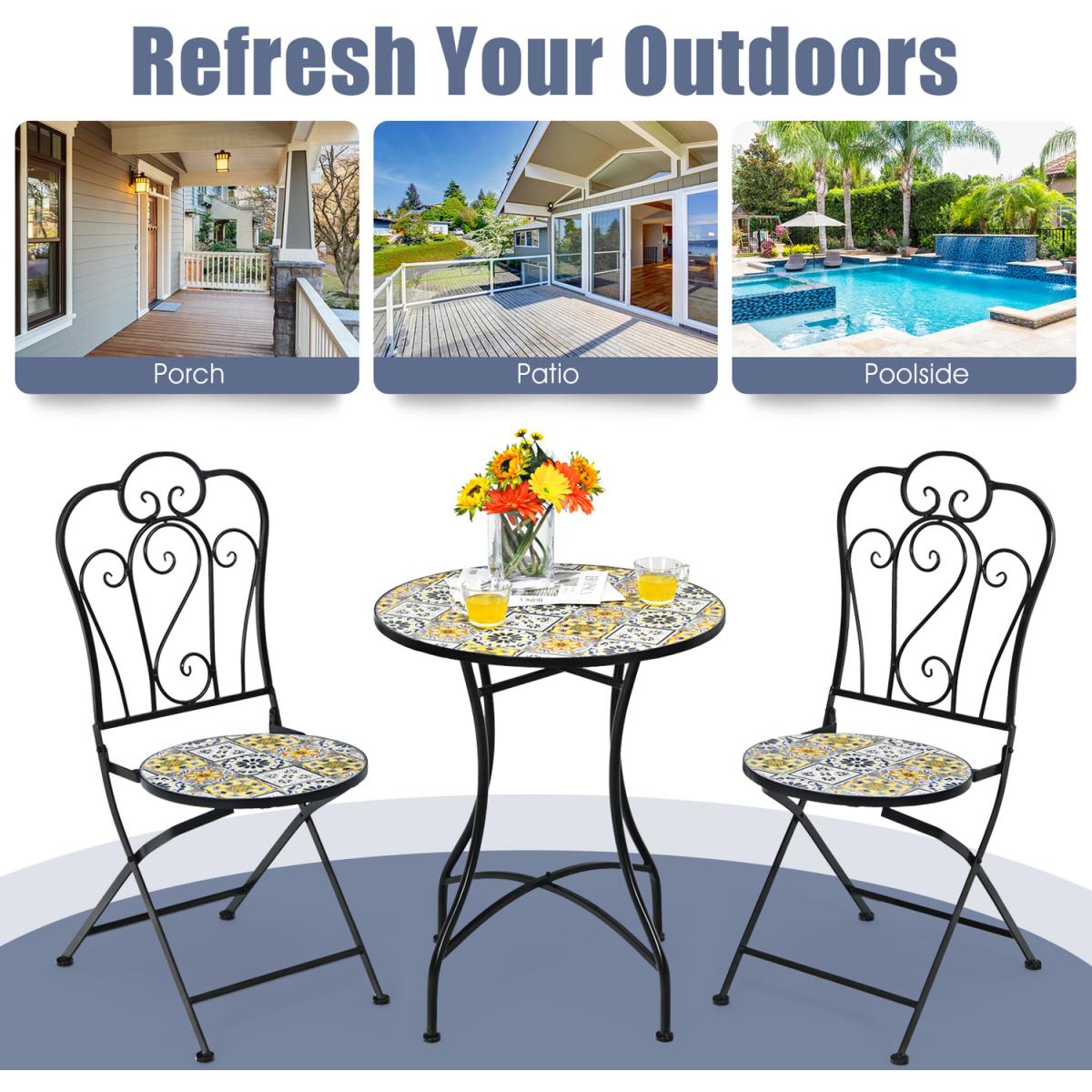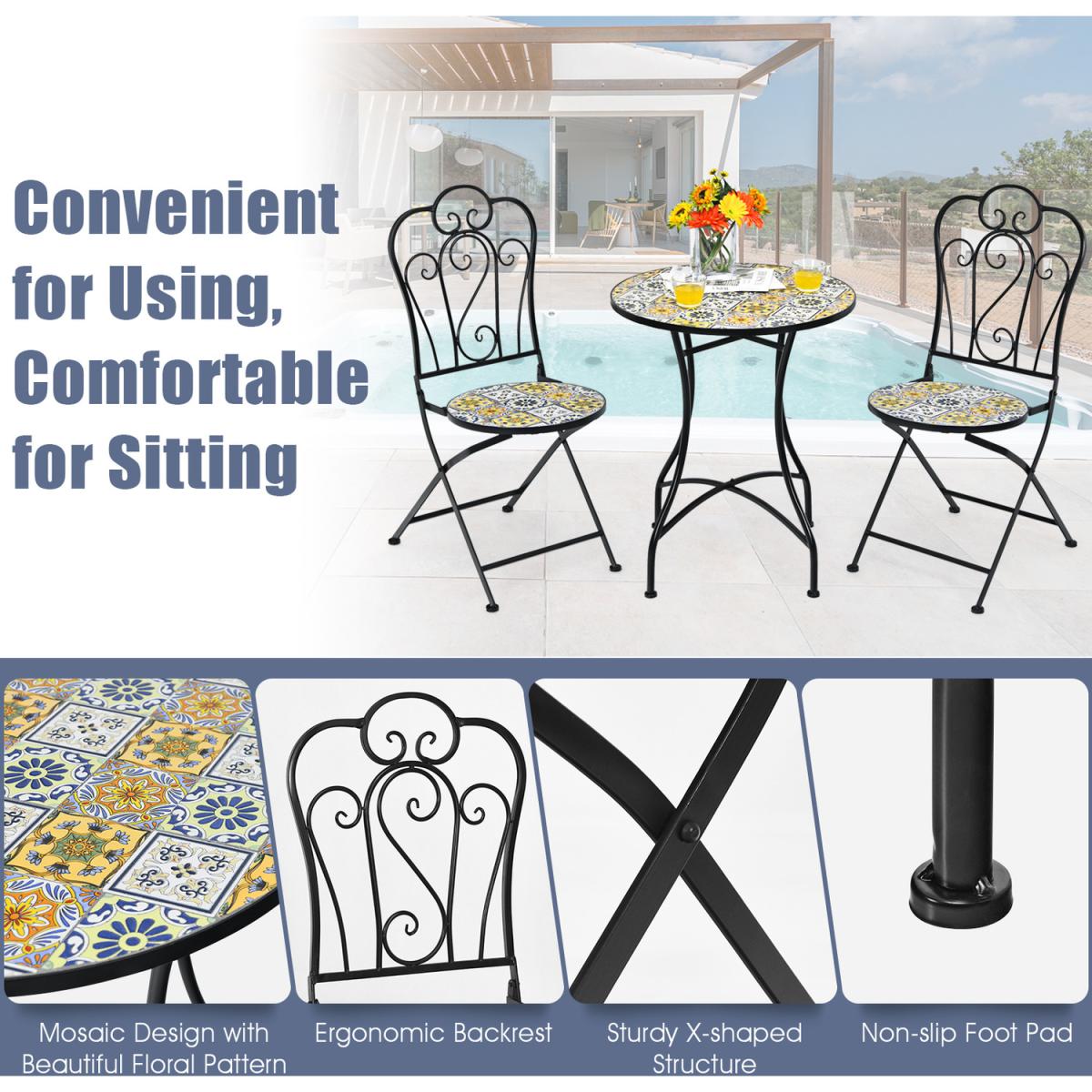 If you are looking for an outdoor furniture set that combines practicality and aesthetics, this 3-piece patio bistro set will be the perfect choice for you!For aesthetics, this outdoor conversation set features special mosaic design with beautiful floral pattern. As for practicality, the table is designed with round tabletop to hold up various items. Meanwhile, comfortable chairs can be folded for space-saving and easy storage. Furthermore, the rustproof steel frame with anti-slip foot pads and durable ceramic tiles make this outdoor patio furniture set stable and durable for long time outdoor use. Therefore, this patio bistro set is convenient for using and comfortable for sitting.