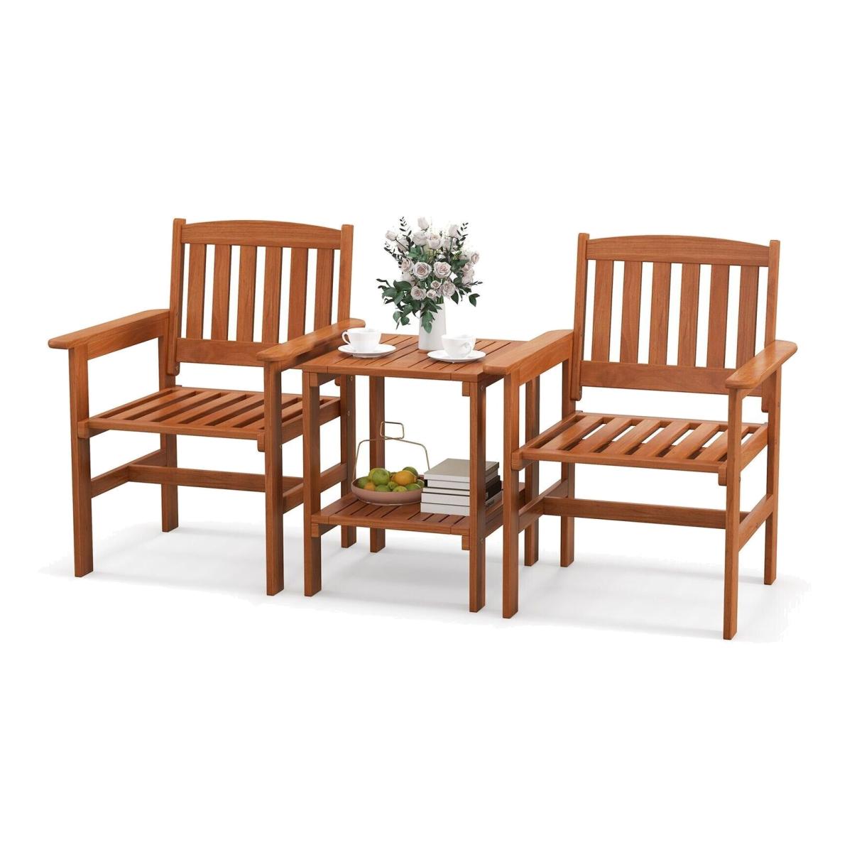 Constructed from natural wood, this 3-piece outdoor table and chairs set is designed to withstand the test of time. The waterproof and splinter-free surface ensures easy maintenance. The set includes a double-layer coffee table and 2 chairs, with the table providing convenient storage. Featuring an umbrella hole in the centre, the table allows you to add shade on sunny days for a comfortable dining experience. The chairs are ergonomically designed for comfort, with widened armrests for added convenience.