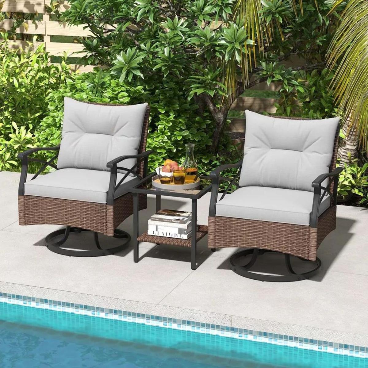 Upgrade your outdoor space with this 3-piece patio wicker chair and table set. Made from durable rattan, it's weather-resistant and stylish, perfect for relaxing mornings or evening gatherings in your garden or patio. 3 Piece Patio Wicker Swivel Rocking Bistro Set with Cushions - Grey