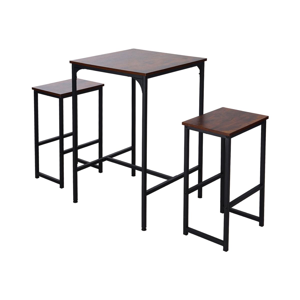 This compact three-piece bar table set featuring a table and two stools is crafted for today's modern lifestyle. Combining a rustic wood effect finish with a sleek black metal frame, it introduces a touch of industrial character to kitchens, dining areas, home offices or casual corners, ideal for relaxed moments with friends. The space saving design allows both stools to slide neatly beneath the table when not in use, making it perfect for smaller homes or rented flats. More than simply a bar set, it also serves as a dining table or a compact workstation. Stylish, versatile and thoughtfully designed, it brings balance between contemporary form and everyday function.