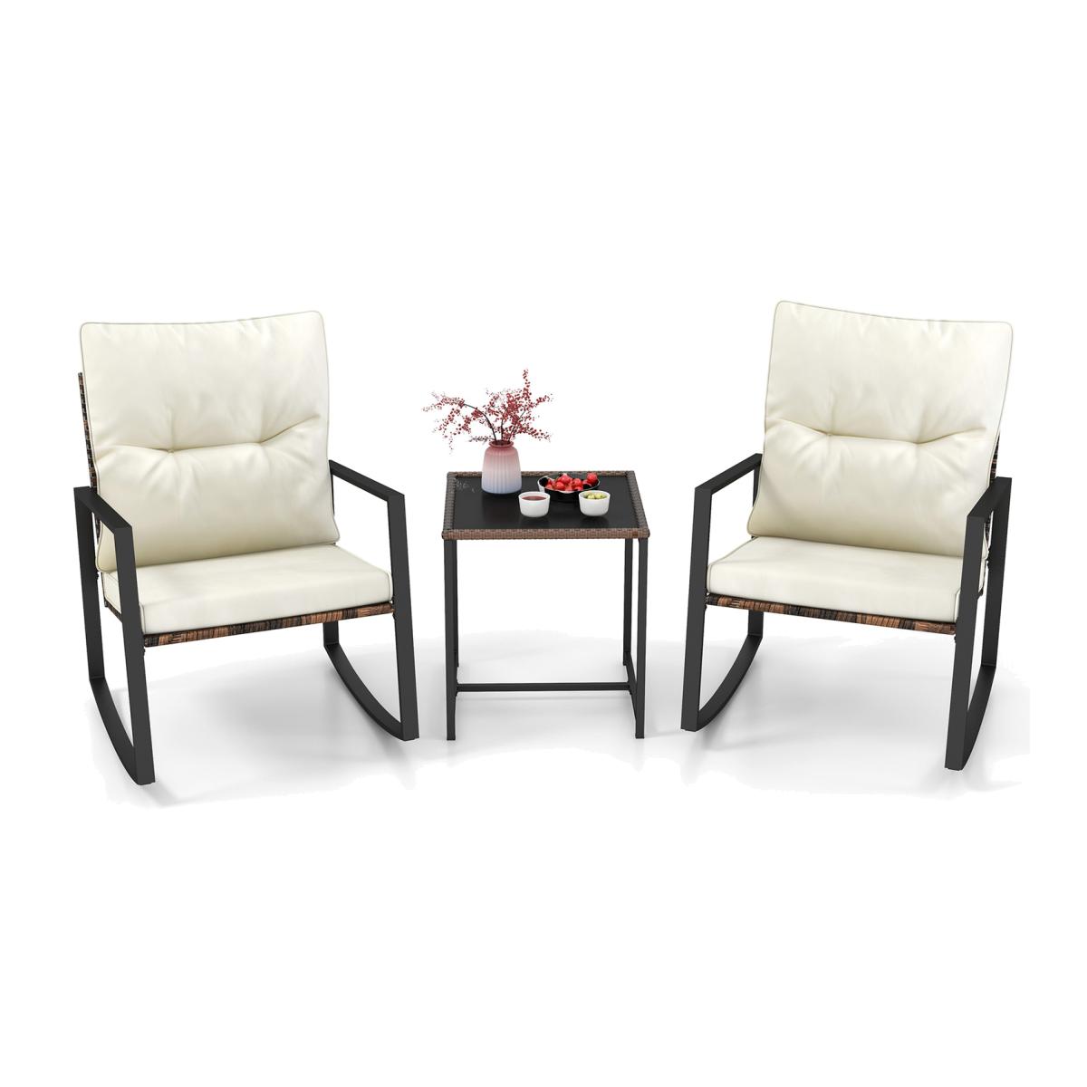 Transform your outdoor haven with our chic 3-piece bistro set, suitable for creating a cosy nook on your patio, porch, or poolside. Settle into the plush, removable cushions of our hand-woven rattan rocking chairs, and let the gentle rock soothe you into relaxation. Each piece is crafted for durability with a robust metal frame, ensuring years of enjoyment. 3-Piece Rocking Bistro Set with Cushions - White