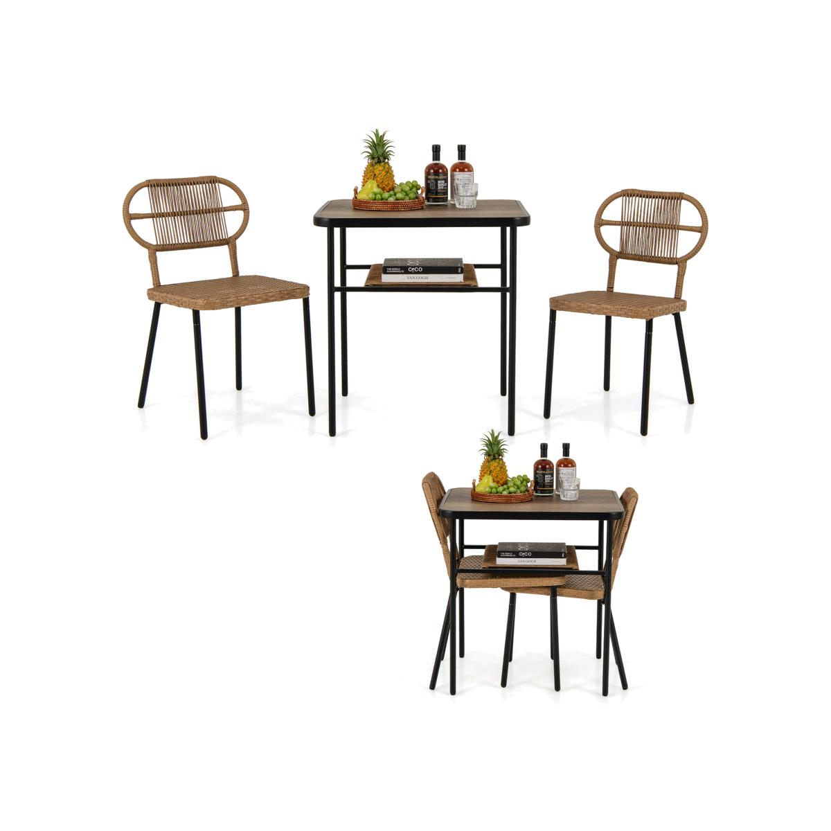 Transform your dining experience with this versatile 3-piece patio dining set, ideal for space-saving and stylish living. This set includes 2 varied-size wicker chairs that not only stack together but also tuck neatly under the table when not in use. The chairs feature stylish, sunproof and built-to-last rattan weave and ergonomically inclined backrests for supreme comfort. Moreover, the table boasts a DPC tabletop and a handy storage shelf underneath. Perfect for indoor and outdoor settings, this dining set brings functionality and elegance to any home or patio space.