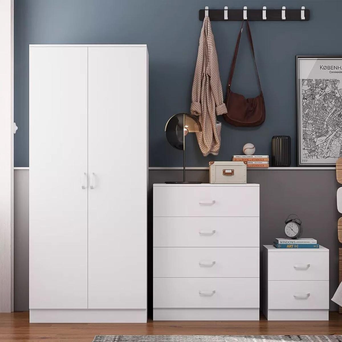 Create a cohesive and stylish bedroom with this 3 Piece Wardrobe Set, which includes a practical wardrobe, a bedside table, and a 4 drawer cabinet. Designed for modern living, this set offers ample storage solutions while enhancing your bedroom decor. The sleek lines and quality construction ensure that this furniture not only looks great but also stands the test of time. Perfect for any bedroom size, this versatile collection is ideal for those seeking both style and functionality. Enjoy a beautifully organised space with this essential bedroom set.