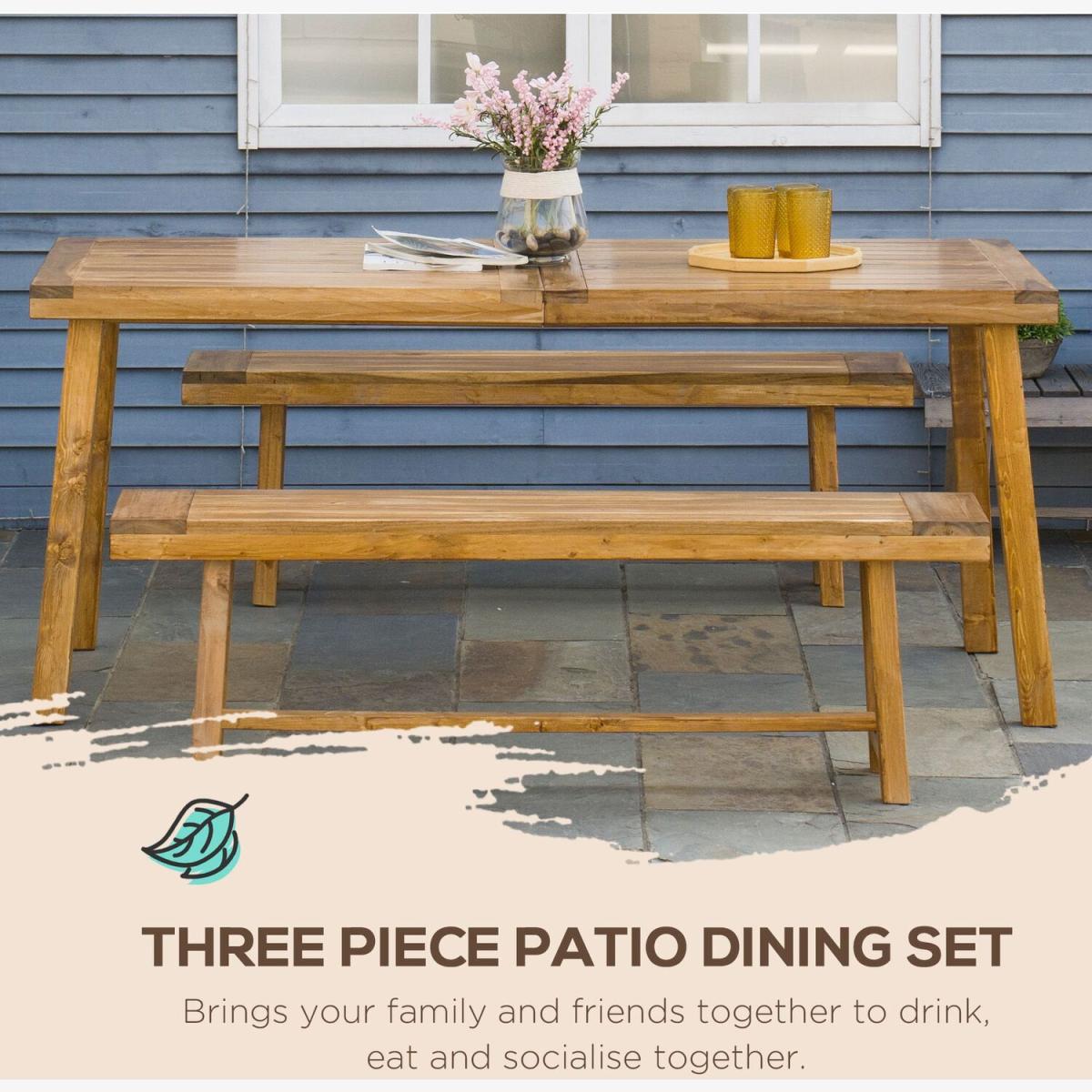 A set for everyday garden and outdoor space - this Outsunny dining set. Comes with a four-person table and two benches holding up four people. Each piece is made from acacia wood strong and sturdy, with a varnish coating for light protection. The wood retains the natural character beautiful and sleek.