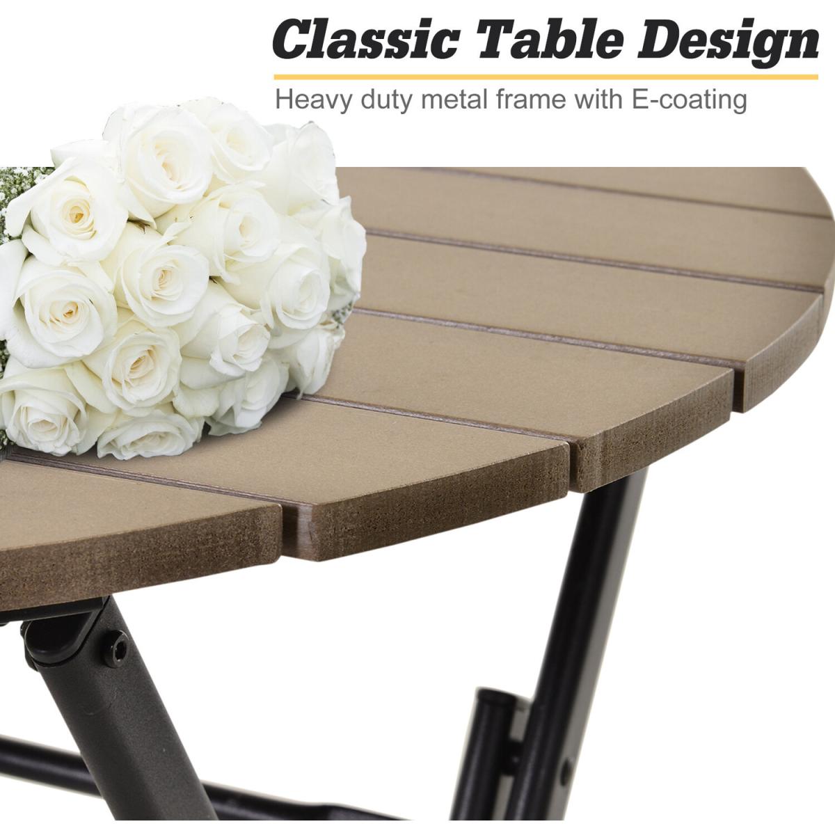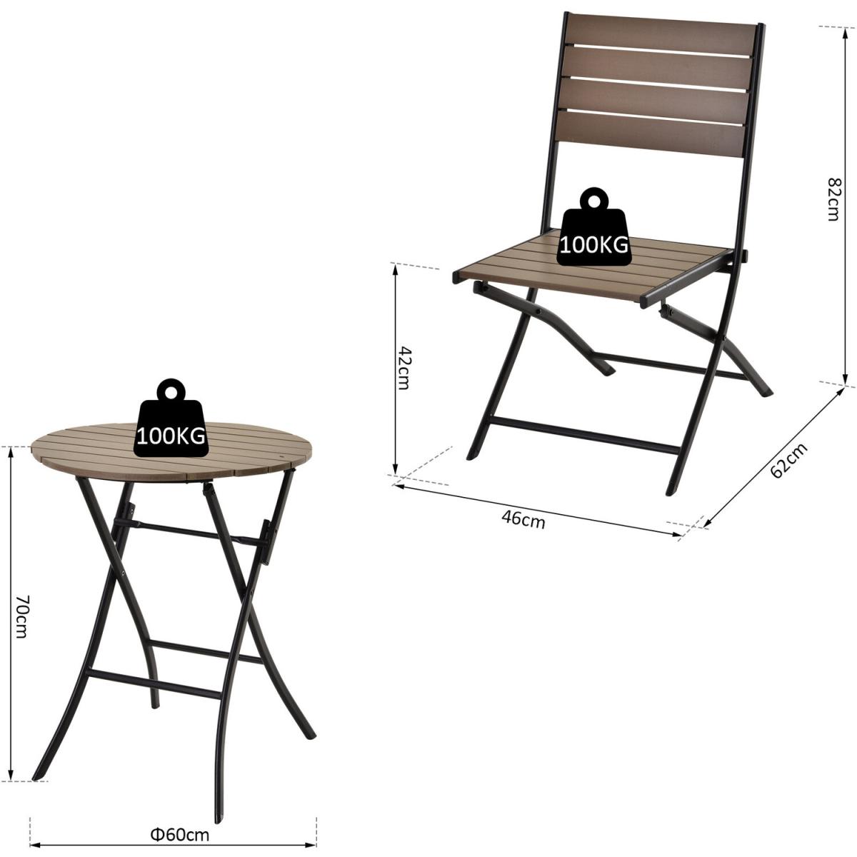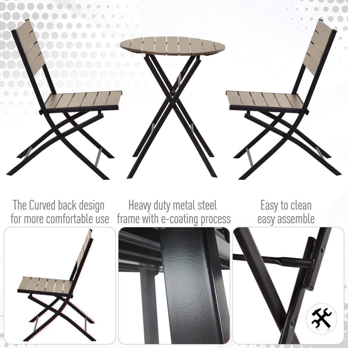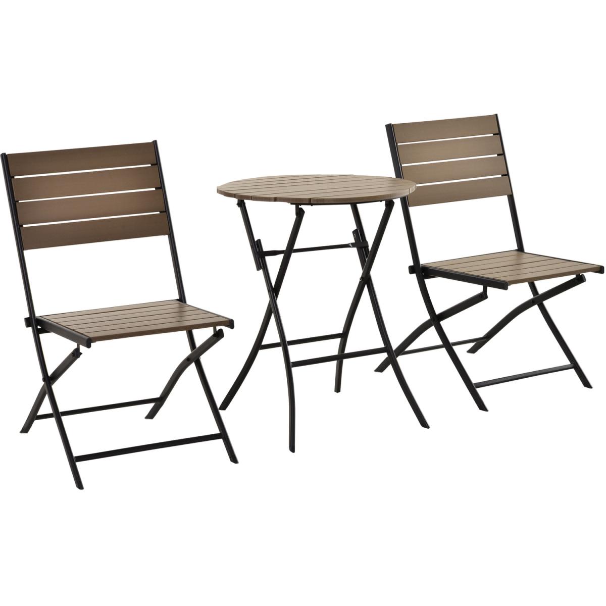 As easy as it is to bring out from storage, as it is to sit comfortably by yourself or with someone, this folding bistro set is the solution to areas with little space to spare. It's formed of three pieces - two chairs and a matching round table, each made with a steel frame for strength with a powder-coated to protect against rust, corrosion and light weather damage. Slatted all over, the wood-effect plastic tabletop, seat and back of the chairs give the set a natural look without the upkeep of wood to extend its lifespan. To use, simply unfold and go.