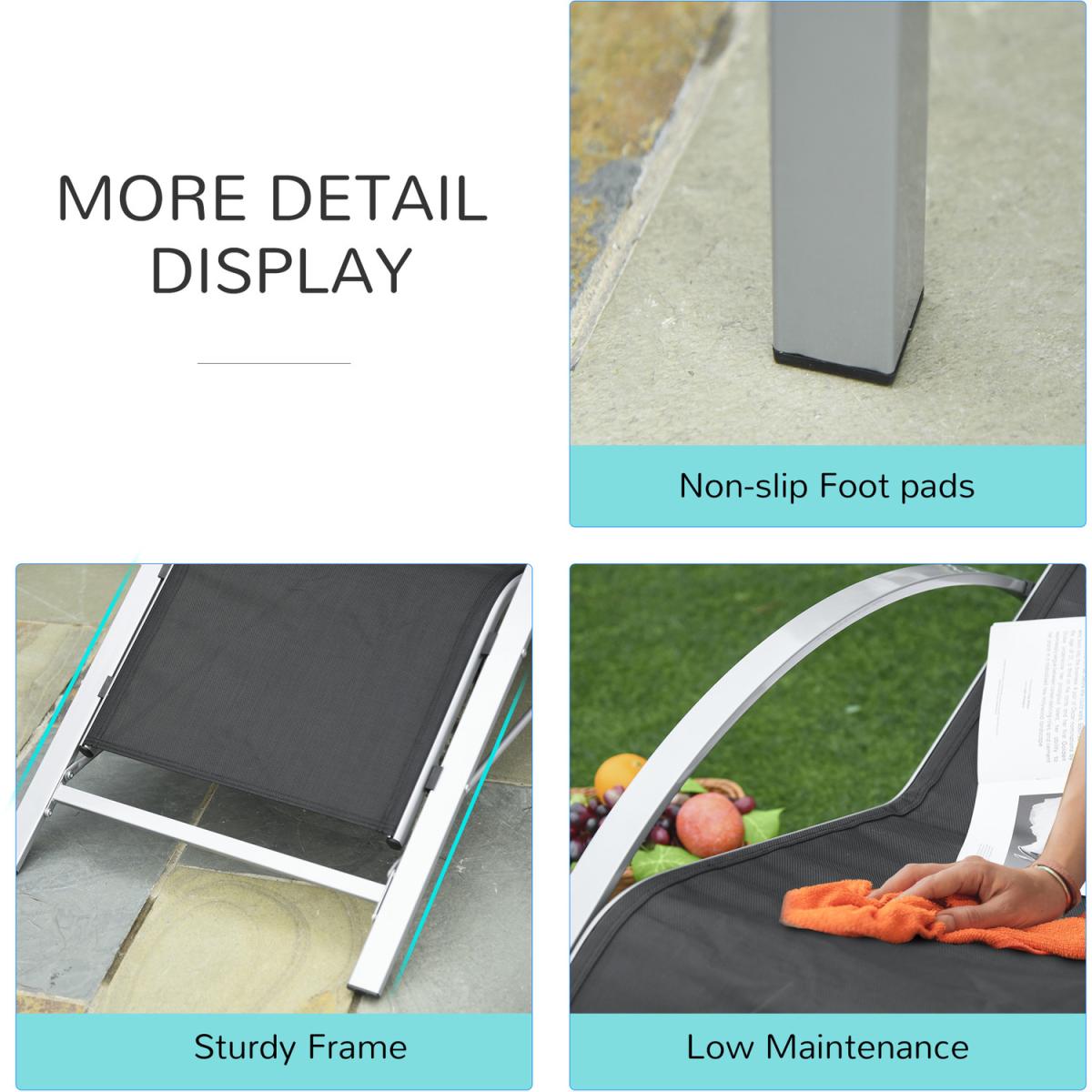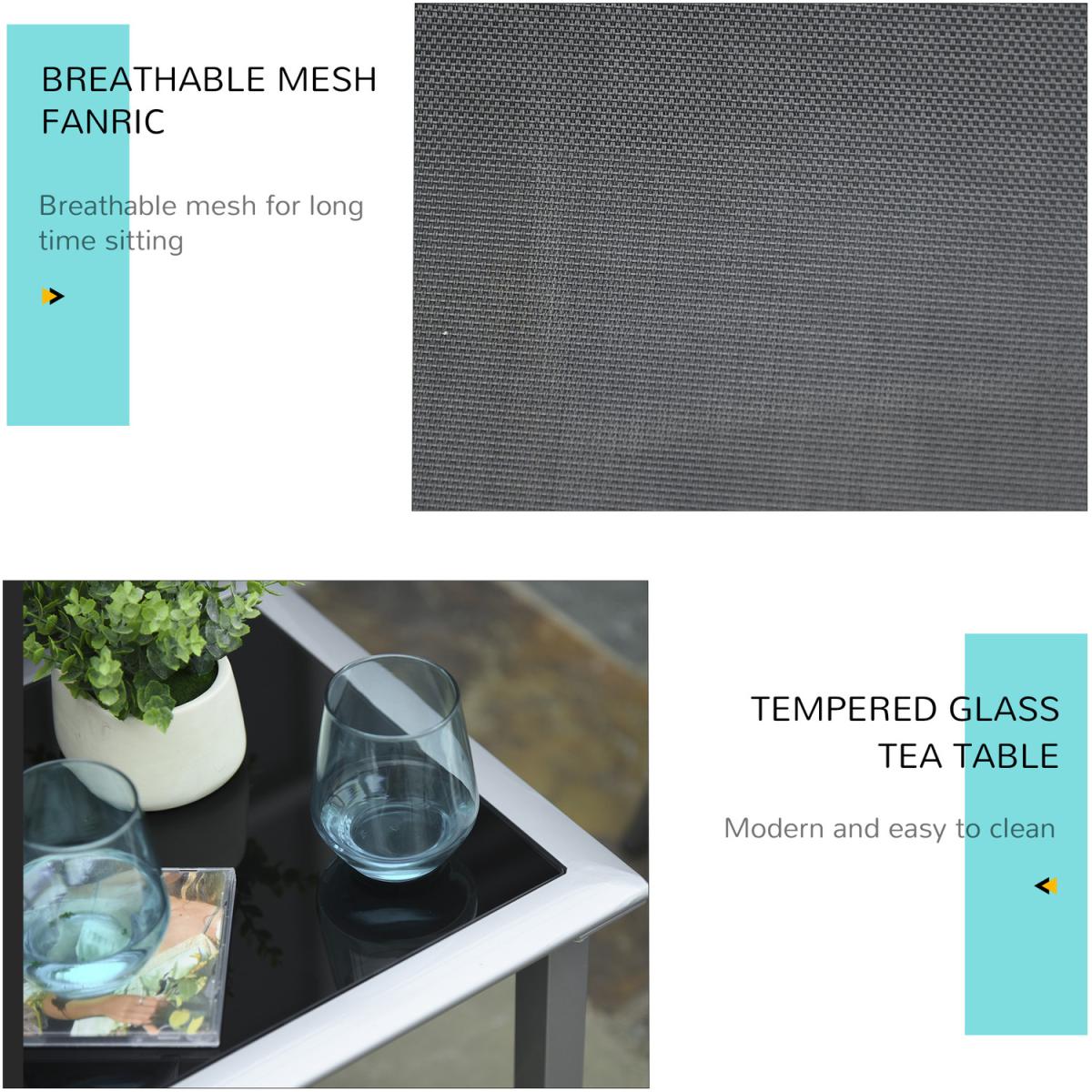 Refresh your outdoor space with this lounging set Outsunny. Using metal for the frame of both chairs and table, the structure is tough and durable so it can be used every day. The chairs are wrapped in breathable mesh for comfort and smoothness on the skin. The table comes with a thick glass top for a safe and secure holding place. Stylish and functional, this set is perfect for patios, gardens, balconies and any other outdoor space.