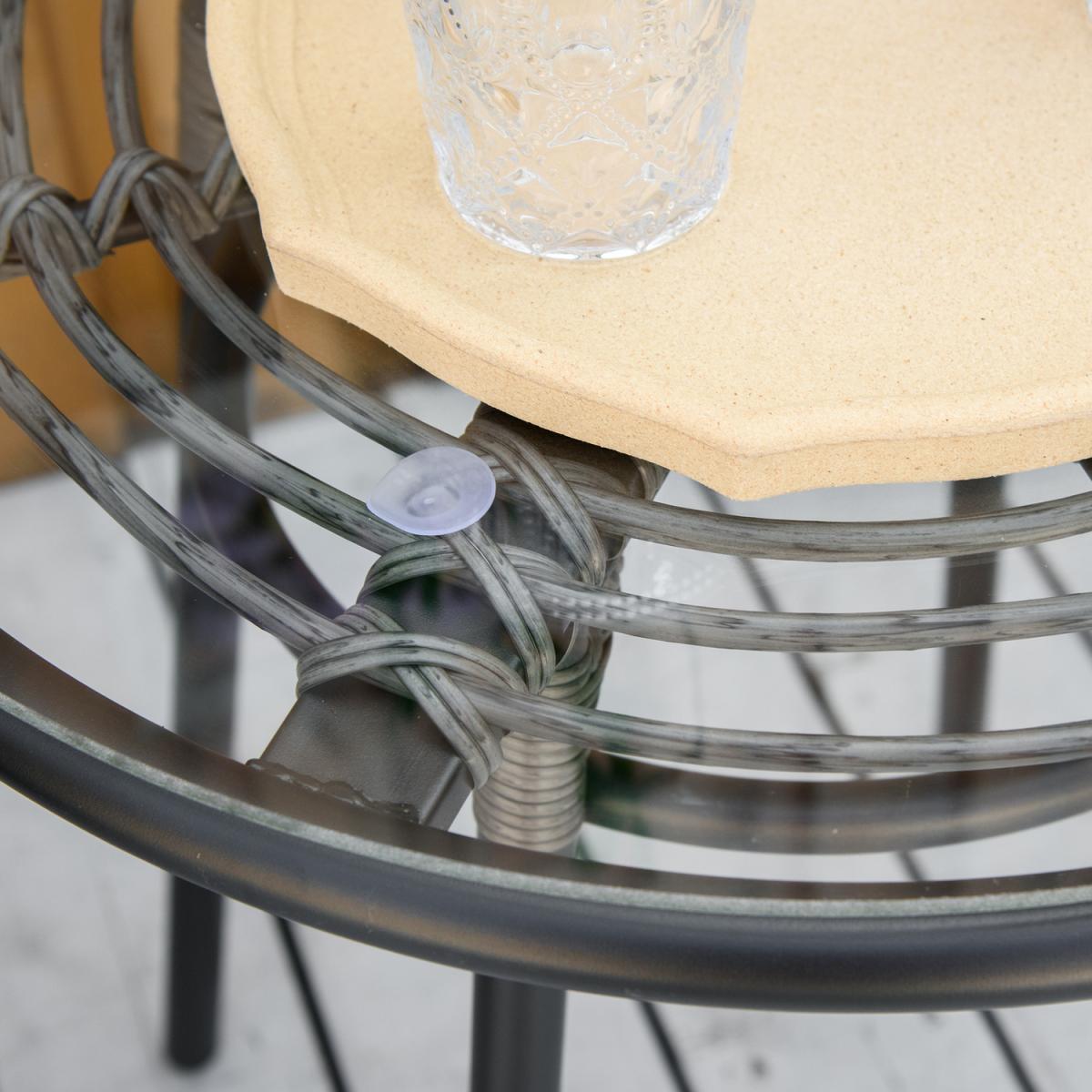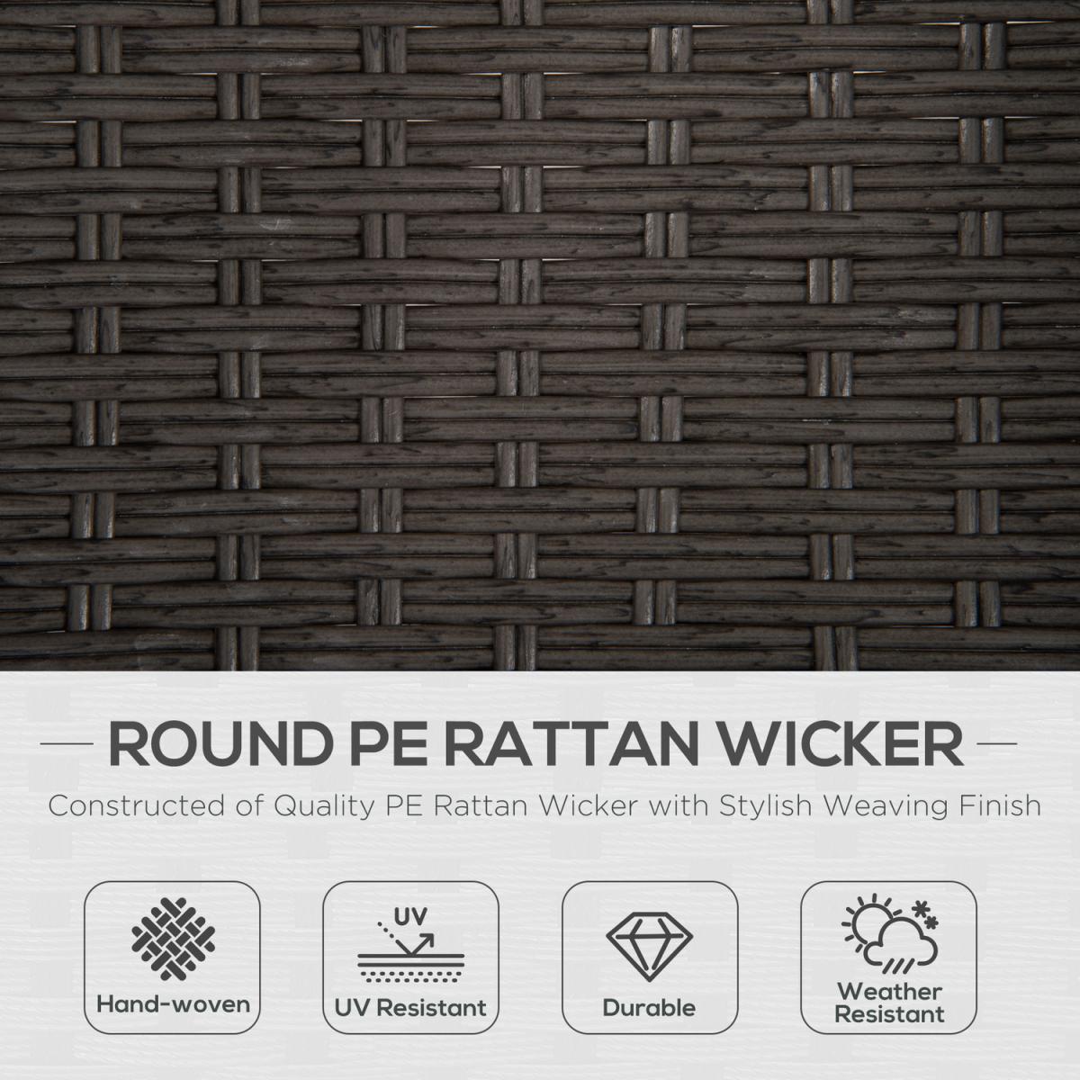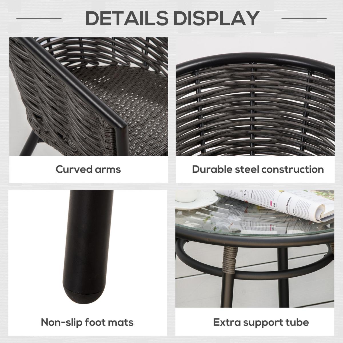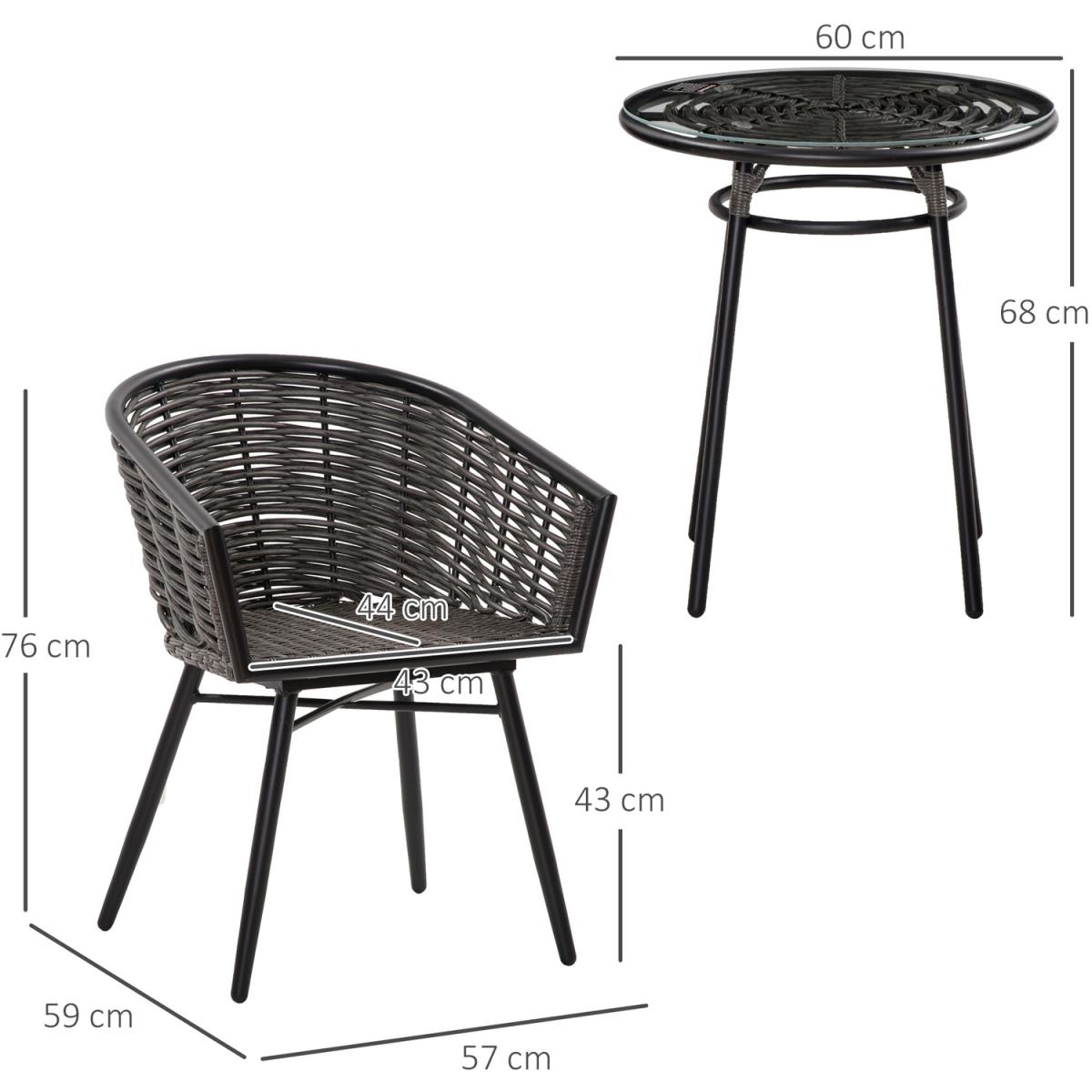 This 3 pieces patio resin wicker bistro set from Outsunny is a good choose for your interior and outdoor space. The set includes two ergonomically designed chairs and one round coffee table. Made of round PE rattan wicker and durable steel frame. The tempered glass tabletop allows easy cleaning with a damp cloth, this garden furniture sets for 2 offers reliable durability that naturally withstands most weather conditions. Let this bistro set from Outsunny brings you outdoor leisure time.