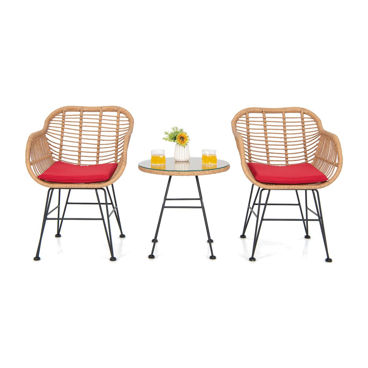 Are you looking for a patio bistro set for your backyard? This 3-piece wicker bistro set is a great choice for you. The weather-resistant PE rattan and durable powder-coated steel frame can stand the test of time, so that you can use it for years without worrying about deformation. Besides, the soft cushions with breathable fabric will relieve fatigue instantly. And the removable covers are easy to clean. The tempered glass tabletop offers ample space for your books and drinks, which also is smooth to clean. With a stylish appearance, this PE rattan chair and table set will be a perfect addition to your backyard, patio, balcony and so on.