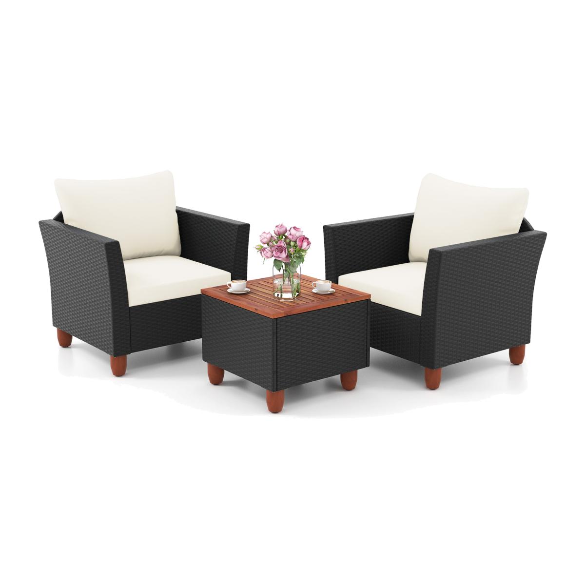 This outdoor conversation set includes 1 coffee table and 2 armchairs that exactly match the space of limited places, so you can place it on the porch or other small places. And the soft padded cushion can't wait to tell you how comfortable they are. What's more, the coffee table also can be used as a storage box to offer more storage space in limited places.