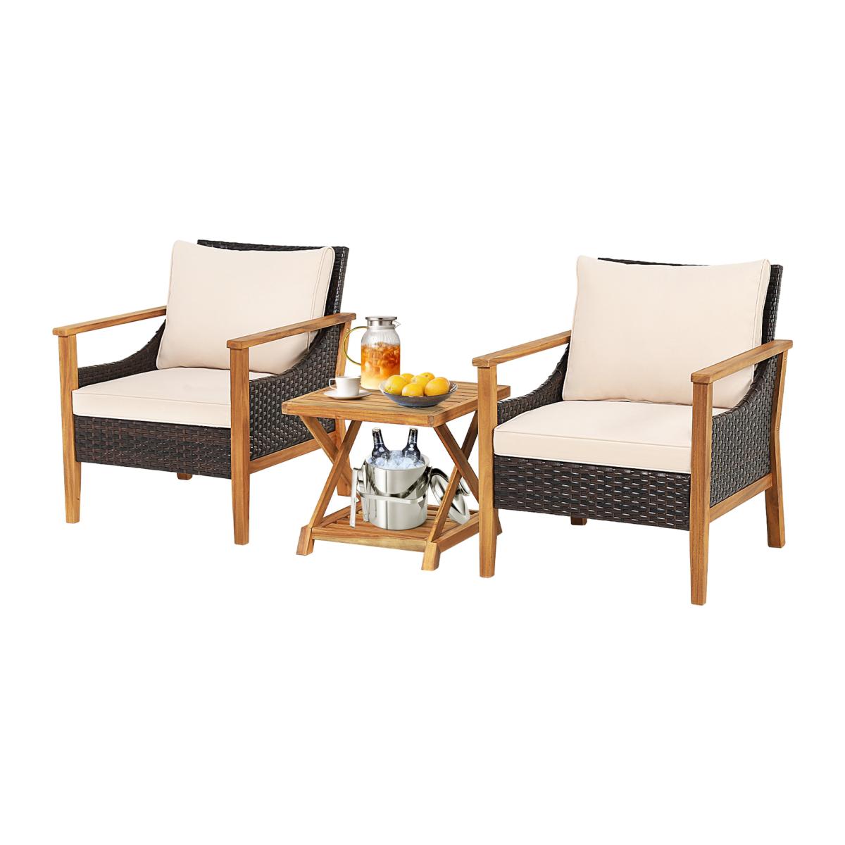 The ergonomic chair with curved backrest offers you much coziness. And the seat and back cushions highly improve the comfort level. Plus, the 2-tier side table allows you to easily fetch the items you want. All the three pieces are quite sturdy and durable with the premium material including premium acacia wood, hand-woven PE rattan and reinforced metal. And each chair can load up to 180kg. Apart from that, you can wash the cushion cover without effort, as it can be removed with the zipper design.