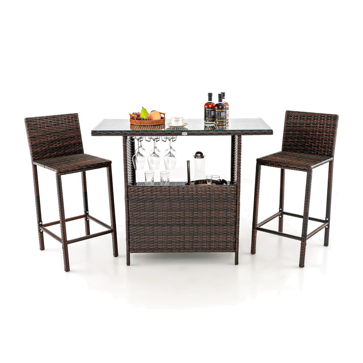 3 Pieces Patio Wicker Bar Chair and Table Set - Brown