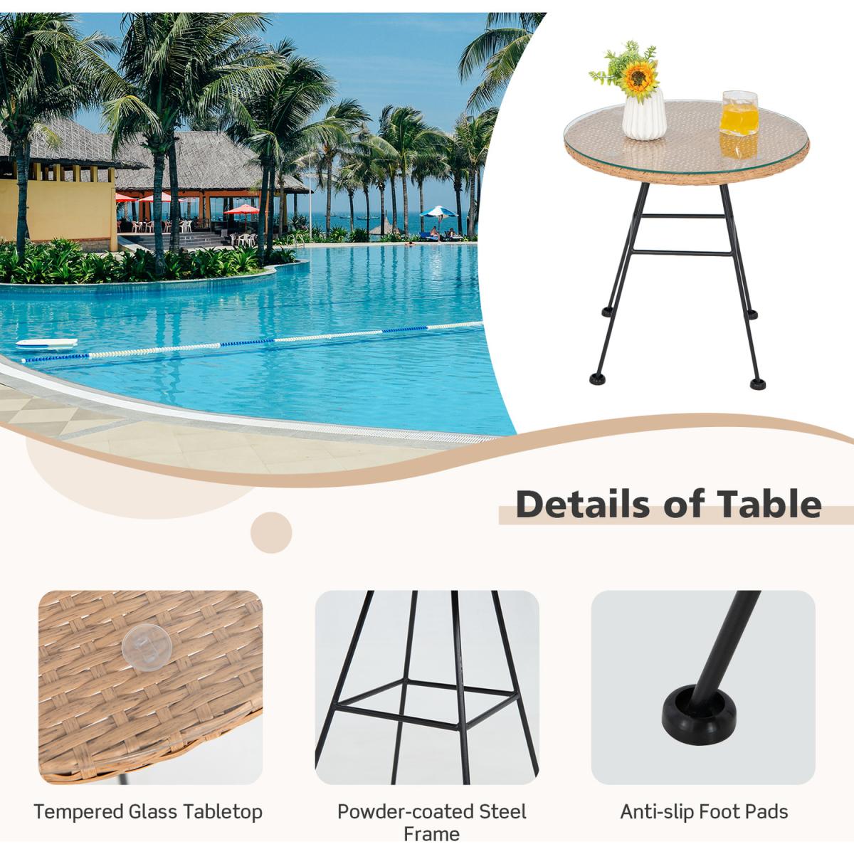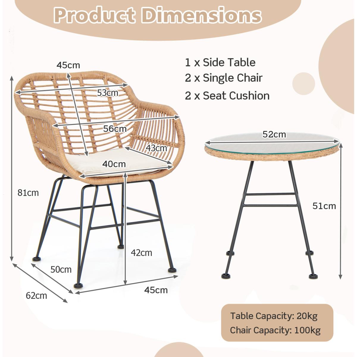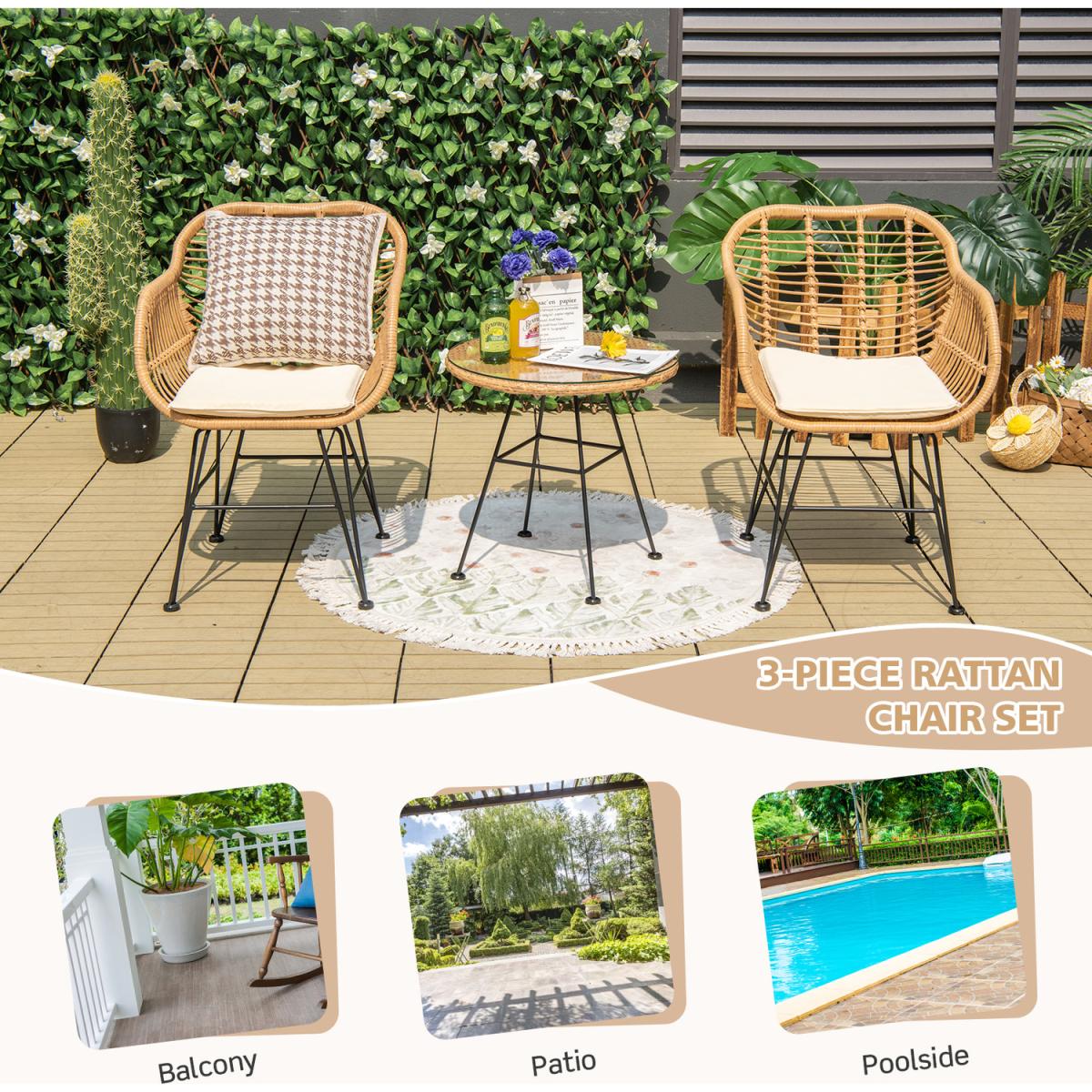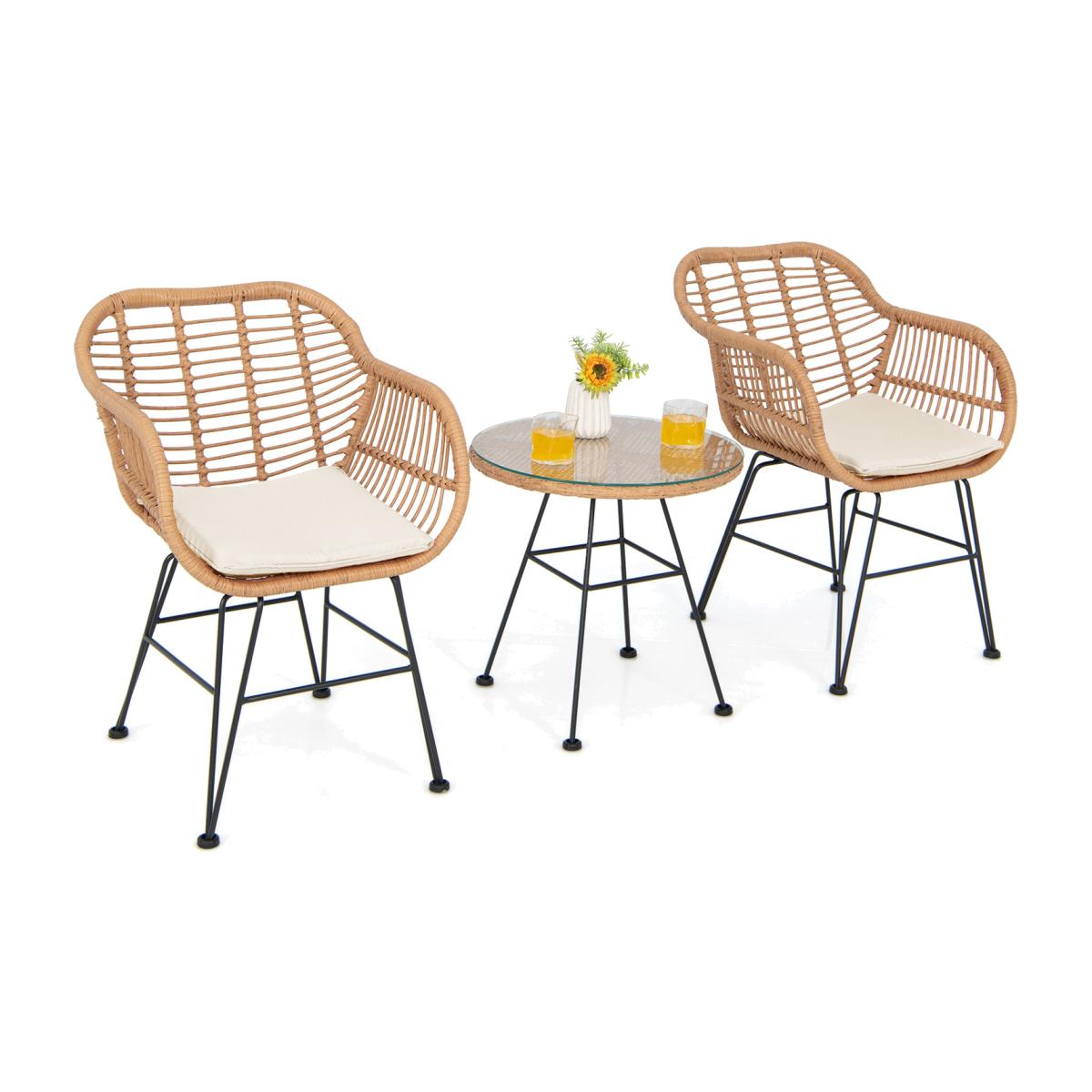Are you looking for a patio bistro set for your backyard? This 3-piece wicker bistro set is a great choice for you. The weather-resistant PE rattan and durable powder-coated steel frame can stand the test of time, so that you can use it for years without worrying about deformation. Besides, the soft cushions with breathable fabric will relieve fatigue instantly. And the removable covers are easy to clean. The tempered glass tabletop offers ample space for your books and drinks, which also is smooth to clean. With a stylish appearance, this PE rattan chair and table set will be a perfect addition to your backyard, patio, balcony and so on.