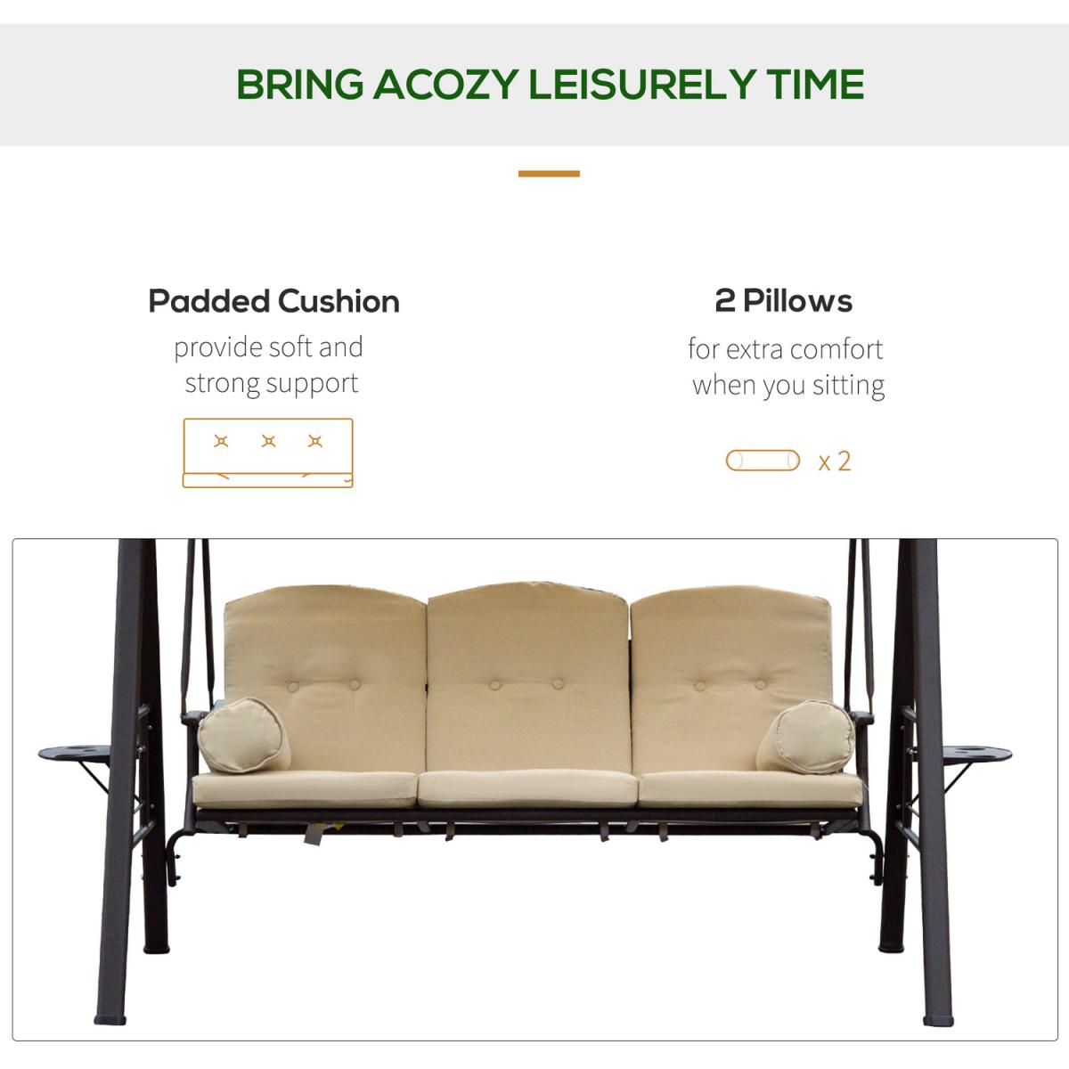 Outsunny is proud to present these stylish 3 seats swing chair. It features an arc-shaped canopy and a flower-shaped seat back for aesthetic beauty. The top canopy provides a sunshade for you while the storage trays on both sides make essentials within reach. There are 3 seats for your family and friends to swing together in maximum comfort thanks to padded cushions. Your patio, garden, deck, yard or lawn, wherever you place it, the eye-catching chair is designed to bring elegance to your outdoor living area.