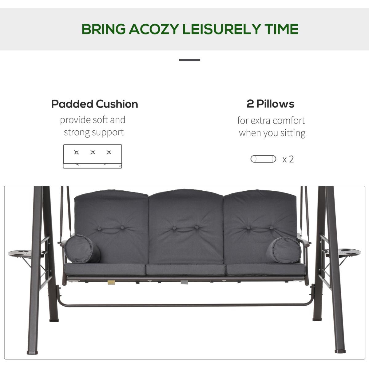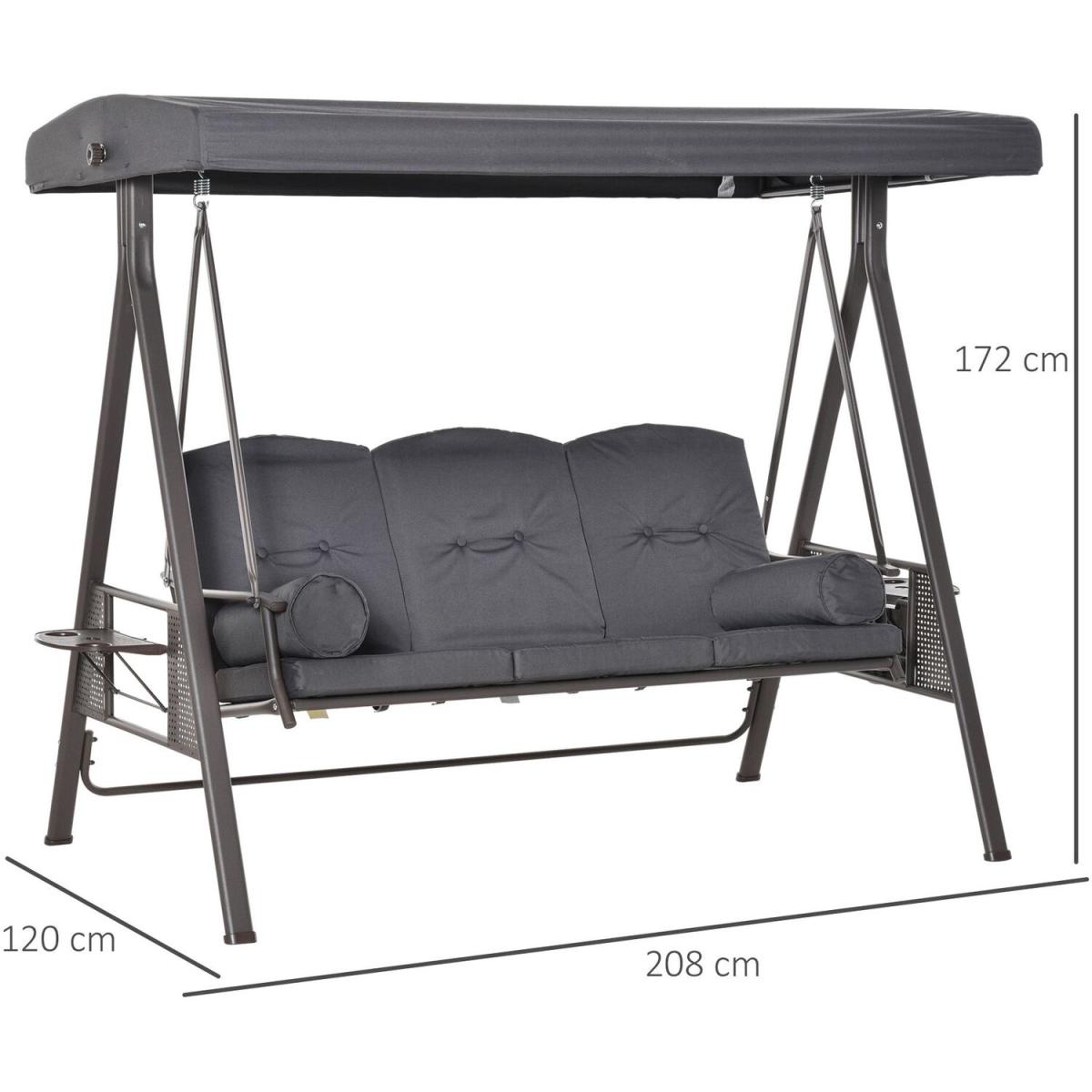Outsunny is proud to present these stylish 3 seats swing chair. It features an arc-shaped canopy and a flower-shaped seat back for aesthetic beauty. The top canopy provides a sunshade for you while the storage trays on both sides make essentials within reach. There are 3 seats for your family and friends to swing together in maximum comfort thanks to padded cushions. Your patio, garden, deck, yard or lawn, wherever you place it, the eye-catching chair is designed to bring elegance to your outdoor living area.