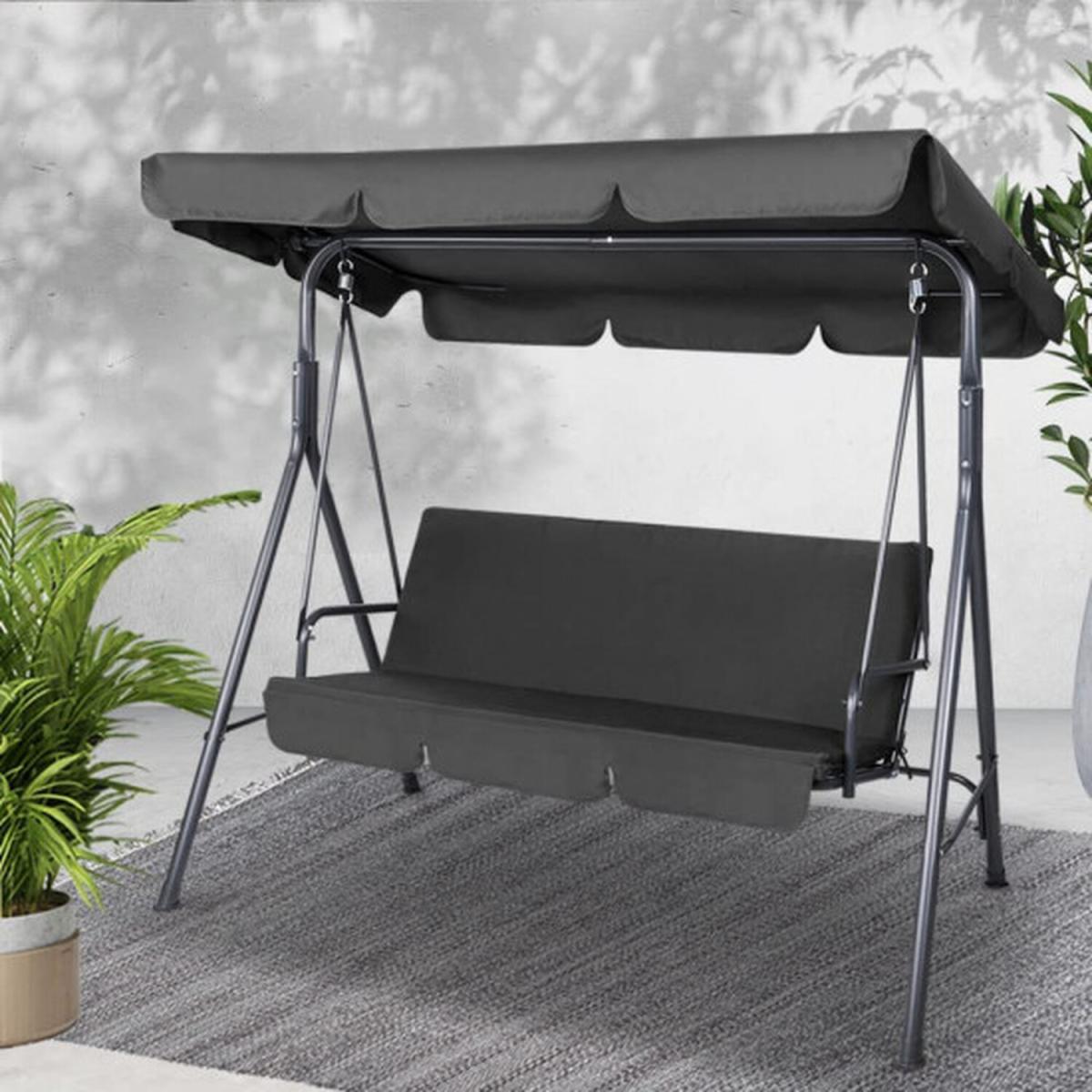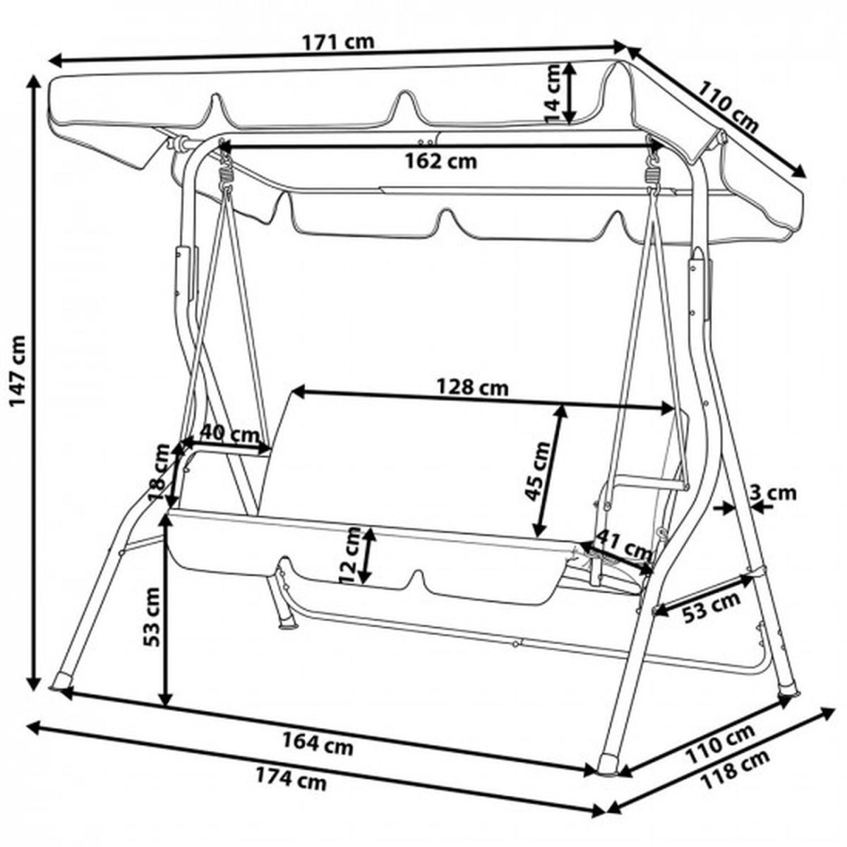 Get ready for the summer by grabbing yourself some bargain garden furniture and you wont be caught unaware when the sun comes out!This super-comfortable swing chair seats three people on its thick padded cushions, made from a combination of waterproof polyester, Oxford cloth and cotton. The swinging mechanism is made of high-quality steel pipe, and the adjustable canopy allows you to control how much sun or shade you are exposed to. It is so easy to set up on your lawn, decking, patio, or poolside, either in your front or back garden and look forward to rocking yourself to sleep on a lazy summer's day!Overall dimensions: L 175cm x W 110cm x H 155cm Seat dimensions: L 132cm x W 50cm x H 50cm Get a three-seater garden swing chair. With a comfortable seat and back cushion with thick padding. And an adjustable canopy angle to catch the sunshine and the shade. Made from steel pipe, waterproof polyester, Oxford cloth and cotton. A wonderful relaxation spot for your lawn, patio, decking or poolside.